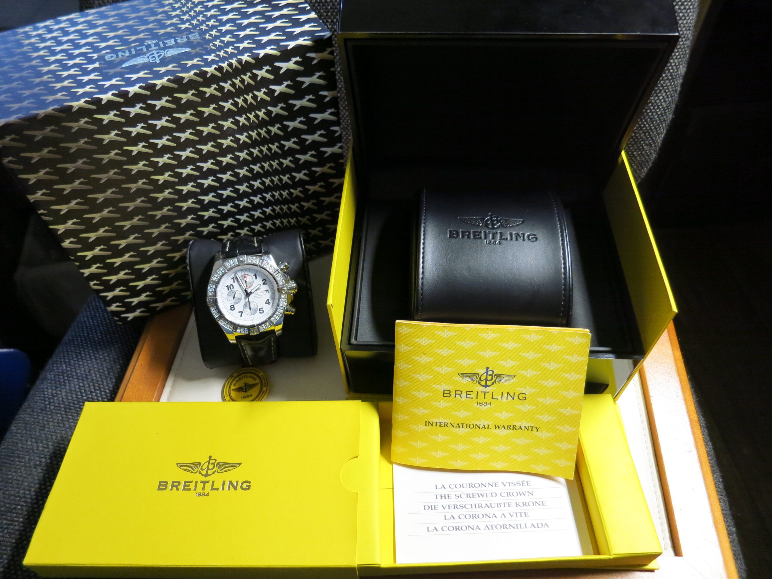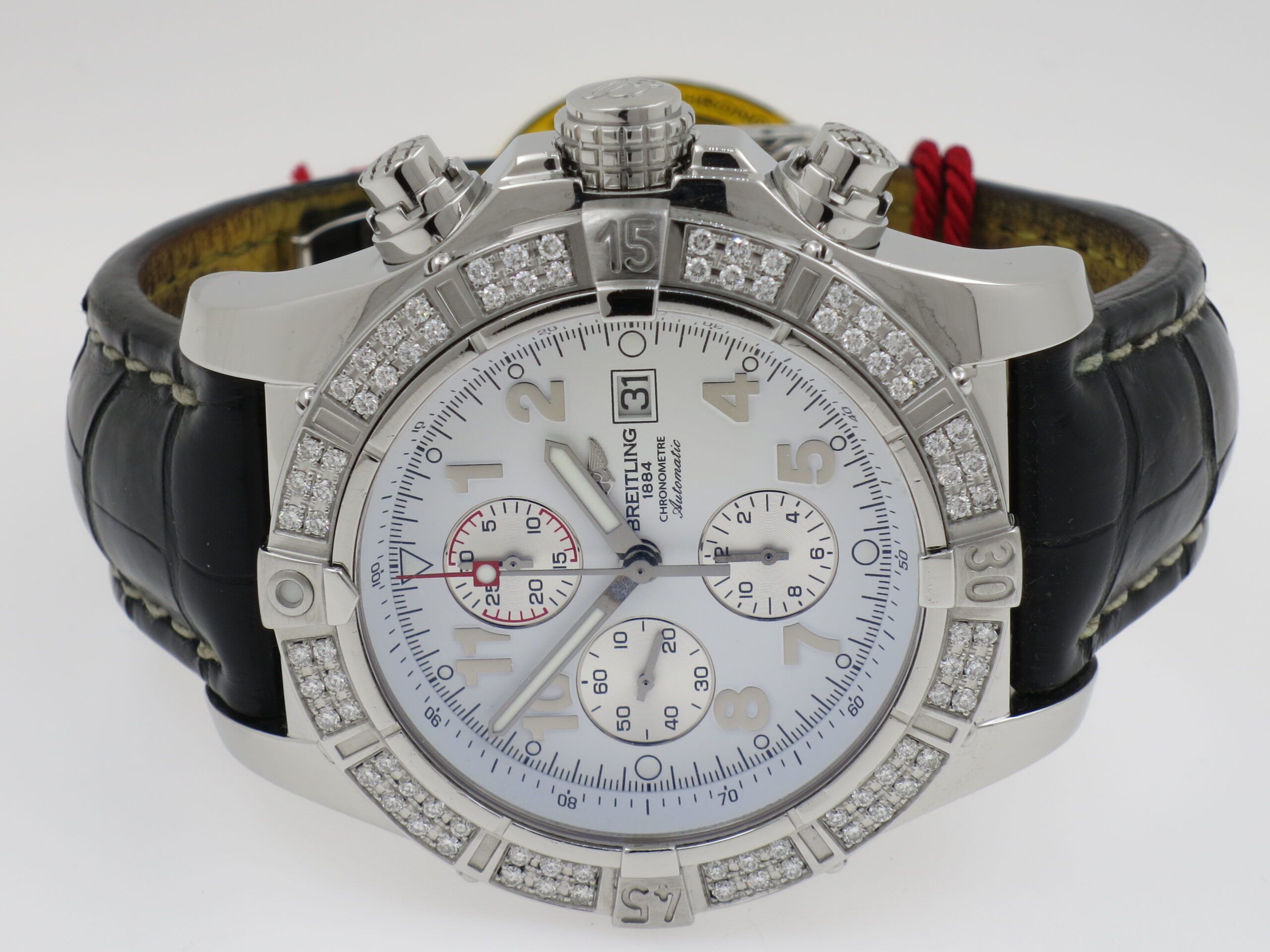 Breitling Super Avenger 48 Chronograph" After Market diamonds bezel 1,60crt.. Beautiful white dial in a 48 mm steel case with steel bezel. Shipping immediately upon receipt of payment. Our photos are NOT edited! What you see is what you get. Shipped registered and insured with Fedex Priority.