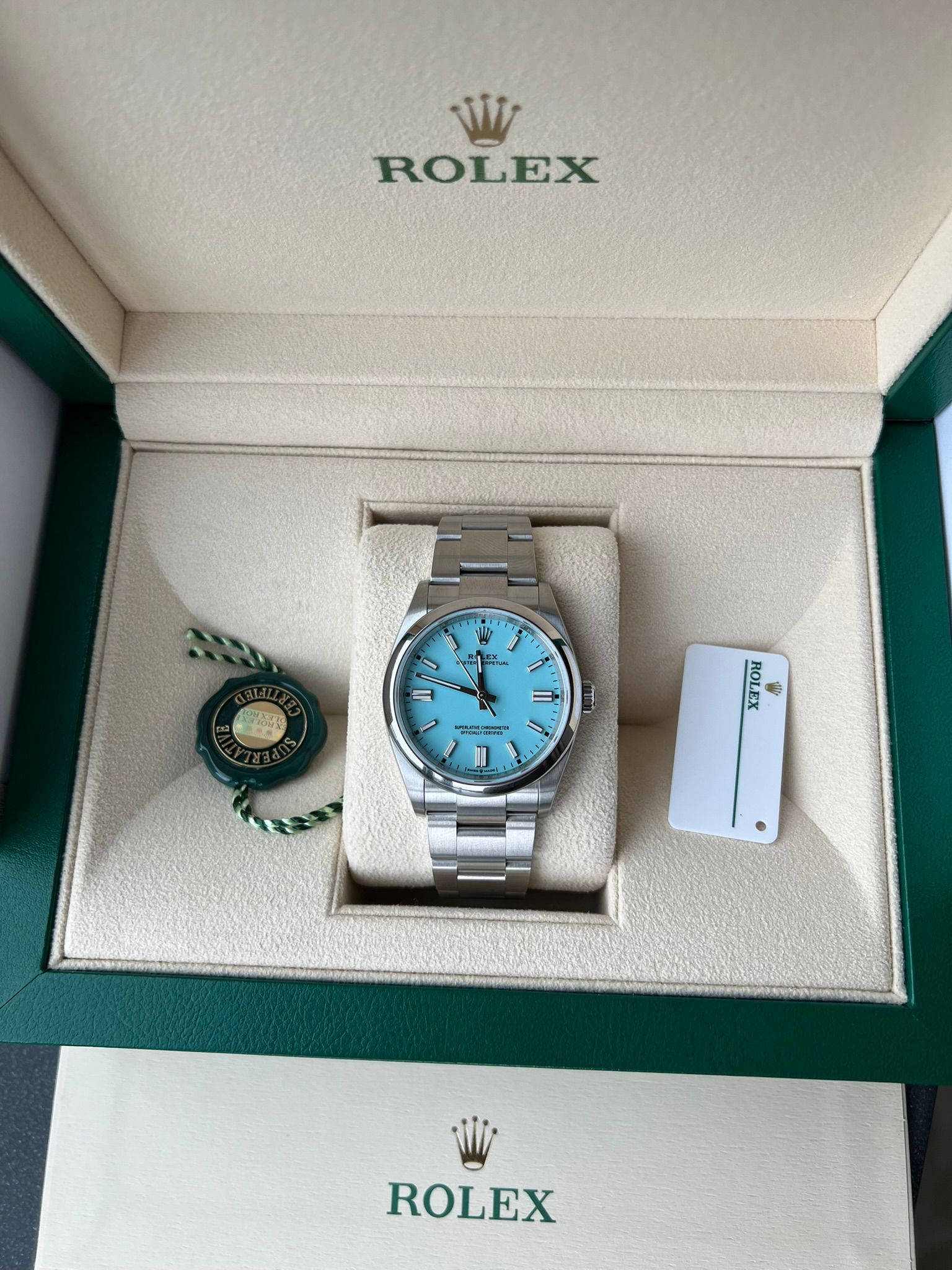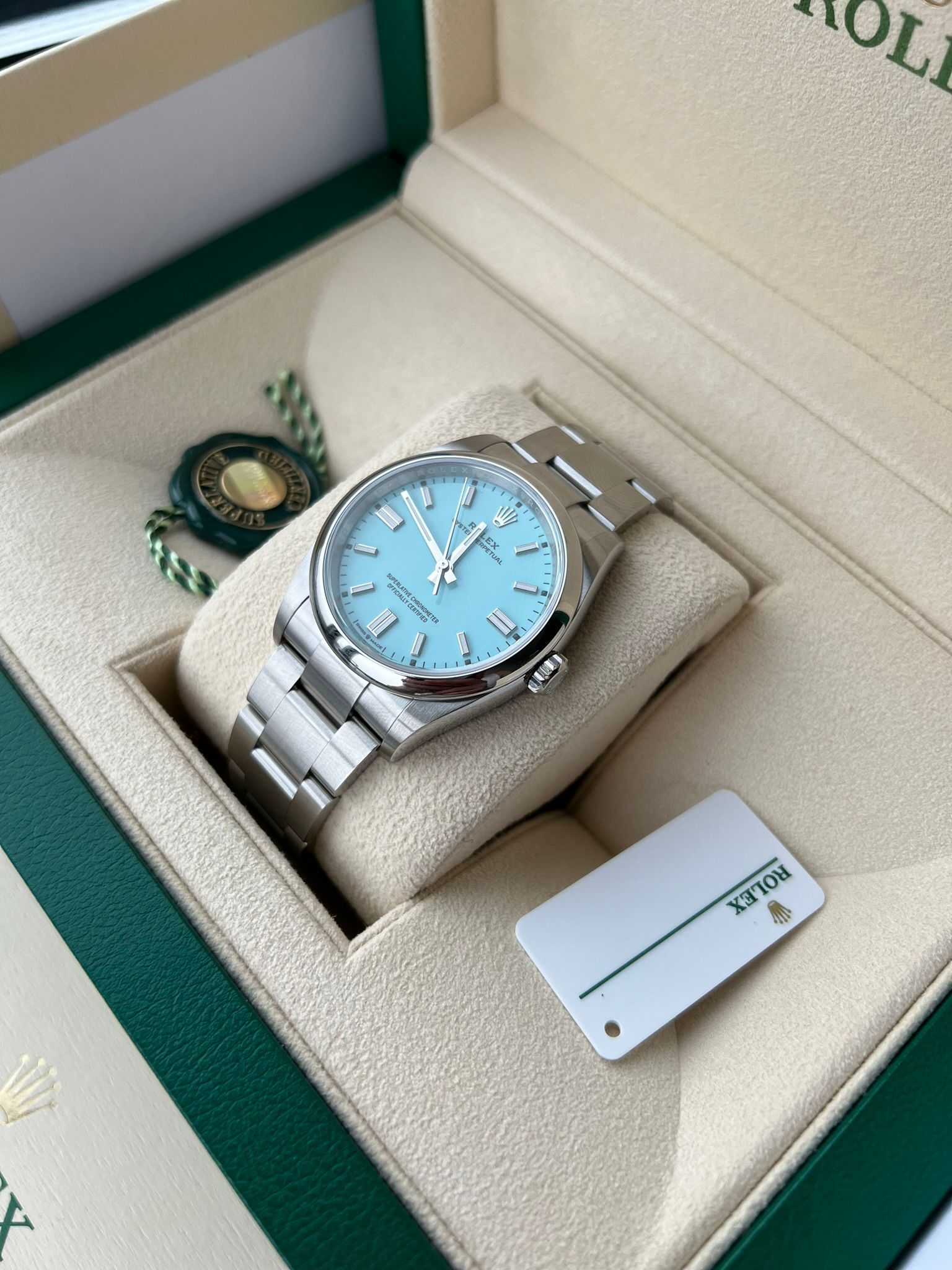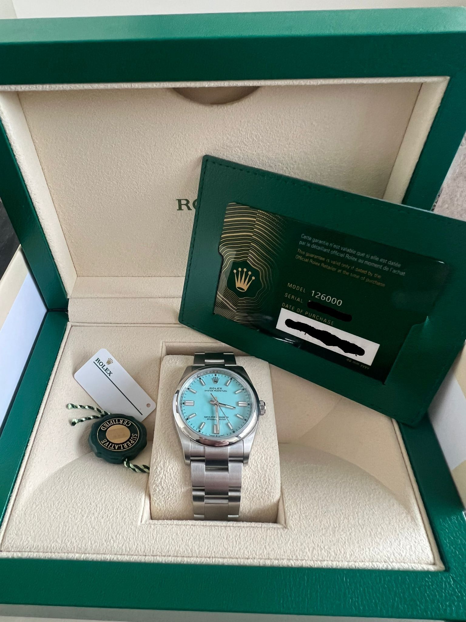 Rolex Oyster Perpetual 126000 – Tiffany Blue DialThe Rolex 126000 features a striking Tiffany Blue dial in a 36mm Oystersteel case. Pure Rolex design with timeless appeal. Highly sought-after.
