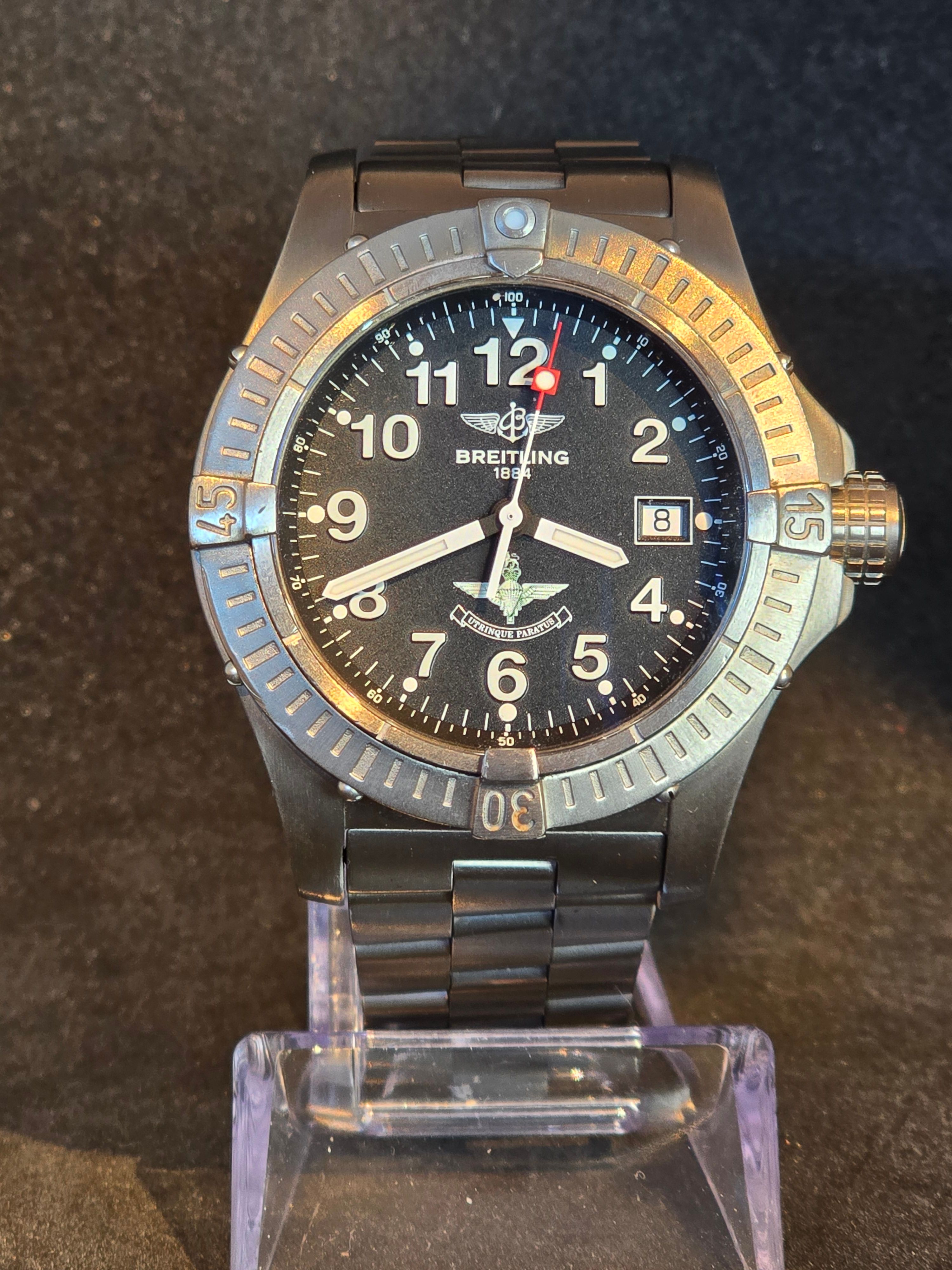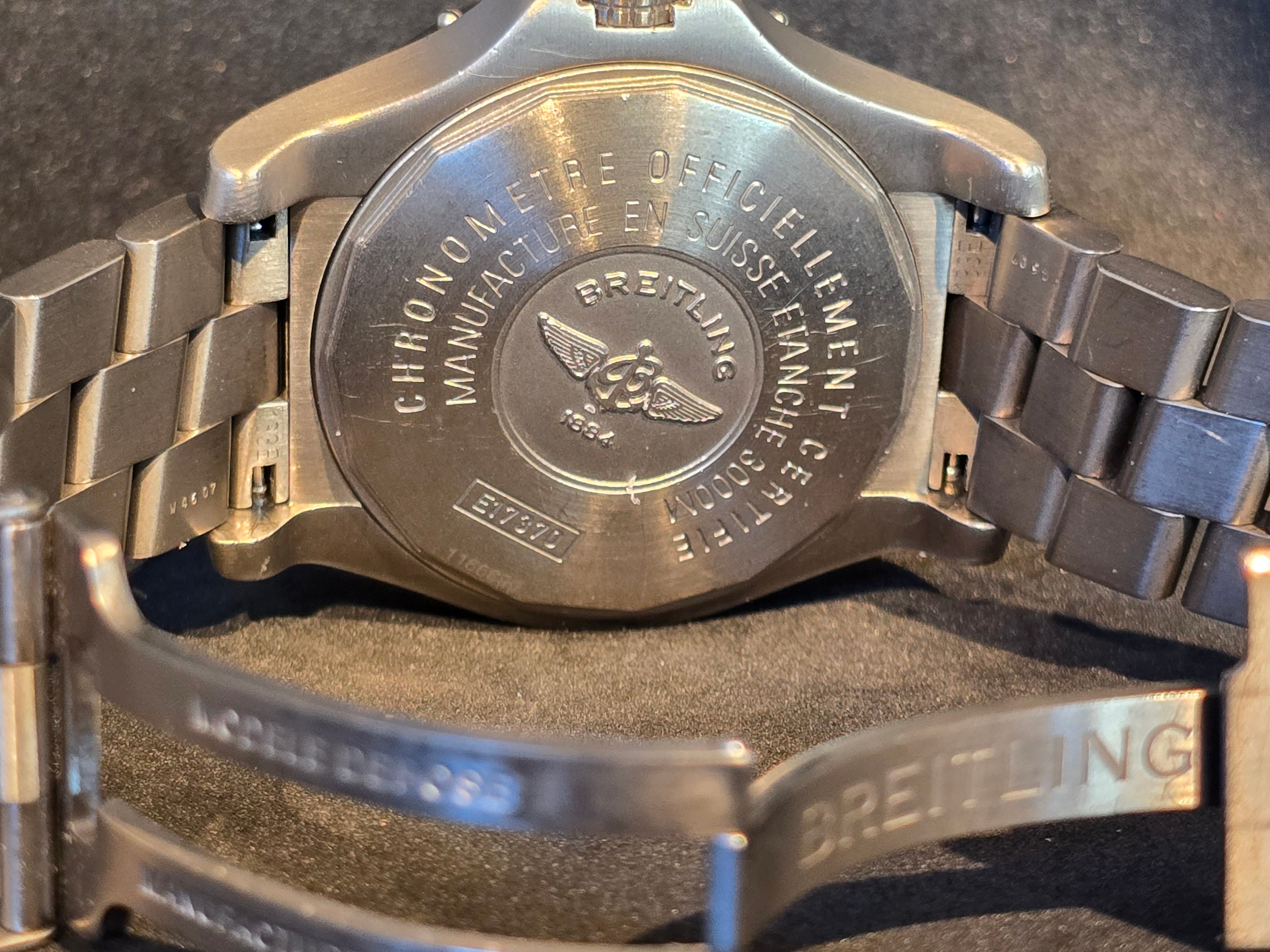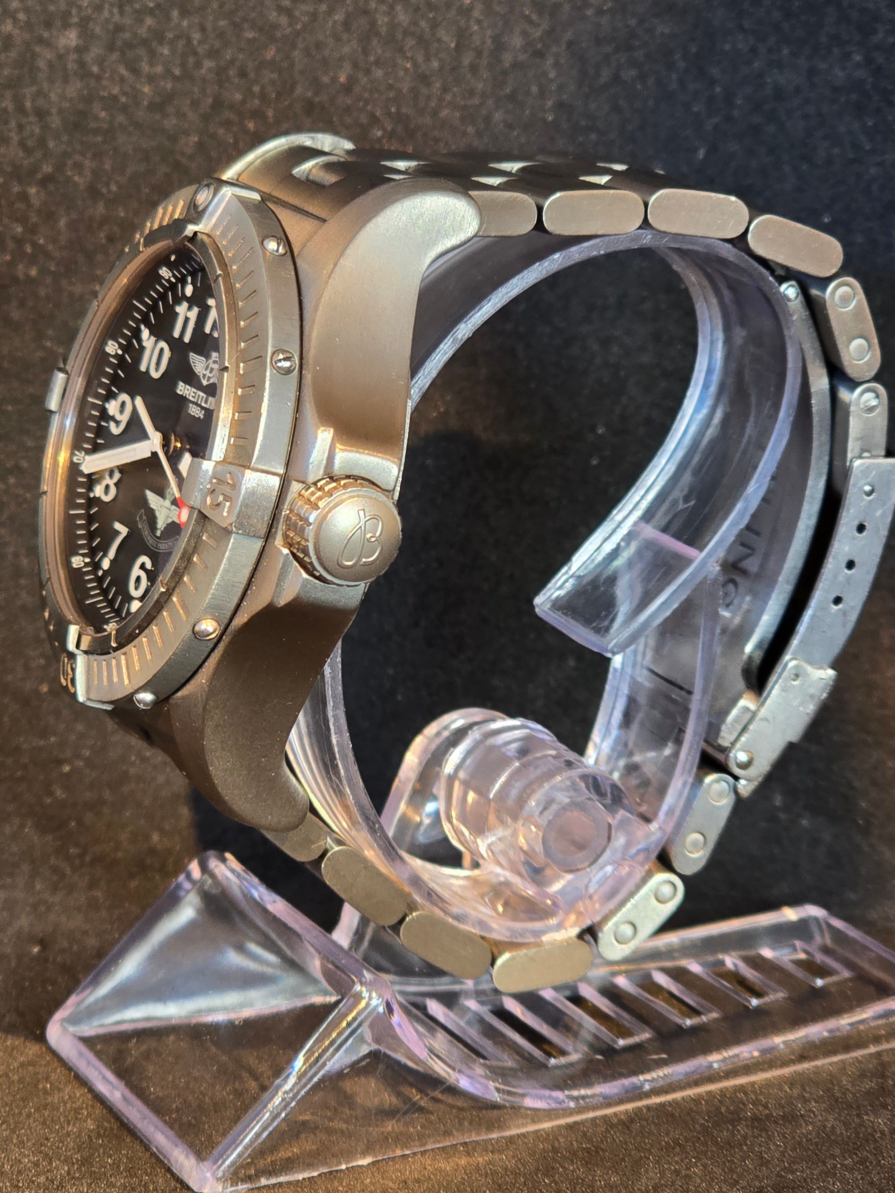 Built for extreme conditions, the Breitling Avenger Seawolf E17370 is a professional-grade dive watch engineered to perform under immense pressure. With a remarkable water resistance of 3,000 meters (10,000 feet), it’s one of the most robust mechanical dive watches ever produced by Breitling.Crafted from lightweight titanium, the 44mm case offers strength and wearability without compromising durability. The matte finish enhances its tool-watch appearance, while the unidirectional rotating bezel, large screw-down crown, and integrated helium escape valve underscore its serious diving credentials.