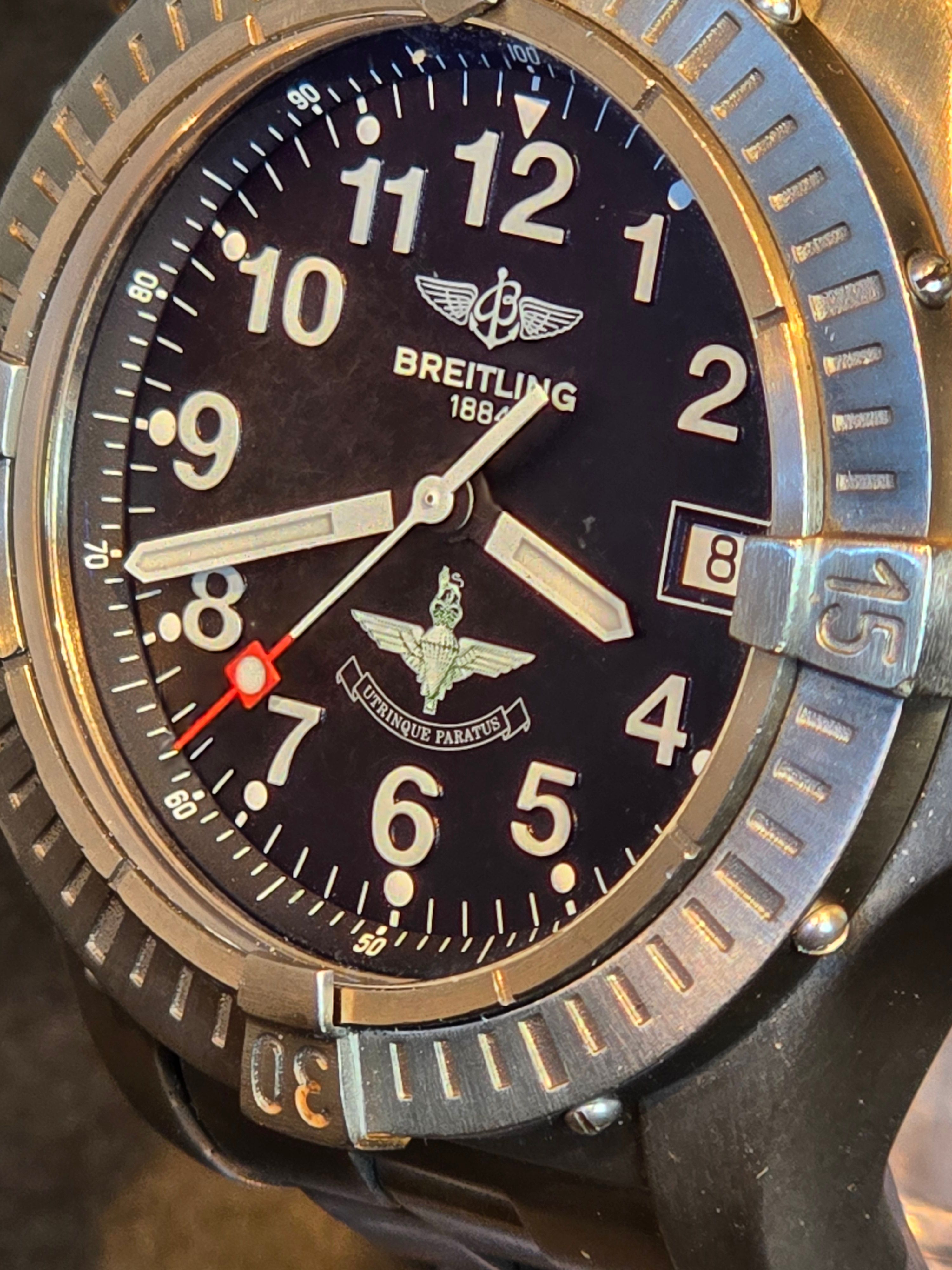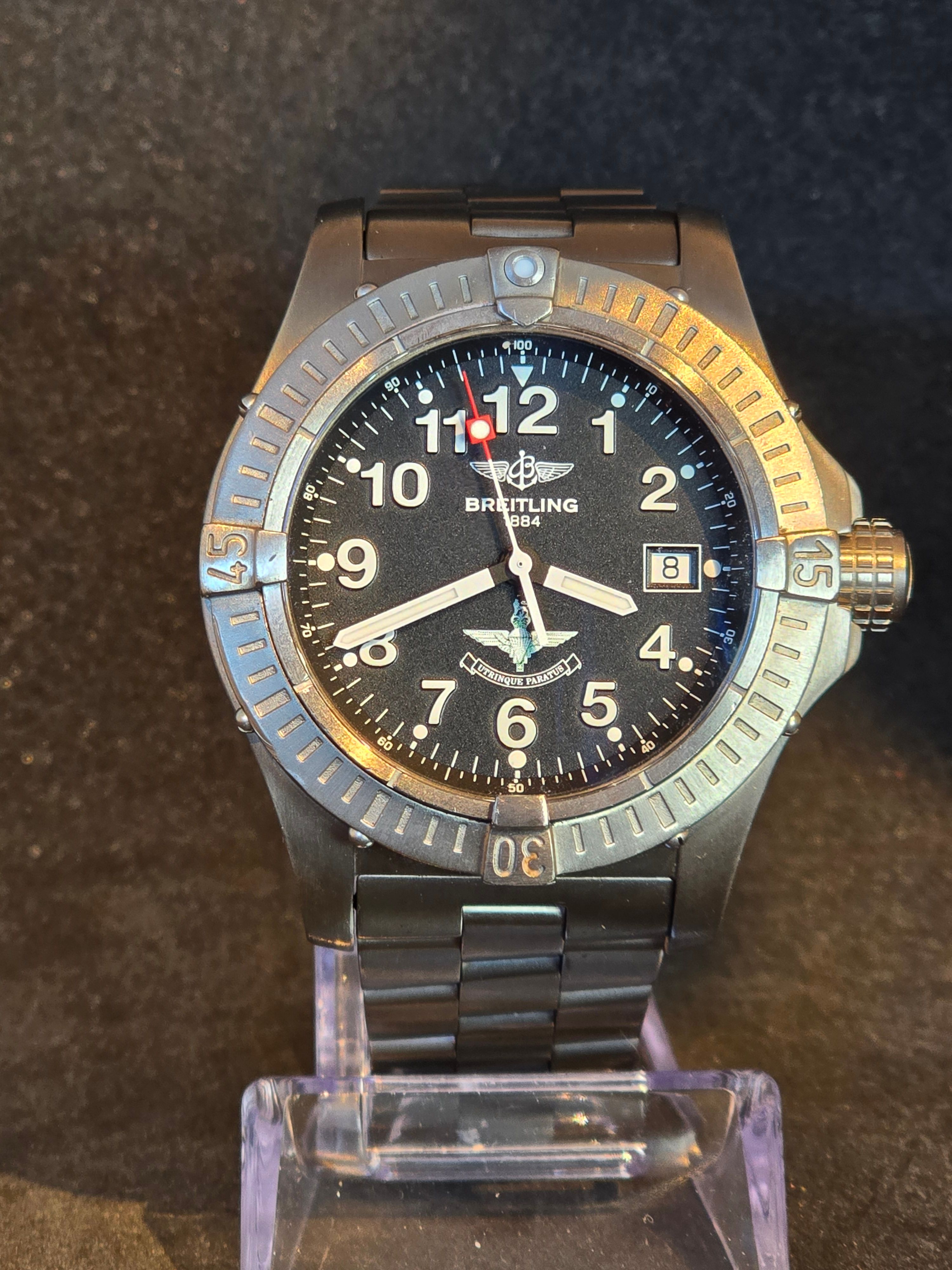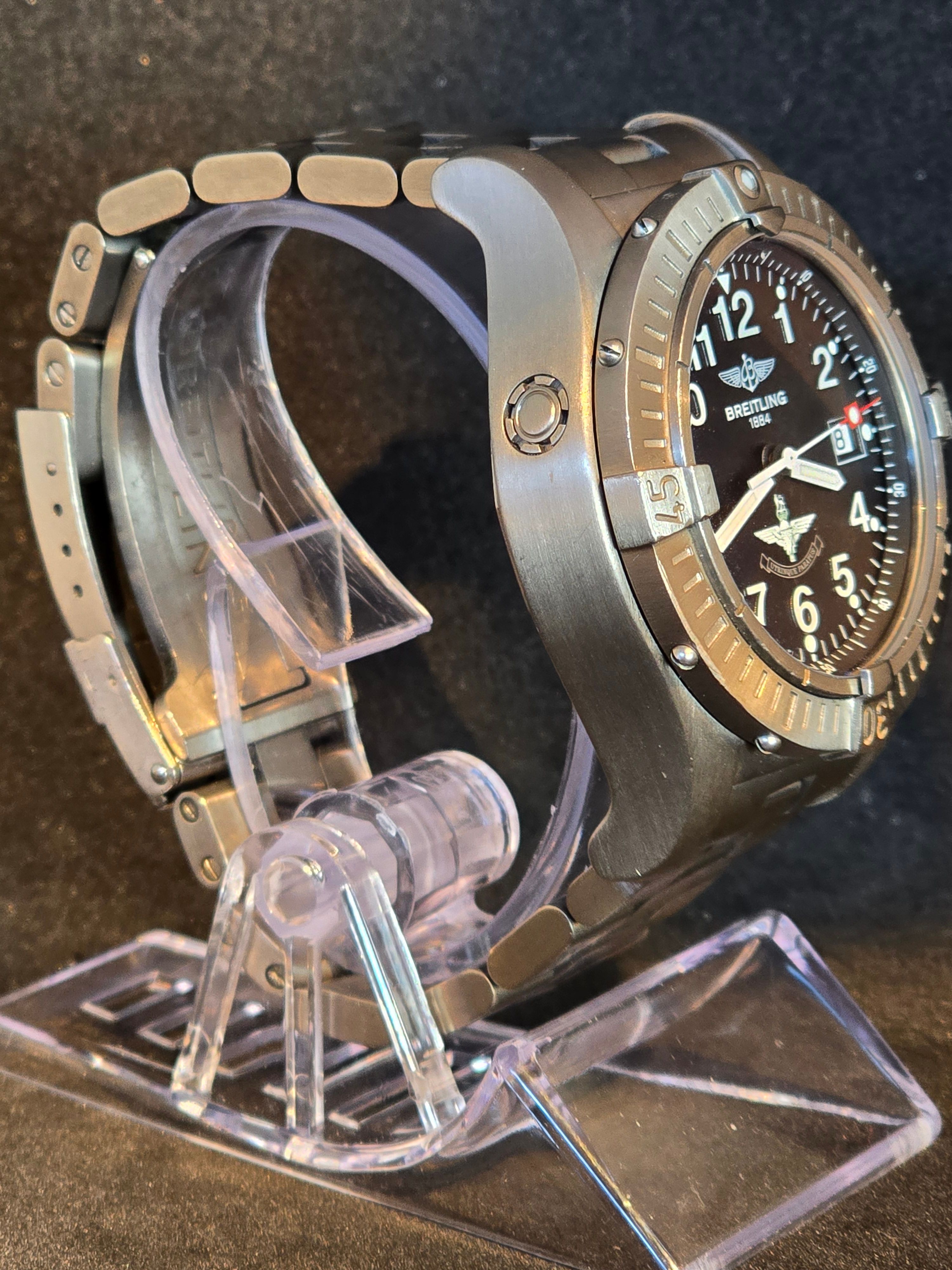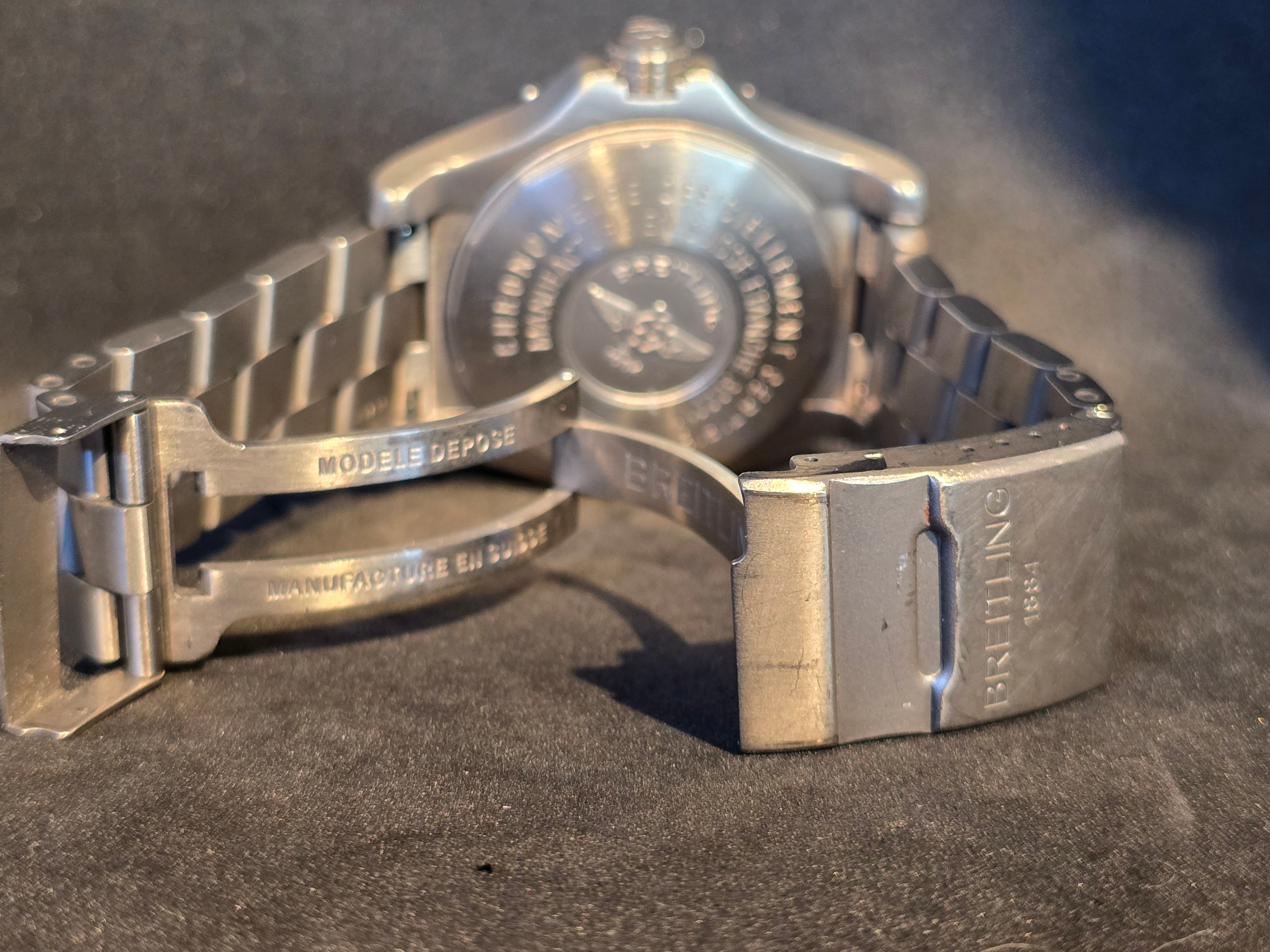 Built for extreme conditions, the Breitling Avenger Seawolf E17370 is a professional-grade dive watch engineered to perform under immense pressure. With a remarkable water resistance of 3,000 meters (10,000 feet), it’s one of the most robust mechanical dive watches ever produced by Breitling.Crafted from lightweight titanium, the 44mm case offers strength and wearability without compromising durability. The matte finish enhances its tool-watch appearance, while the unidirectional rotating bezel, large screw-down crown, and integrated helium escape valve underscore its serious diving credentials.