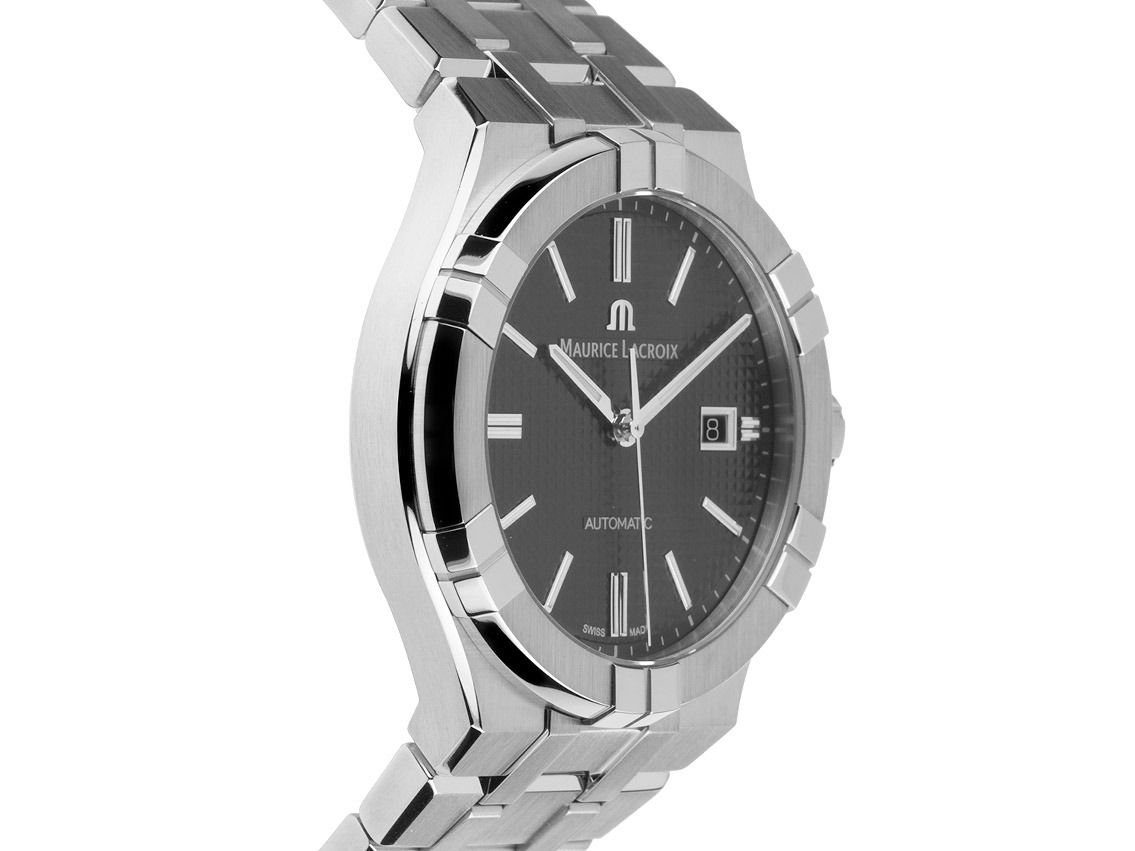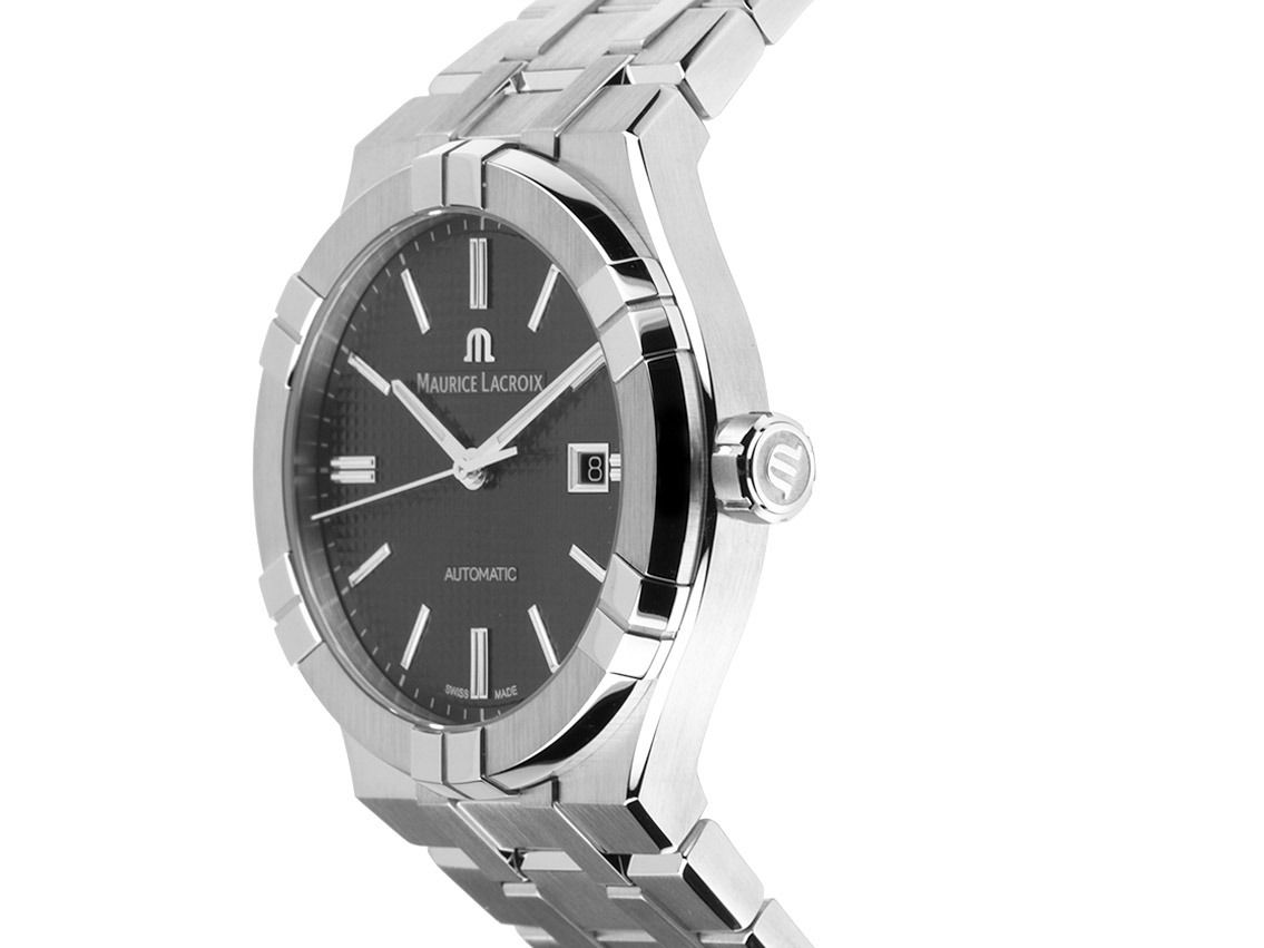 Gehäuse Edelstahl satiniert, Gehäusedurchmesser ohne Krone 42mm, Gehäusehöhe 11,0mm. Lünette Edelstahl satiniert mit polierten Reitern. Bracciale Edelstahl satinato, Doppelsicherheitsfaltschließe Edelstahl con logo dell'azienda. Zifferblatt nero con Waffelmuster, Leuchtindexen aufgesetzten e Leuchtzeigern polierten. Uhrwerk Automatik, Kaliber Maurice Lacroix ML115 mit 26 Edelsteinen, Gangreserve ca. 38 Stunden. Anzeige von Stunde, Minute und Sekunde über Zeiger aus der Mitte mit Sekundenstopp zur sekundengenauen Einstellung der Uhrzeit, Datumsanzeige mit Schnellverstellung bei 3 Uhr. Saphirglas kratzfest. Krone verschraubbar mit Hersteller-Logo. Corpo in Edelstahl 7-fach ricoperto di fibre e con un filtro in Saphirglas. Peso dell'orologio con bracciale incluso 175 g, lunghezza del bracciale con bracciale incluso. Gehäuse 210mm. Wasserdicht bis 20 ATM. Numero di riferimento: AI6008-SS002-330-1, ID: ST197526780425H-2250, Artikelnummer: 10000080049. Scatola originale Maurice Lacroix con cartone e garanzia, set completo. Neu.