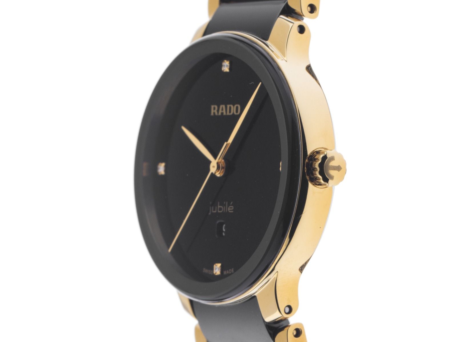 Gehäuse Edelstahl gelbgold PVD beschichtet und poliert, Gehäusedurchmesser ohne Krone 30mm, Gehäusehöhe 9,0mm. Fascia da braccio Edelstahl / gelbgold PVD beschichtet / Keramik poliert, Doppelfaltschließe verdeckte Titan / Edelstahl / gelbgold PVD beschichtet mit Hersteller-Logo. Zifferblatt nero con 4 indici Diamant aufgesetzten e Zeigern gelbgolden polierten. Uhrwerk quarzgesteuert. Anzeige von Stunde, Minute und Sekunde über Zeiger aus Mitte mit Sekundenstopp zur sekundengenauen Einstellung der Uhrzeit, Datumsanzeige mit Schnellverstellung bei 6 Uhr. Saphirglas kratzfest. Krone geriffelt mit Hersteller-Logo. Corpo Edelstahl graveert. Peso dell'orologio con bracciale 77g, lunghezza del bracciale con gehäuse 195mm. Numero di riferimento: R30025712, ID: KSTB150625200525RE-2100, Artikelnummer: 10000080436. Scatola originale Rado con cartone e garanzia e descrizione, set completo. Non usato. Consegna immediata.