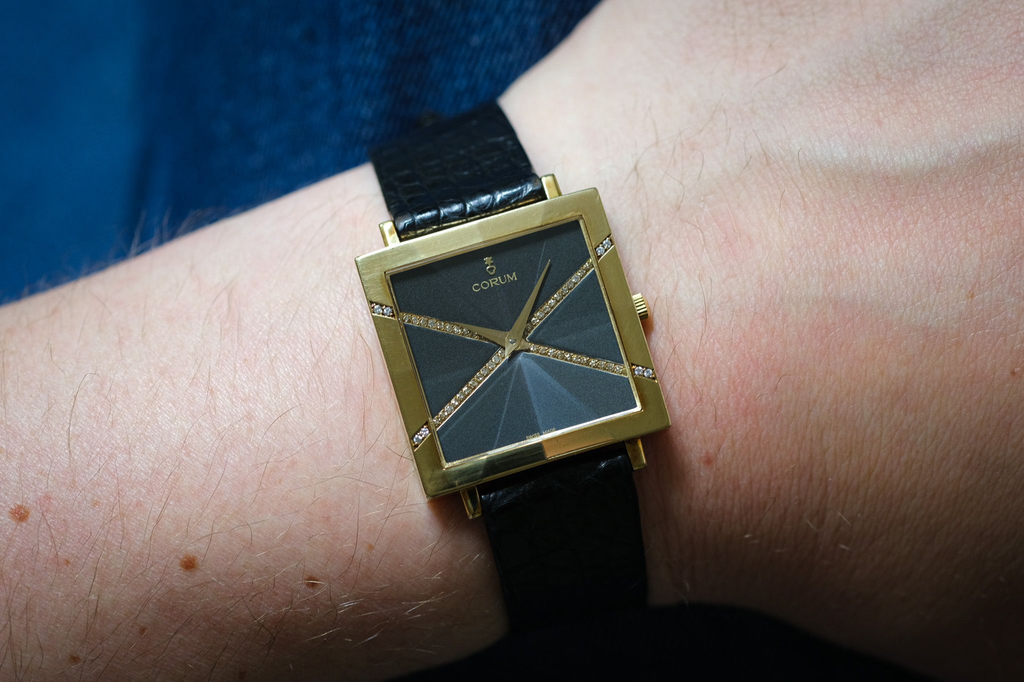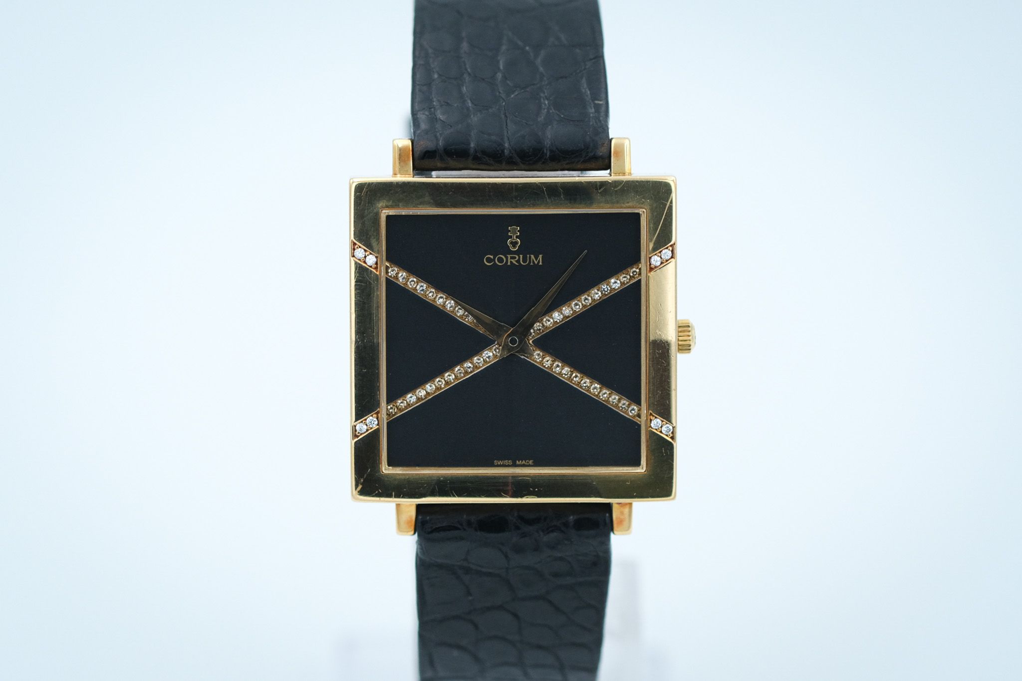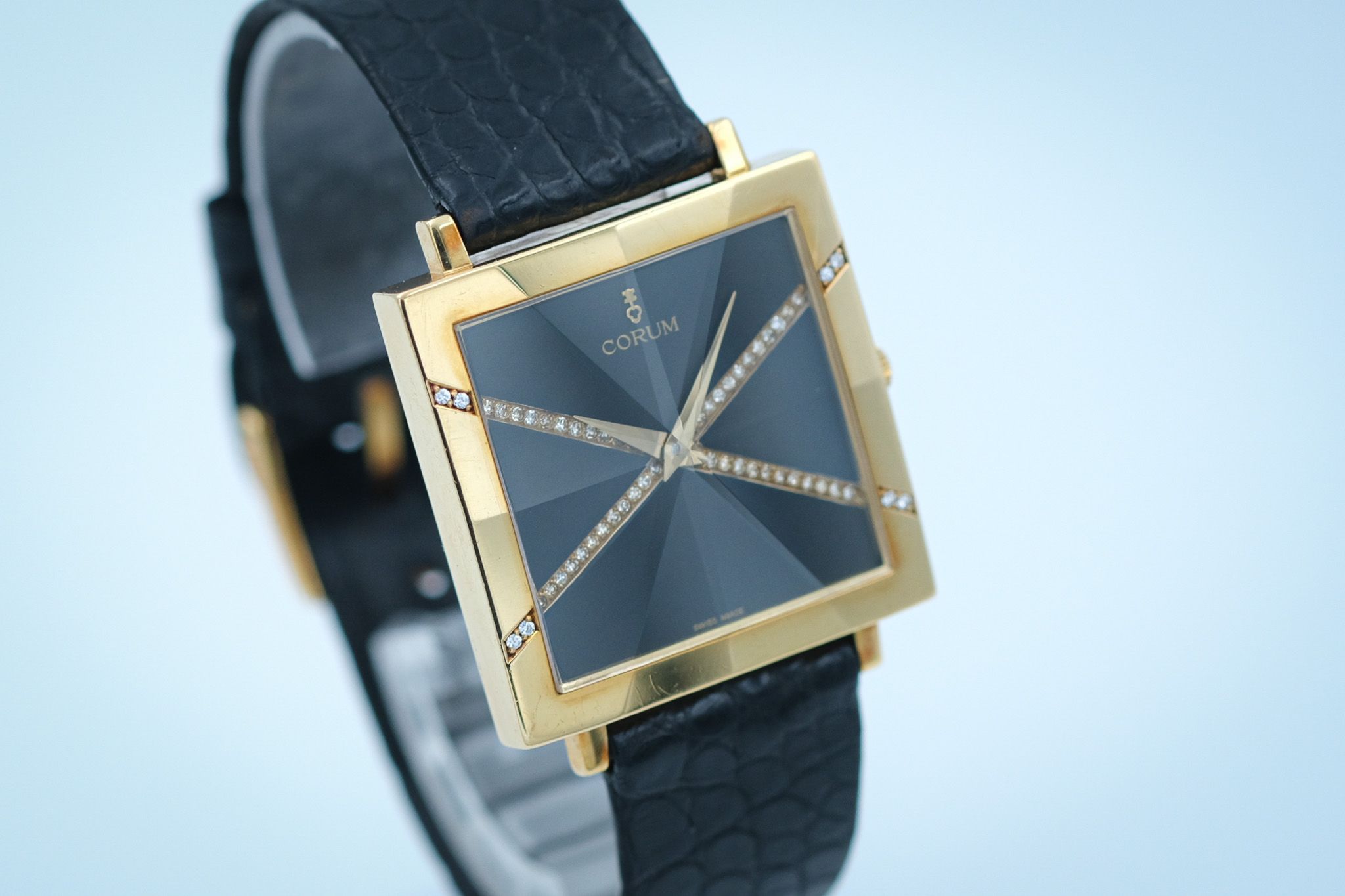 This exceptional Corum timepiece combines masterful craftsmanship with a design that is truly iconic — and currently unique on the global market. We haven´t found another one.The square 18-carat yellow gold case, measuring 30 x 30 mm, features a striking faceted crystal that catches the light beautifully. The deep black dial is adorned with a stunning diamond cross that extends from the dial center over the case flanks.