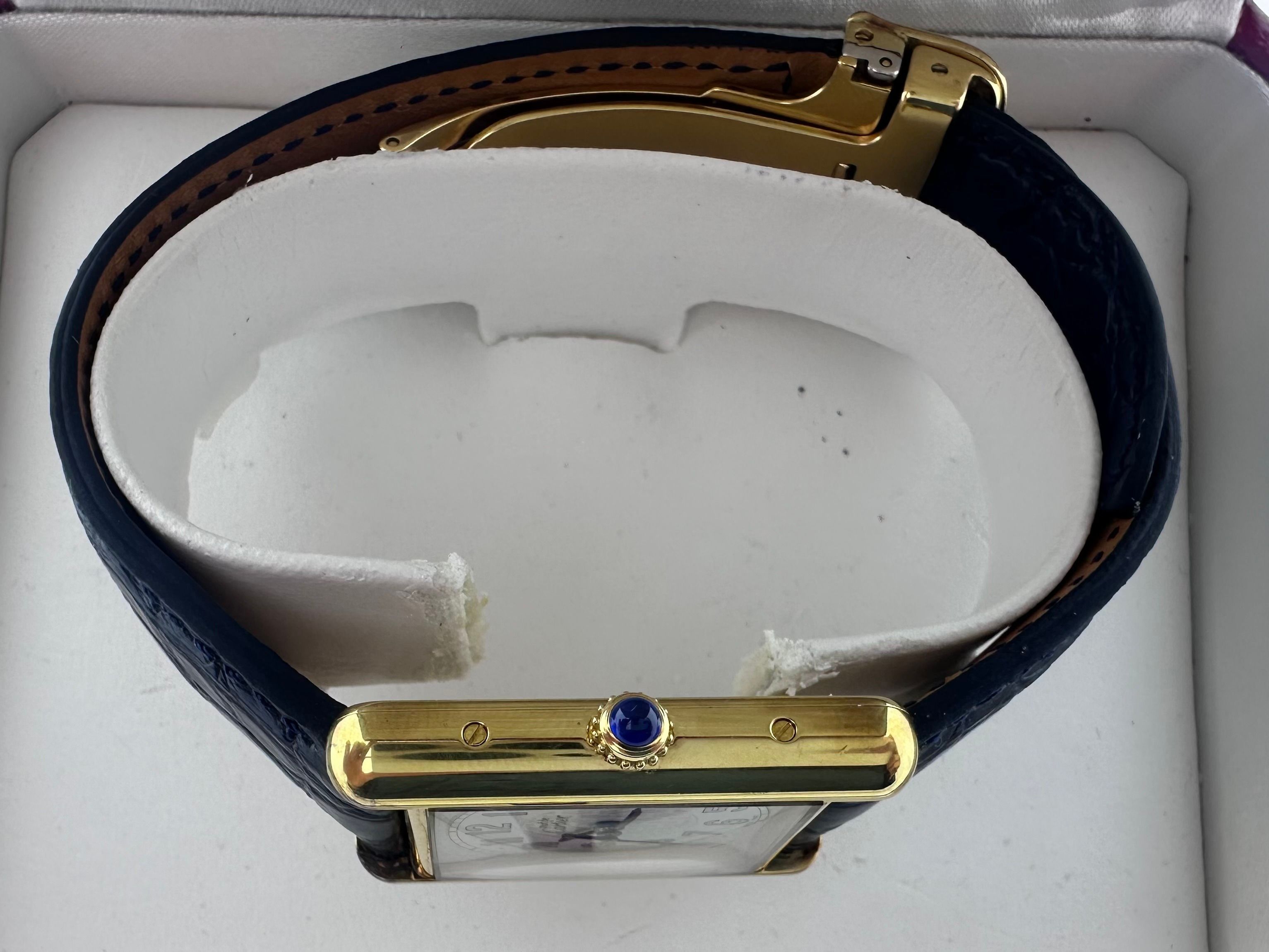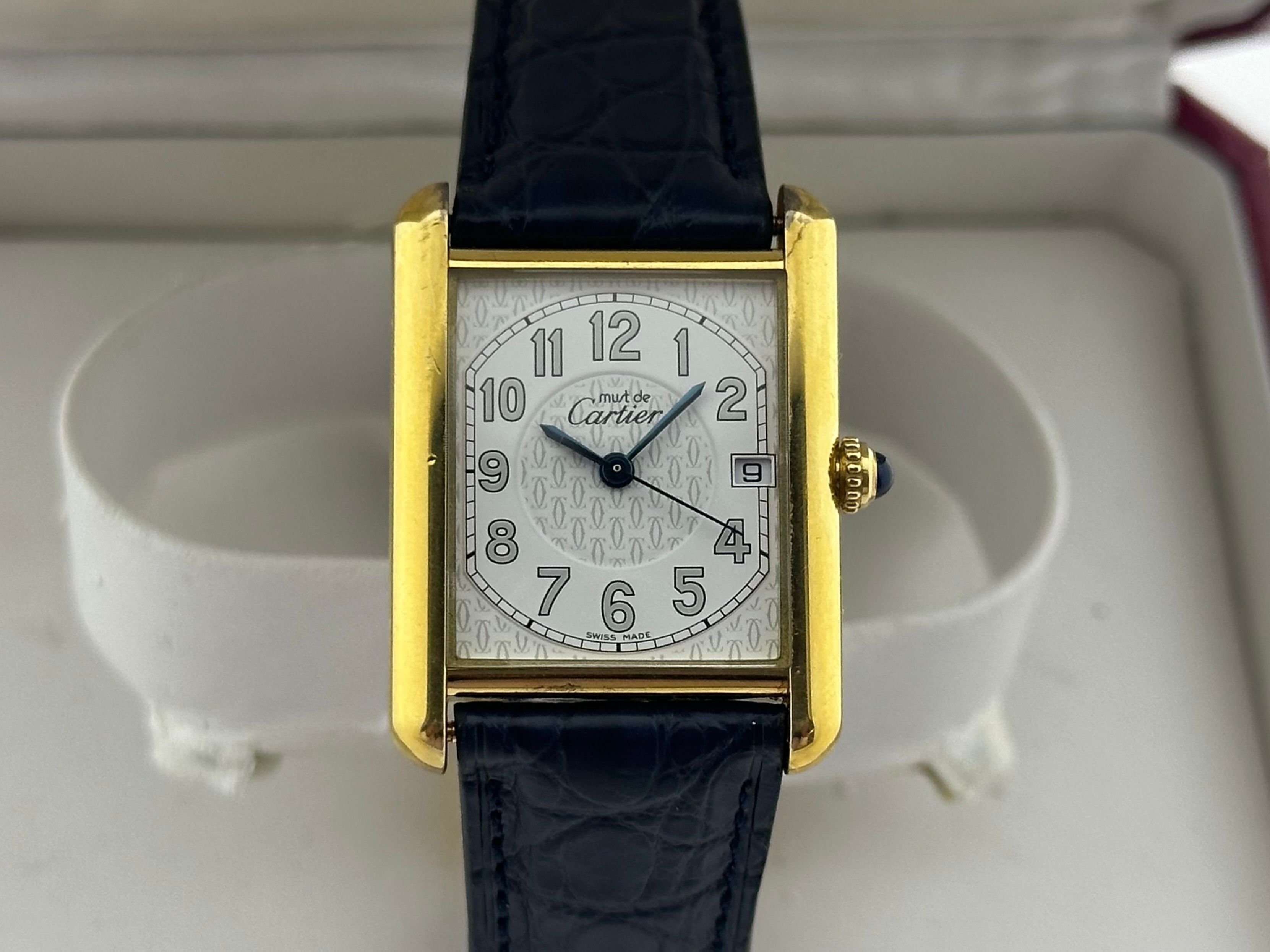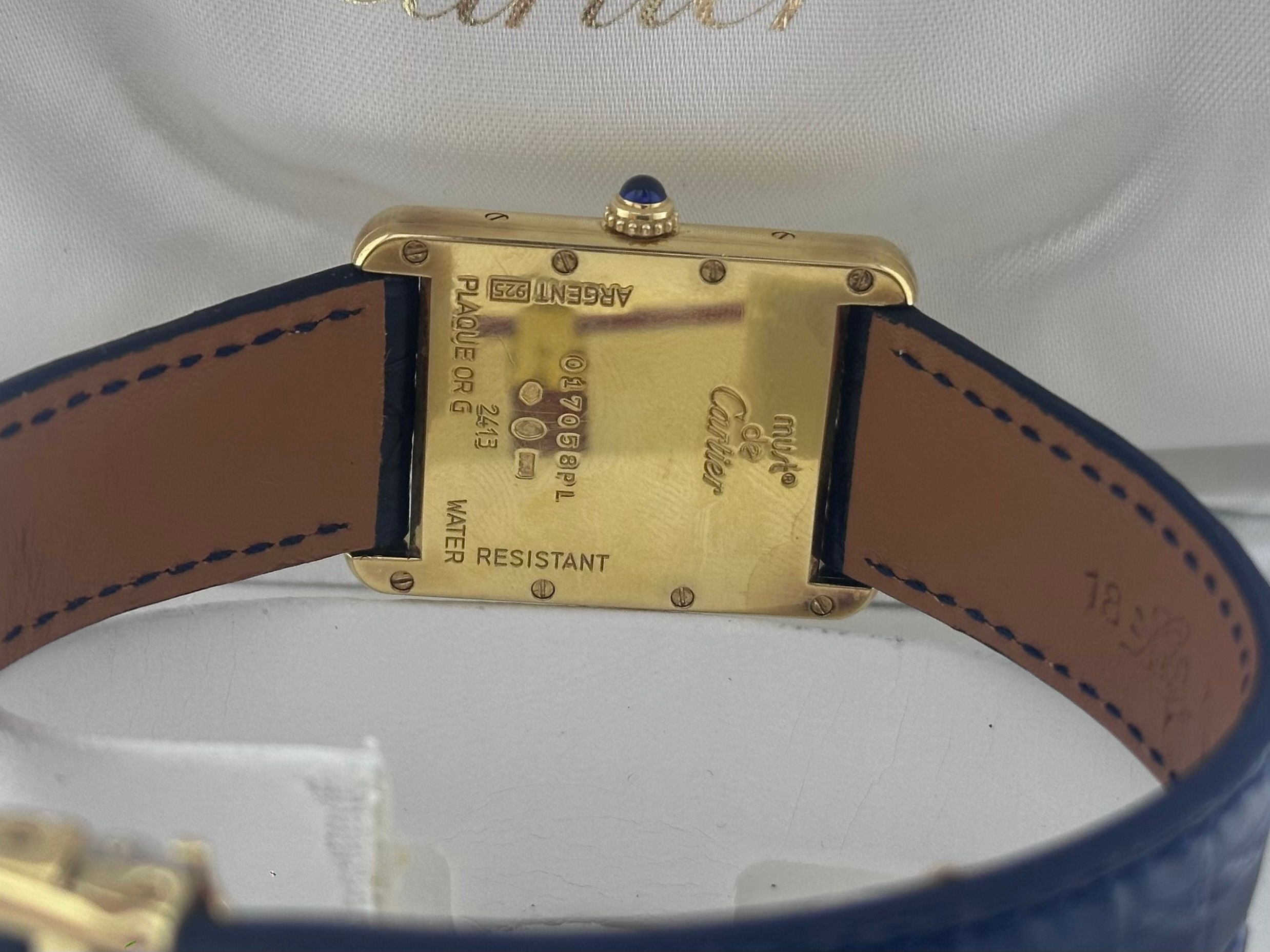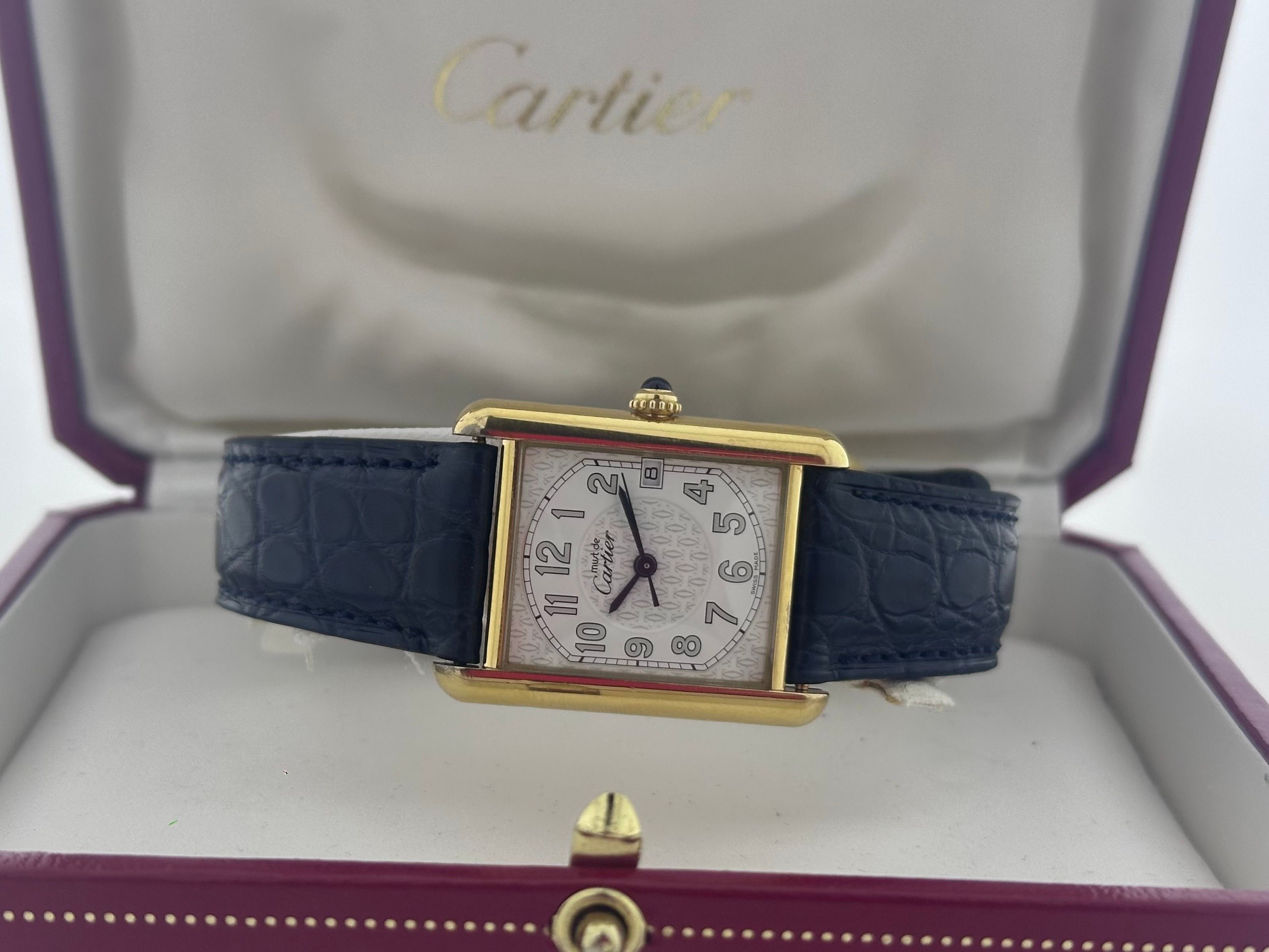 Un orologio Cartier Tank Must, ref. 2413/W1013954. Il Cartier Tank Must è la versione grande, con dimensioni di 25 mm x 32 mm. Il Cartier Tank ha una cassa in argento placcato oro. L'orologio ha un cinturino in pelle di alligatore blu navy e una chiusura pieghevole, con un piccolo graffio sul lato. Il Cartier ha un quadrante bianco con logo Cartier, numeri arabi e datario a finestrella a ore 3. L'orologio è stato revisionato e viene fornito con una garanzia di qualità. L'orologio è stato revisionato e viene fornito con la sua scatola originale.