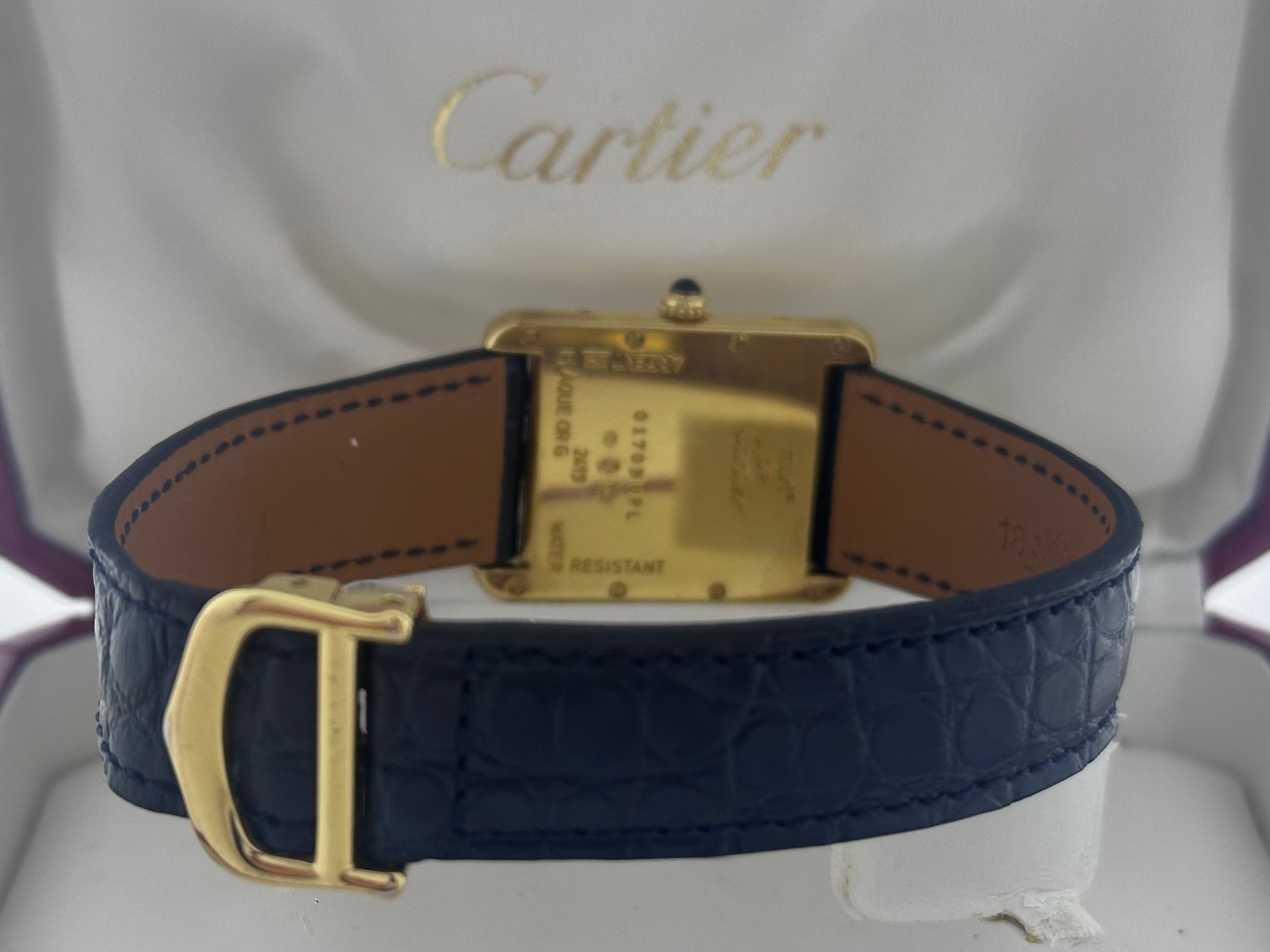 The Cartier comes with 24 months of warrantyA Cartier Tank Must watch, ref. 2413/W1013954. The Cartier Tank Must is the large version, with a size of 25mm x 32mm. The Cartier Tank has a gold plated silver case. The watch has a navy blue alligator leather strap and a folding clasp, with a small scuff on the side. The Cartier has a white dial with Cartier logo motif, arabic numerals and a date window at 3 o'clock. The watch has been serviced and comes with its original box.
