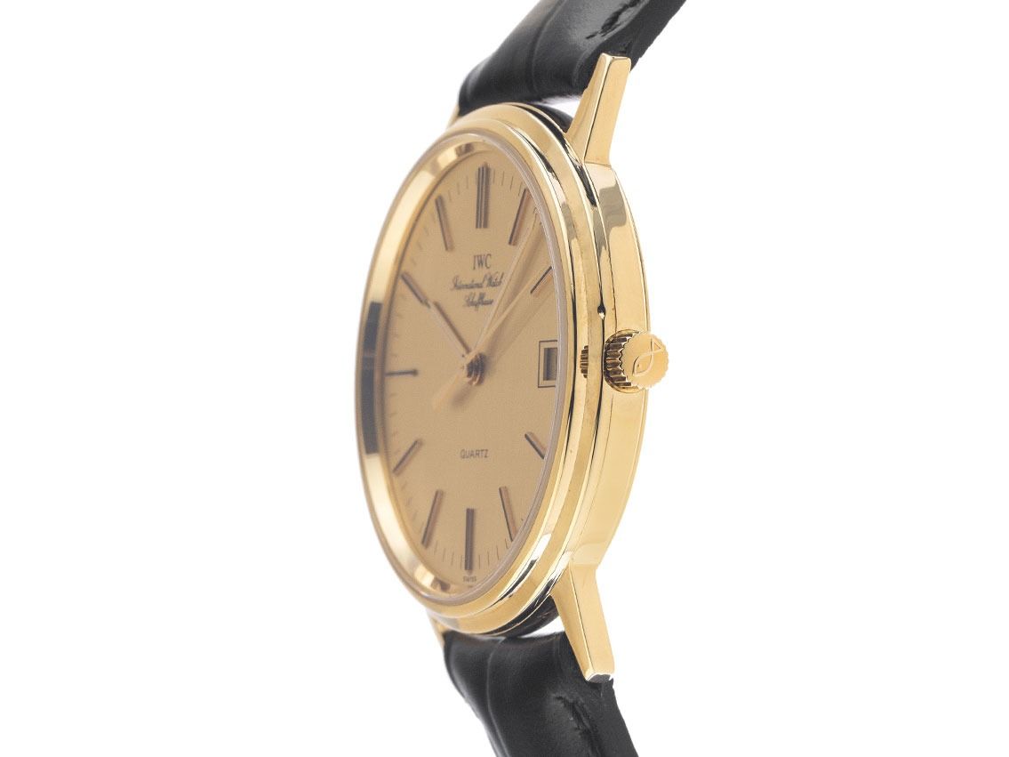 IWC Portofino 18kt Gelbgold Quarz Armband LederGehäuse 18kt Gelbgold poliert, Gehäusedurchmesser ohne Krone 33mm, Gehäusehöhe 6,0mm. Armband Krokoleder schwarz mit Ziernaht, Anstoßbreite 18mm, Stiftschließe Gelbgold vergoldet. Zifferblatt champagnerfarben mit aufgesetzten gelbgoldenen Indexen und gelbgoldenen Zeigern. Uhrwerk quarzgesteuert, Kaliber IWC 2250 mit 7 Edelsteinen. Anzeige von Stunde, Minute und Sekunde über Zeiger aus der Mitte mit Sekundenstopp zur sekundengenauen Einstellung der Uhrzeit, Datumsanzeige mit Schnellverstellung bei 3 Uhr. Saphirglas kratzfest. Krone geriffelt mit Hersteller-Logo. Boden 18kt Gelbgold. Gewicht der Uhr inklusive Armband 36g. Referenznummer: 3513, Gehäusenummer: 2391XXX, ID: P112826000725H-4800, Artikelnummer: 10000081109. Mit Gangkontrolle, neuer Batterie und äußerlicher Aufarbeitung von Juli 2025. Original IWC Box und Watchregister Auszug von Juli 2025, The Watch Register Zertifikat / ohne Eintrag (Internationale Datenbank für verlorene oder gestohlene Uhren). Superschnäppchen, extrem seltenes Sammlerstück. Sehr guter Zustand. Lieferzeit sofort.