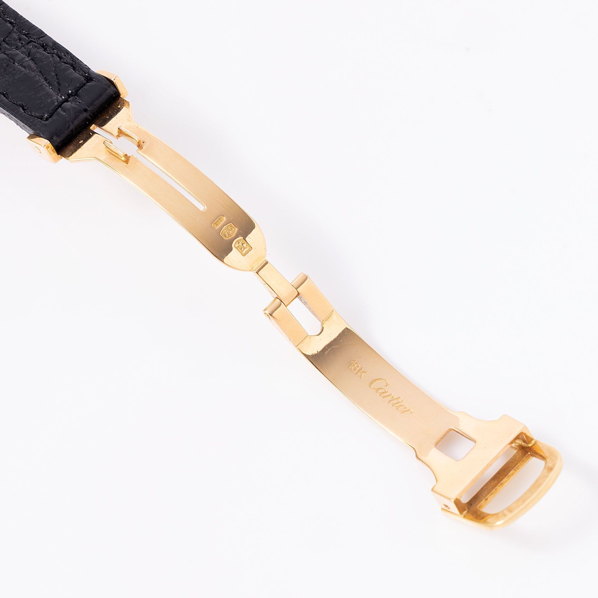 We love the Tonneau on the wrist, as it feels so classy and from another era and yet very relevant for today’s tastes. The Cartier Tonneau was the second Cartier wristwatch, following the Santos Dumont, and was first launched in 1906. This example feels extra special as the “Sunray” style guilloché dial is signed PARIS a testimony this has sold through its flagship store in you guessed it , Paris . The 39 mm( with lugs excluded ) x 26mm yellow gold case remains in very good condition. The guilloche dial is super nice silver coloured . The watch is fitted with blued hands and has a blue cabochon-topped winding crown. The watch comes on the pictured leather strap that has a 18k gold Cartier folding buckle fitted. The manual wind movement has been fully checked by our watchmaker. We're passionate about the more unusual side of Cartier and always try to keep a unique mix of pieces available for fellow fans. If there's something specific you're after, just let us know! Specifications: Cartier Tonneau “Paris” 18k Yellow gold case measured without lugs 39x26 mm. Case number A104xxx dating to the 1990's Guilloché dial with Roman numerals Blued hands Blue cabochon winding crown Manual wind movement Coming on the photographed leather strap with Cartier folding clasp in 18k gold attached Fully checked by our watchmaker One-year mechanical warranty Free worldwide Fedex Priority shipping