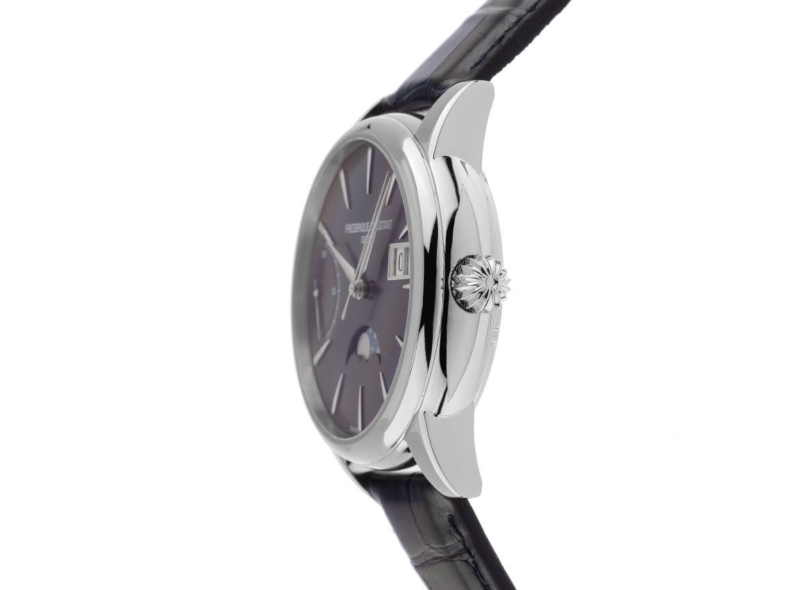 Frederique Constant Big Date Stahl Automatik Armband Krokoleder FaltschließeGehäuse Edelstahl poliert, Gehäusedurchmesser ohne Krone 40mm, Gehäusehöhe 12,6mm. Lünette Edelstahl glatt und poliert. Armband Krokoleder dunkelblau mit Ziernaht, Anstoßbreite 20mm, Frederique Constant Faltschließe Edelstahl. Zifferblatt dunkelblau mit aufgesetzten Edelstahl Indexen und Edelstahl Zeigern. Uhrwerk Automatik, Frederique Constant Manufakturkaliber FC-735 mit 32 Edelsteinen, Gangreserve ca. 50 Stunden. Anzeige von Stunde, Minute und Sekunde über Zeiger aus der Mitte mit Sekundenstopp zur sekundengenauen Einstellung der Uhrzeit, Großdatumsanzeige mit Schnellverstellung zwischen 2 und 3 Uhr, Mondphasenanzeige bei 6 Uhr, Gangreserveanzeige bei 9 Uhr. Saphirglas kratzfest und gewölbt. Zwiebelkrone. Boden Edelstahl verschraubt und graviert mit Saphirglas Sichtfenster. Gewicht der Uhr inklusive Armband 82g. Wasserdicht bis 5 ATM. Referenznummer: FC-735N3H6, ID: ST254649960225H-4995, Artikelnummer: 10000078724. Original Frederique Constant Box mit Umkarton und Garantie Papiere, Full Set. Neu. Lieferzeit sofort.