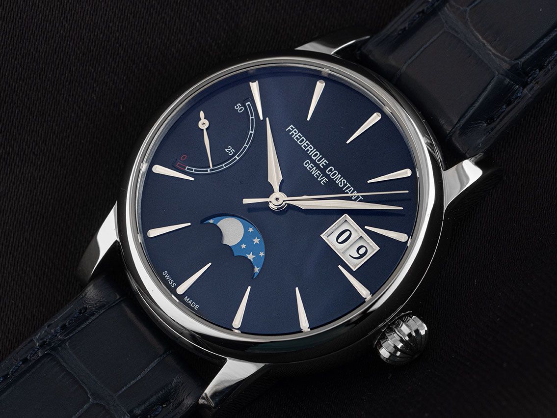 Gehäuse Edelstahl poliert, Gehäusedurchmesser ohne Krone 40mm, Gehäusehöhe 12,6mm. Lünette Edelstahl glatt e poliert. Bracciale Krokoleder dunkelblau con Ziernaht, Anstoßbreite 20mm, Frederique Constant Faltschließe Edelstahl. Zifferblatt dunkelblau con indici Edelstahl aufgesetzten e Zeigern Edelstahl. Uhrwerk Automatik, Frederique Constant Manufakturkaliber FC-735 mit 32 Edelsteinen, Gangreserve ca. 50 Stunden. Anzeige von Stunde, Minute und Sekunde über Zeiger aus der Mitte mit Sekundenstopp zur sekundengenauen Einstellung der Uhrzeit, Großdatumsanzeige mit Schnellverstellung zwischen 2 und 3 Uhr, Mondphasenanzeige bei 6 Uhr, Gangreserveanzeige bei 9 Uhr. Saphirglas kratzfest e gewölbt. Zwiebelkrone. Corpo Edelstahl verschraubt e graviert con Saphirglas Sichtfenster. Peso dell'orologio, compresa la fascia da braccio, 82 g. Capacità di carico fino a 5 ATM. Numero di riferimento: FC-735N3H6, ID: ST254649960225H-4995, Artikelnummer: 10000078724. Scatola originale Frederique Constant con cartone e garanzia, set completo. Neu. Spedizione immediata.