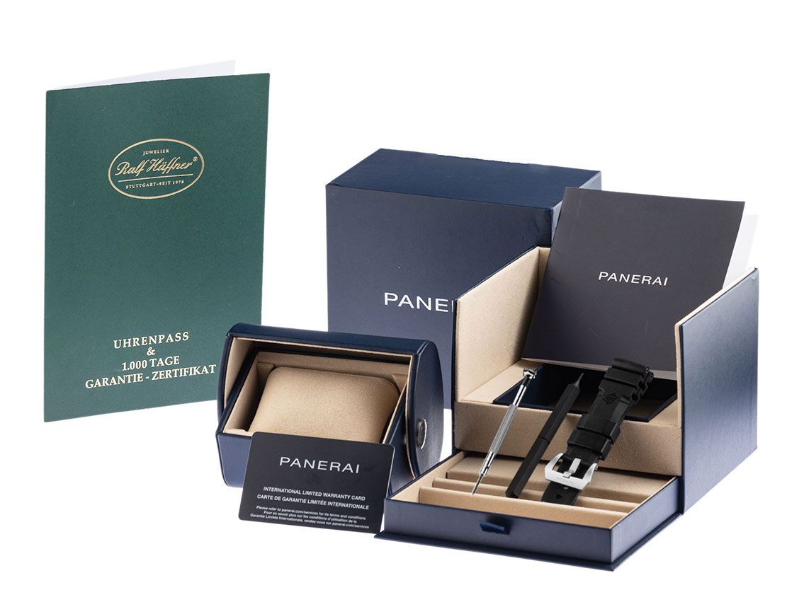 Gehäuse Edelstahl satiniert, Gehäusedurchmesser ohne Krone 42mm, Gehäusehöhe 13,4mm. Lünette Edelstahl satiniert mit schwarzem Keramik Inlay und 60-Minuten Skala, einseitig drehbar. Panerai Armband Textil / Kautschuk grau, Anstoßbreite 22mm, Panerai Stiftschließe Edelstahl mit Hersteller-Logo. Zifferblatt weiß con indici di leucht aufgesetzten e leuchtzeigern schwarzen. Uhrwerk Automatik, Manufakturkaliber P.900 mit 23 Edelsteinen, Gangreserve ca. 72 Stunden. Anzeige von Stunde und Minute über Zeiger aus der Mitte, kleine Sekunde mit Sekundenstopp bei 9 Uhr, Datumsanzeige mit Schnellverstellung bei 3 Uhr. Saphirglas kratzfest. Corona con protezione brevettata Panerai. Corpo in Edelstahl verschraubt e graviert. Peso dell'orologio, compresa la fascia da braccio, 124 g. Capacità di carico del liquido fino a 30 ATM. Numero di riferimento: PAM01579, ID: ST1160162600625H-11200, Artikelnummer: 10000080714. Scatola originale Panerai con cartone e carta di garanzia del maggio 2025, oltre a un dispositivo di sicurezza, protezione e cintura di sicurezza Kautschuk nero, set completo. Non distribuito. Lieferzeit sofort.