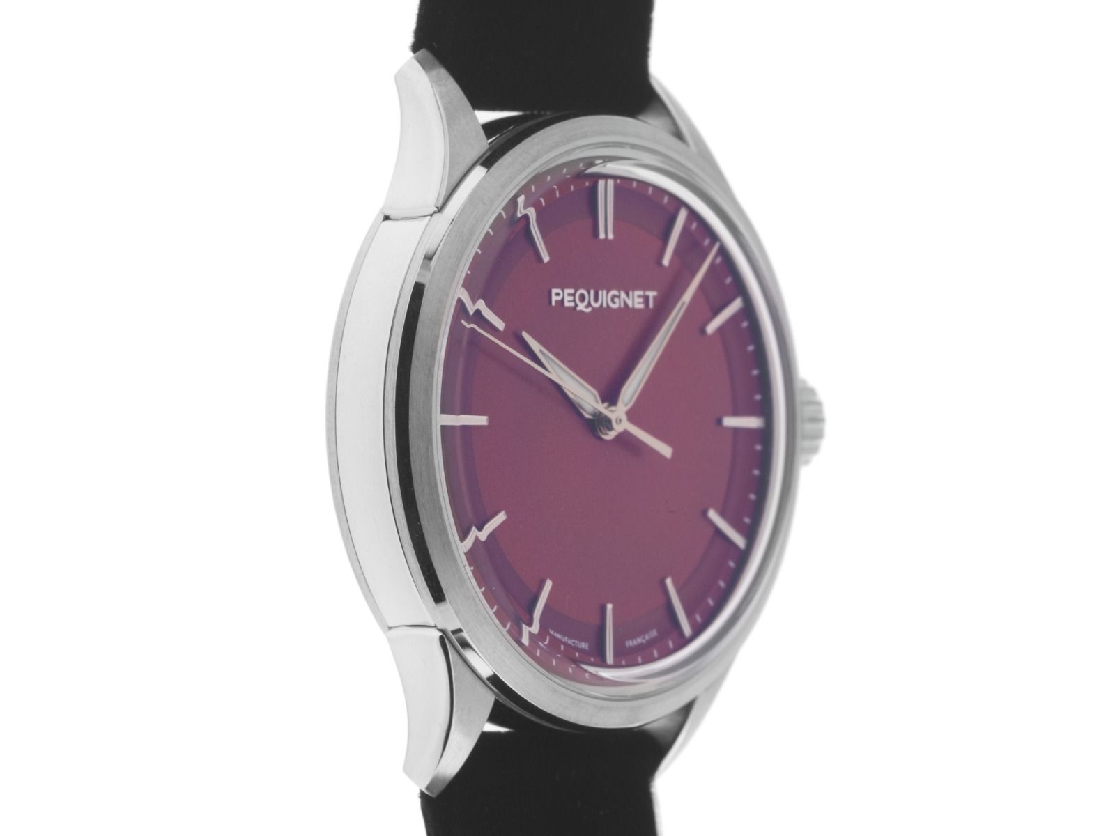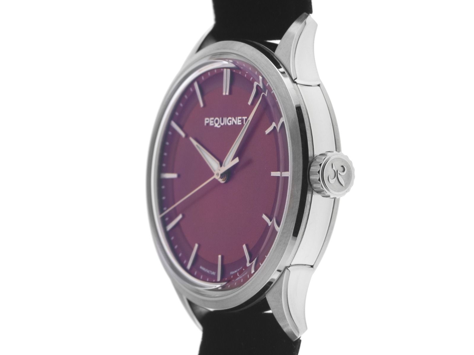 Pequignet Royale Paris Stahl Automatik Armband LederGehäuse Edelstahl poliert, Gehäusedurchmesser ohne Krone 36mm, Gehäusehöhe 8,95mm. Lünette Edelstahl glatt und poliert. Armband Leder schwarz, Anstoßbreite 18mm, Stiftschließe Edelstahl mit Hersteller-Logo. Zifferblatt rot mit aufgesetzten Edelstahl Indexen und Edelstahl Zeigern. Uhrwerk Automatik, Kaliber Initial® mit 21 Edelsteinen, Gangreserve ca. 65 Stunden. Anzeige von Stunde, Minute und Sekunde über Zeiger aus der Mitte mit Sekundenstopp zur sekundengenauen Einstellung der Uhrzeit, Datumsanzeige mit Schnellverstellung bei 3 Uhr. Saphirglas kratzfest. Krone verschraubbar mit Flankenschutz und Hersteller-Logo. Boden Edelstahl 6-Fach verschraubt und graviert mit Saphirglas Sichtfenster. Gewicht der Uhr inklusive Armband 49g. Referenznummer: 9106363/C, ID: ST506435000725H-3500, Artikelnummer: 10000081246. Original Pequignet Box mit Umkarton und Garantie Papiere sowie Beschreibung, Full Set. Neu. Lieferzeit sofort