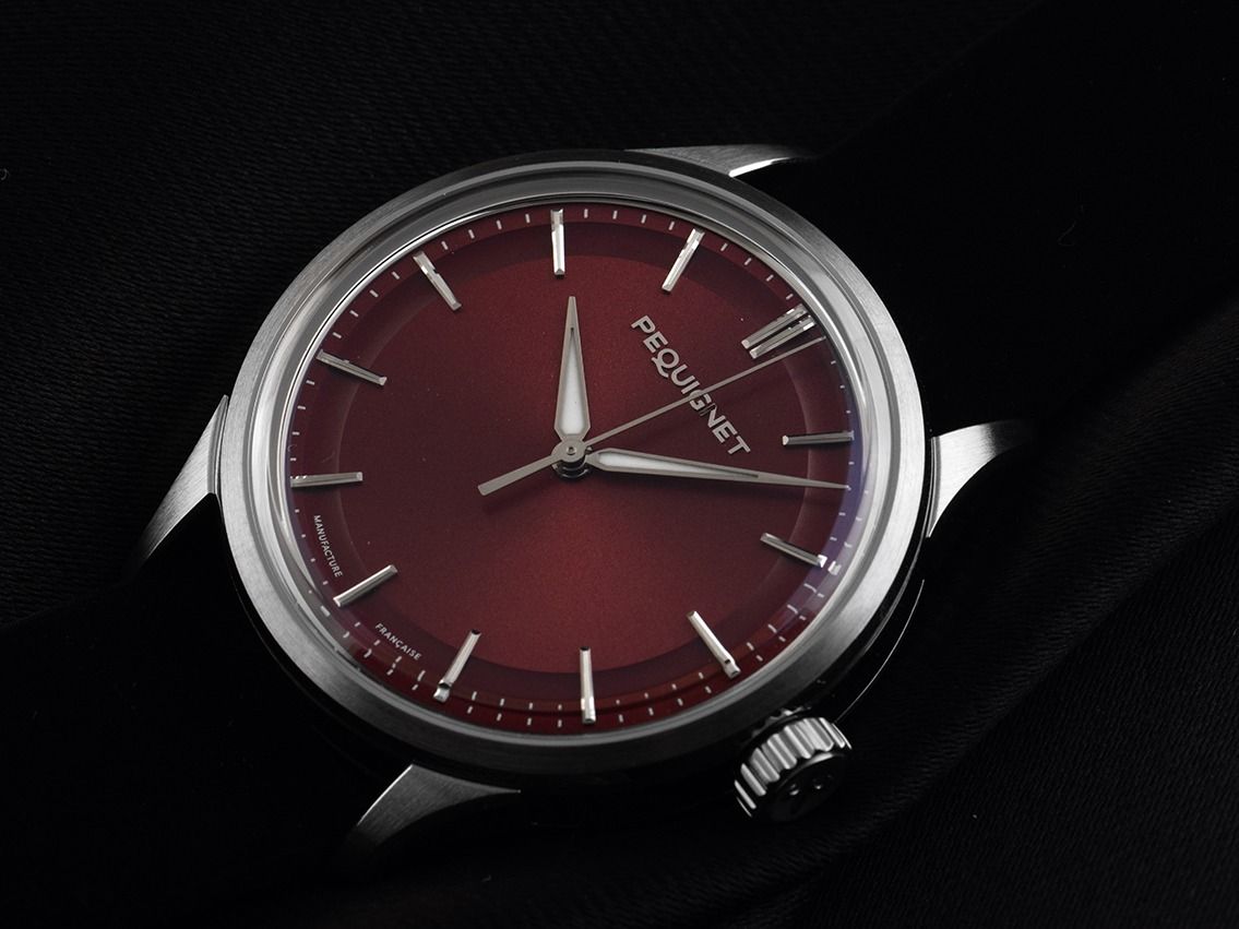 Gehäuse Edelstahl poliert, Gehäusedurchmesser ohne Krone 36mm, Gehäusehöhe 8,95mm. Lünette Edelstahl glatt e poliert. Fascia da braccio in Leder nero, Anstoßbreite 18mm, Stiftschließe Edelstahl con logo dell'azienda. Zifferblatt rot con indici Edelstahl aufgesetzten e Zeigern Edelstahl. Uhrwerk Automatik, Kaliber Initial® mit 21 Edelsteinen, Gangreserve ca. 65 Stunden. Anzeige von Stunde, Minute und Sekunde über Zeiger aus Mitte mit Sekundenstopp zur sekundengenauen Einstellung der Uhrzeit, Datumsanzeige mit Schnellverstellung bei 3 Uhr. Saphirglas kratzfest. Crono con protezione laterale e logo dell'azienda. Corpo in Edelstahl 6-Fach ricoperto e grave con vetro di sicurezza in Saphirglas. Peso dell'orologio, compresa la fascia da braccio, 49g. Referenznummer: 9106363/C, ID: ST506435000725H-3500, Artikelnummer: 10000081246. Scatola originale Pequignet con Umkarton e Carta Garantita oltre a Beschreibung, Set completo. Neu. Lieferzeit sofort