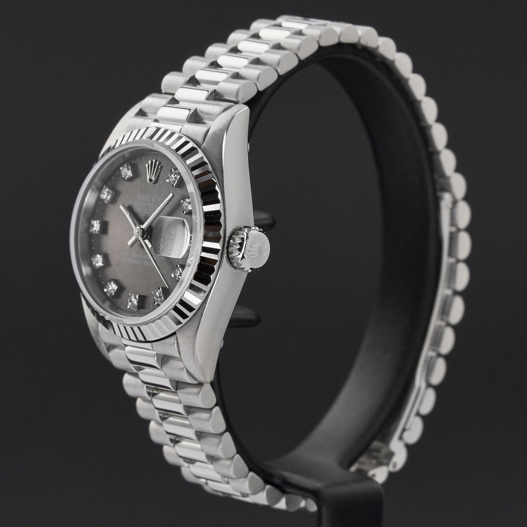 This Rolex Lady-Datejust 69179 features a Grey small diamond dial and is crafted from 18K white gold, with a production year of 1988.