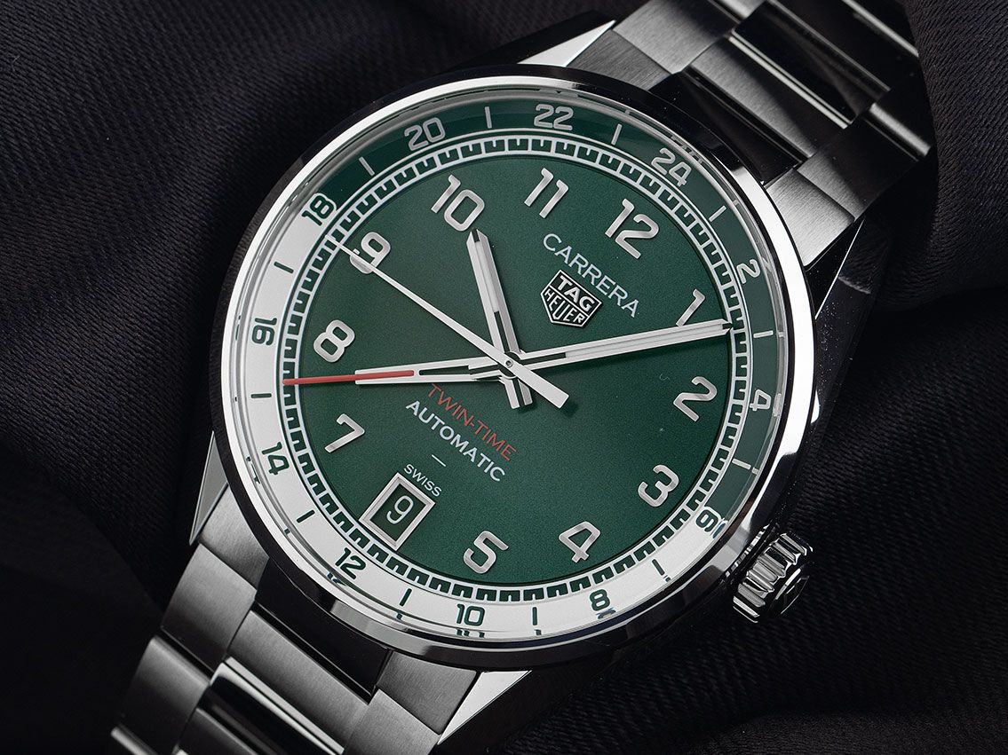 Tag Heuer Carrera Date Twin-Time Stahl Automatik Armband StahlGehäuse Edelstahl poliert, Gehäusedurchmesser ohne Krone 41mm, Gehäusehöhe 12,6mm. Unterglaslünette mit 24-Stunden Skala sowie Tag- und Nachtanzeige. Armband Edelstahl poliert und satiniert, Doppelsicherheitsfaltschließe Edelstahl mit Hersteller-Logo. Zifferblatt grün mit aufgesetzten polierten Edelstahl Leuchtindexen und polierten Edelstahl Leuchtzeigern. Uhrwerk Automatik, Kaliber Tag Heuer TH31-03 mit 30 Edelsteinen, Gangreserve ca. 80 Stunden. Anzeige von Stunde, Minute und Sekunde über Zeiger aus der Mitte mit Sekundenstopp zur sekundengenauen Einstellung der Uhrzeit, Datumsanzeige mit Schnellverstellung bei 6 Uhr, zweite Zeitzone (GMT) ablesbar über Zeiger mit roter Spitze und Unterglaslünette. Saphirglas kratzfest und gewölbt. Krone mit Hersteller-Logo. Boden Edelstahl verschraubt und graviert mit Saphirglas Sichtfenster. Gewicht der Uhr inklusive Armband 154g, Länge des Armbandes inklusive Gehäuse 200mm. Wasserdicht bis 10 ATM. Referenznummer: WDA2114.BA0043, ID: ST116063180725H-4950, Artikelnummer: 10000081350. Original Tag Heuer Box mit Umkarton und Garantie Papiere von 2025, Full Set. Ungetragen. Lieferzeit sofort.