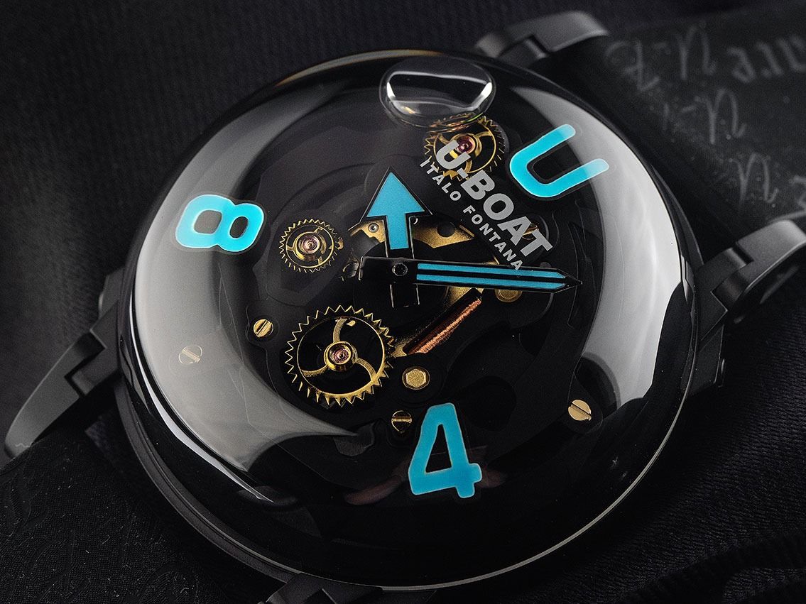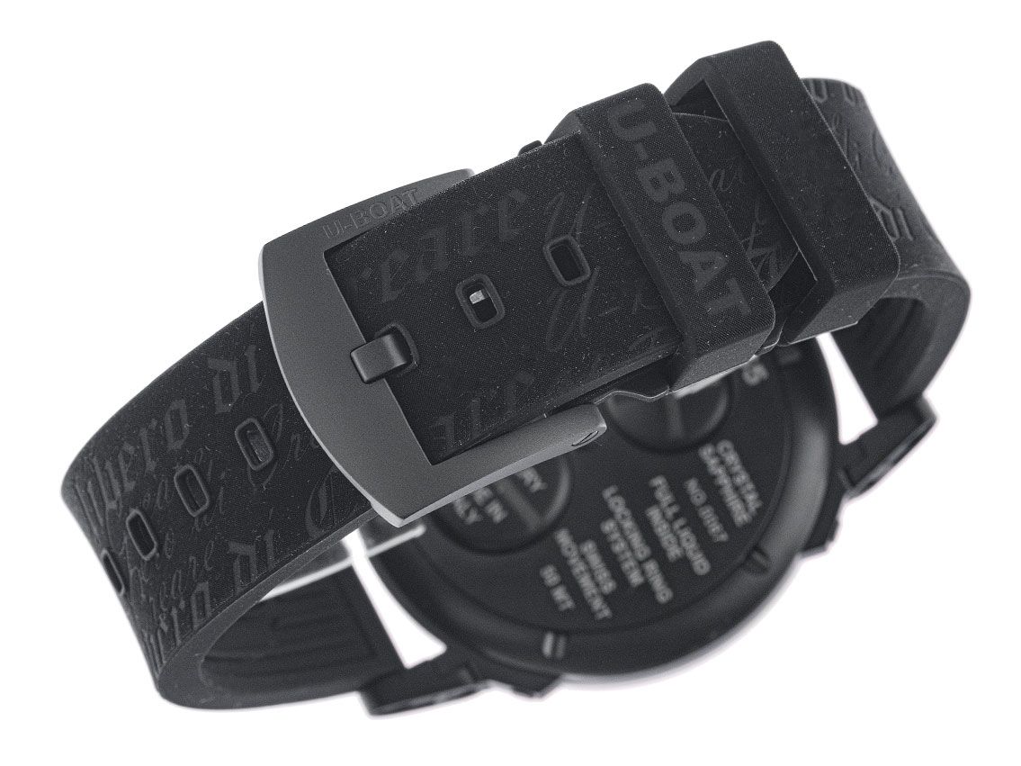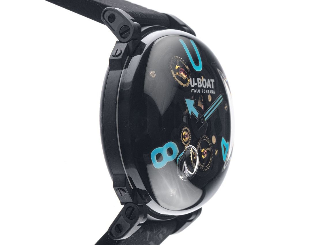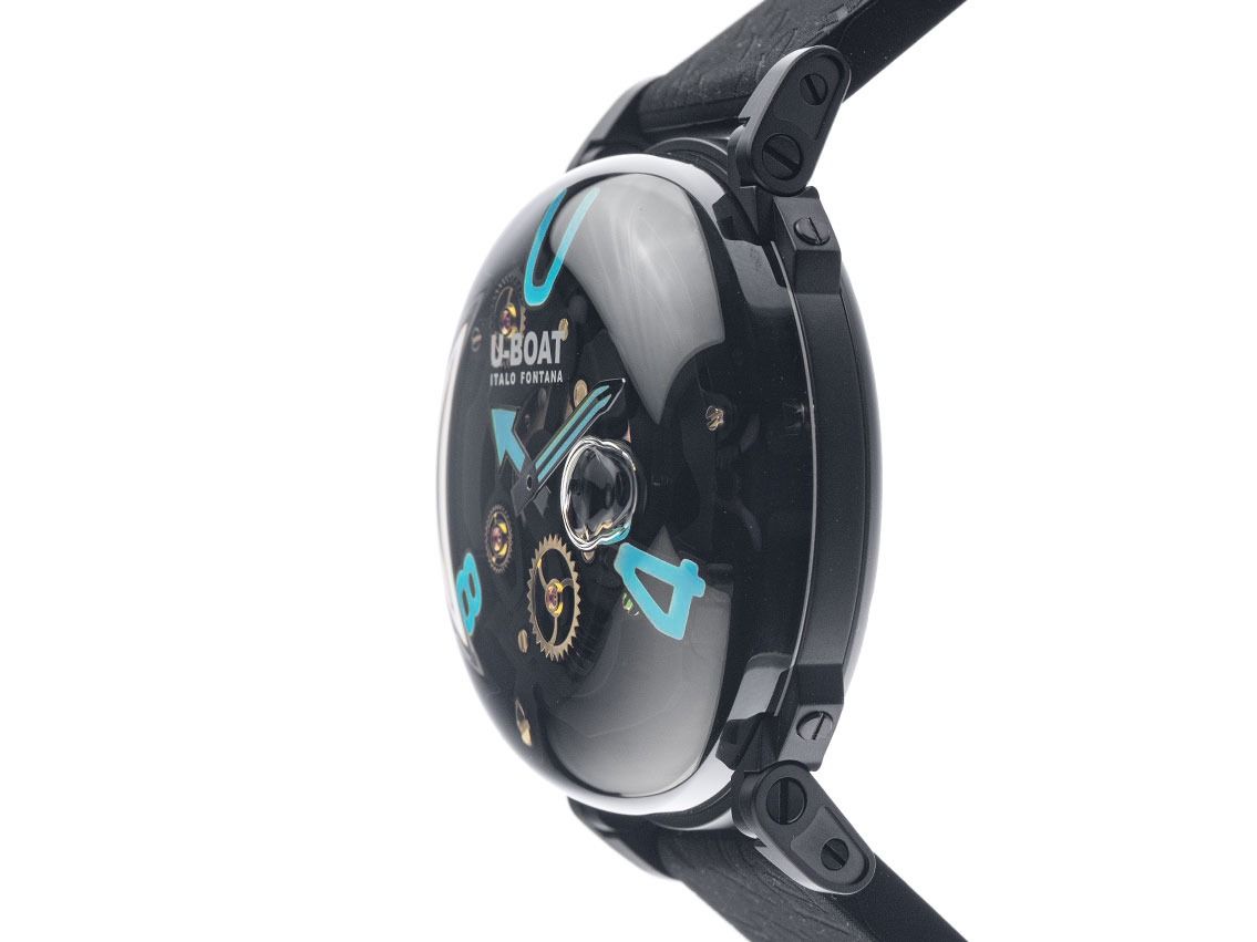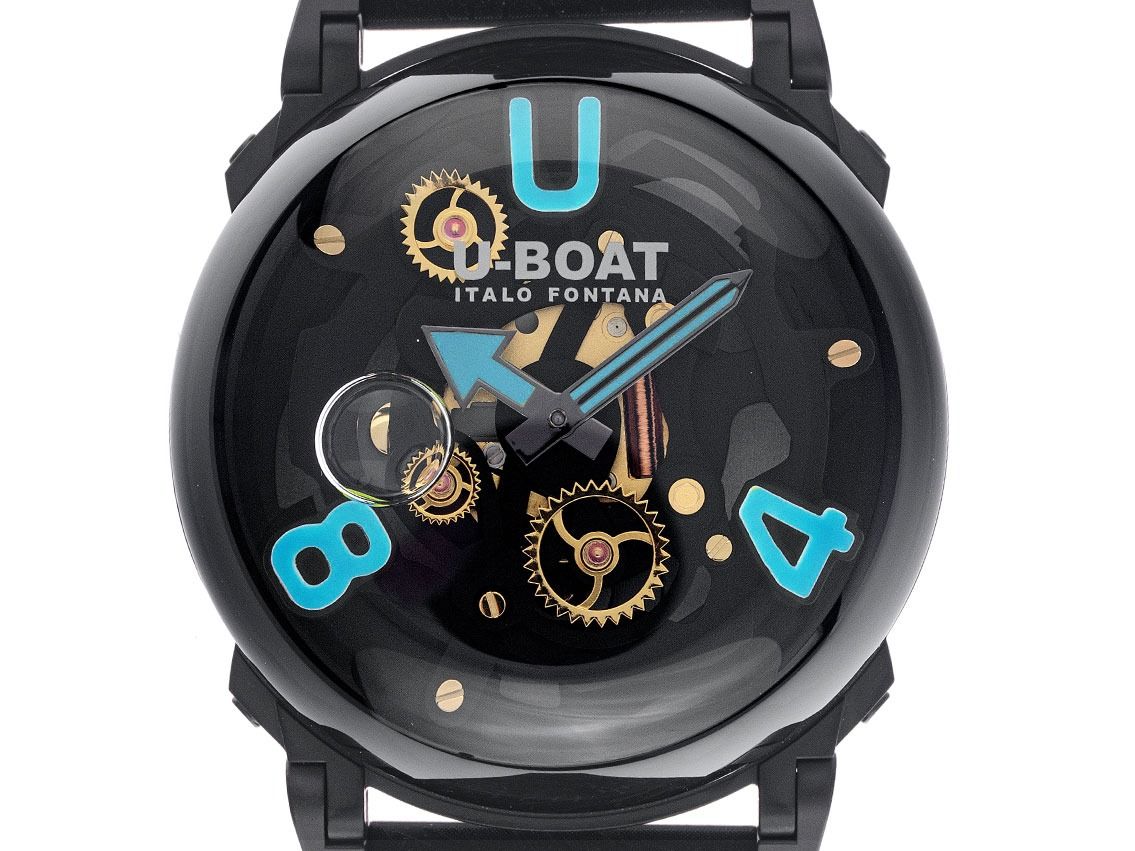 Gehäuse Edelstahl schwarz PVD beschichtet und satiniert, Gehäusedurchmesser ohne Krone 44mm, Gehäusehöhe 18,7mm. Bracciale U-Boat Kautschuk / Samt schwarz con Schriftzug, Anstoßbreite 22mm, Stiftschließe Edelstahl con logo dell'azienda. Il pannello di vetro è scheletrato con leuchtziffern arabi türkisen e leuchtzeigern polierten. L'orologio è dotato di una speciale valvola di scarico e di una valvola di scarico per regolare le temperature. L'Uhrwerk elektromechanisch, Kaliber U-Boat im Ölbad, opera tra 0° e +60°C. Anzeige von Stunde und Minute über Zeiger aus der Mitte. Saphirglas kratzfest e gewölbt. Krone am Gehäuseboden, einstellbar über Drücker. Corpo in Edelstahl PVD nero, con rivestimento, verniciatura e finitura. Peso dell'orologio, compresa la fascia da braccio, 127 g. Capacità di carico 5 ATM. Referenznummer: 3353, ID: ST115423800725H-2000, Artikelnummer: 10000081434. Scatola originale U-Boat e documenti di garanzia oltre a Beschreibung e Stellstift, set completo. Neu.
