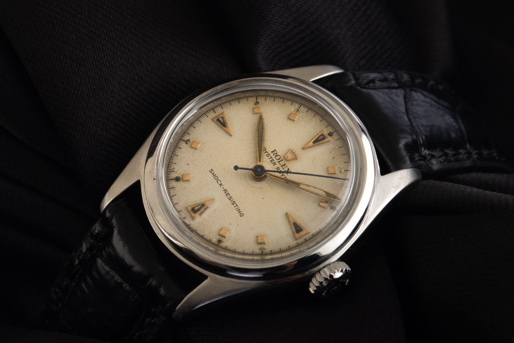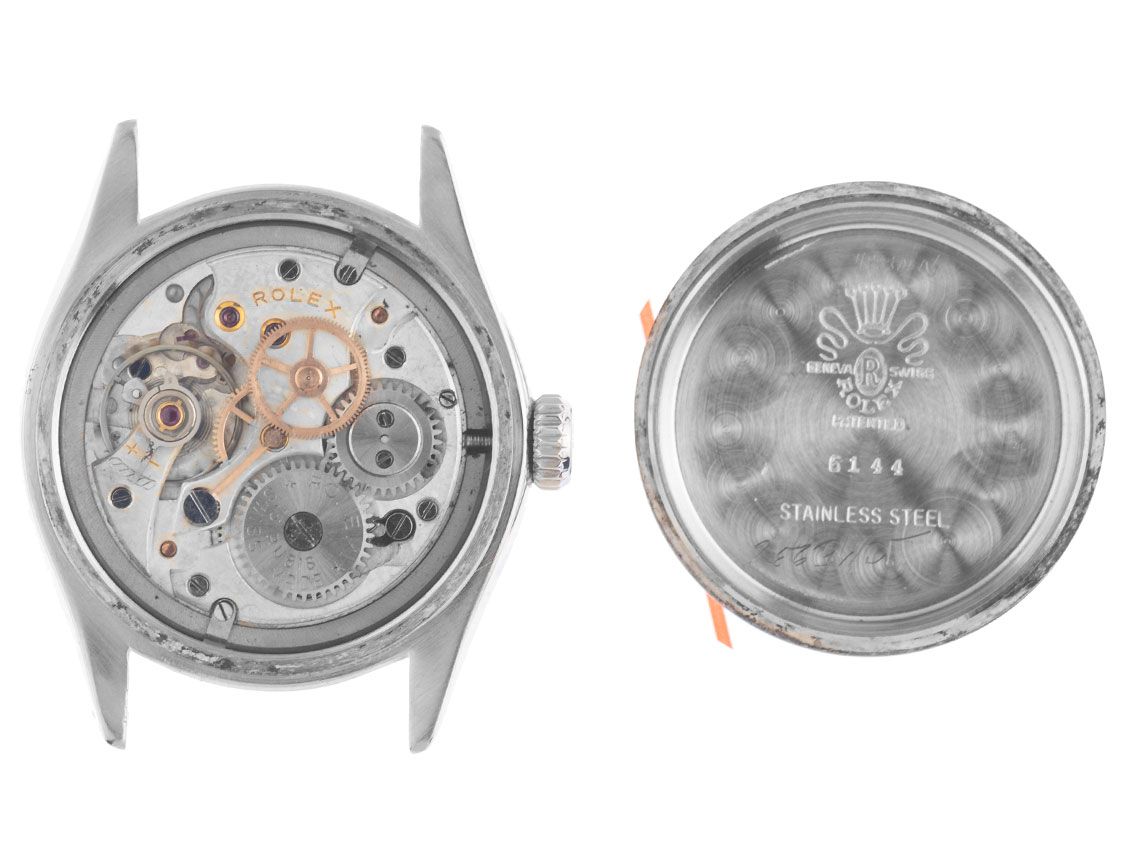 Gehäuse Edelstahl poliert und satiniert, Gehäusedurchmesser ohne Krone 31mm, Gehäusehöhe 11,1mm. Lünette Edelstahl glatt e poliert. Fascia da braccio Krokoleder schwarz mit Ziernaht, Anstoßbreite 18mm, Rolex Stiftschließe Edelstahl mit Hersteller-Logo. Zifferblatt cremeweiß, leggermente patinato con Keilindexen gelbgolden aufgesetzten, gelbgoldenem Stundenzeiger e gebläutem Sekundenzeiger. Stampa "Rolex Oyster Royal" (molto elegante). Manipolo Uhrwerk, Kaliber 710 con 15 Edelsteinen. Anzeige von Stunde, Minute und Sekunde über Zeiger aus der Mitte. Plexiglas danneggiato. Krone geriffelt mit Hersteller-Logo. Corpo in Edelstahl verschraubt. Peso dell'orologio, compresa la fascia da braccio, 36 g. Numero di riferimento: 6144, Gehäusenummer: 772XXX, Baujahr: 1962, ID: P118928420725H-4200, Artikelnummer: 10000081426. Con Gangkontrolle e un'accurata lavorazione a partire da luglio 2025. Scatola originale Rolex, Ledermäppchen, Beschreibung, Übersetzungsheft e Watchregister Auszug von Juli 2025, The Watch Register Zertifikat / ohne Eintrag (Internationale Datenbank für verlorene oder gestohlene Uhren). Superschnäppchen. Kapitalanlage mit Wertsteigerungspotential, extrem seltenes Sammlerstück. Sehr guter Zustand. Lieferzeit sofort