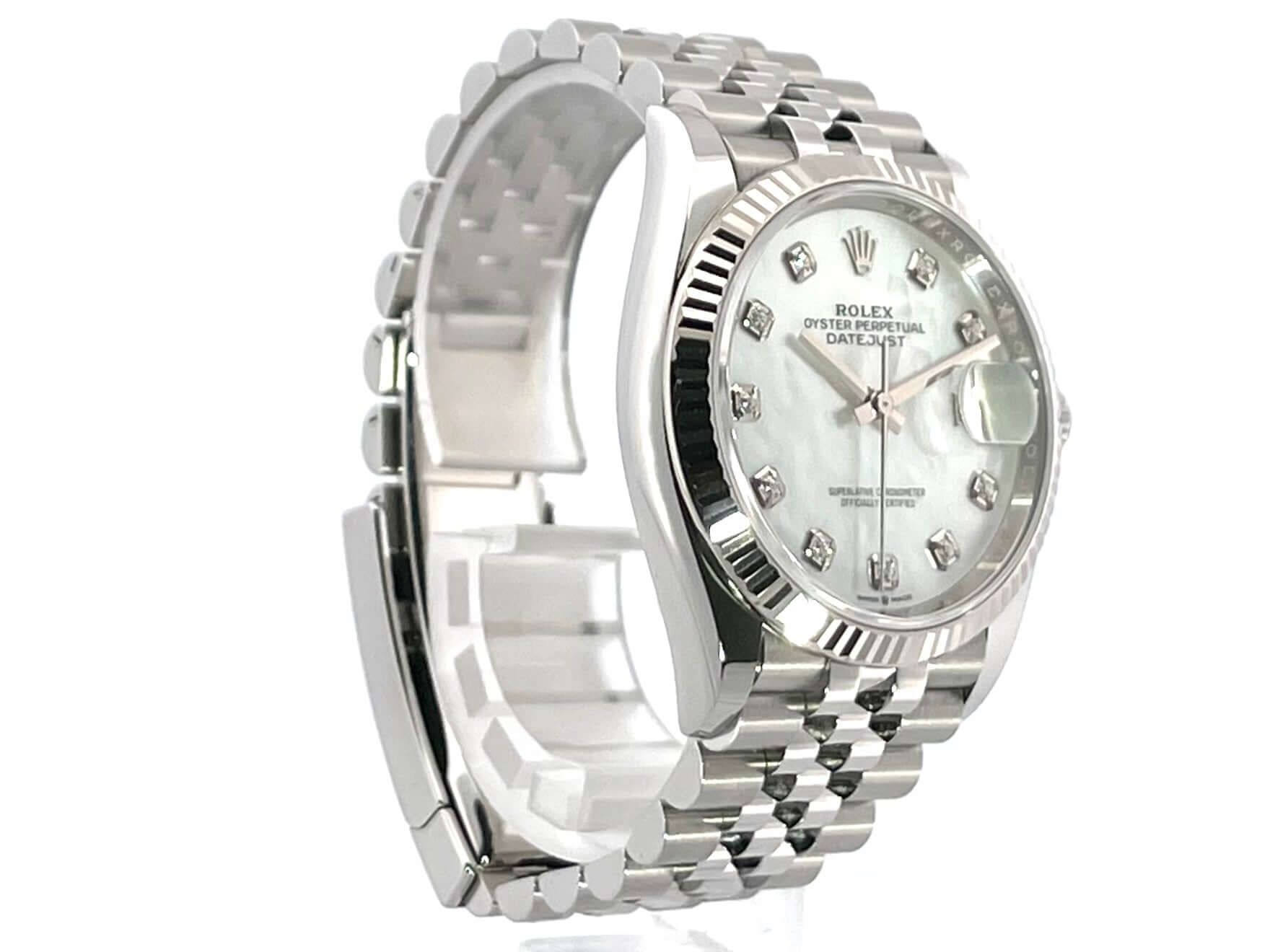 Rolex Datejust 36 Oystersteel White Gold Ref. 126234 Mother of Pearl Diamond Jubile Band Case made of polished and satin-finished Oystersteel stainless steel, case diameter 36 mm, bezel made of 18 kt white gold, mother-of-pearl dial with 10 applied diamonds, Jubile stainless steel bracelet with folding clasp, automatic, Rolex manufacture caliber 3235, 70-hour power reserve, date display, chronometer, sapphire crystal, screw-down crown, stainless steel back screwed, waterproof up to 10 bar.