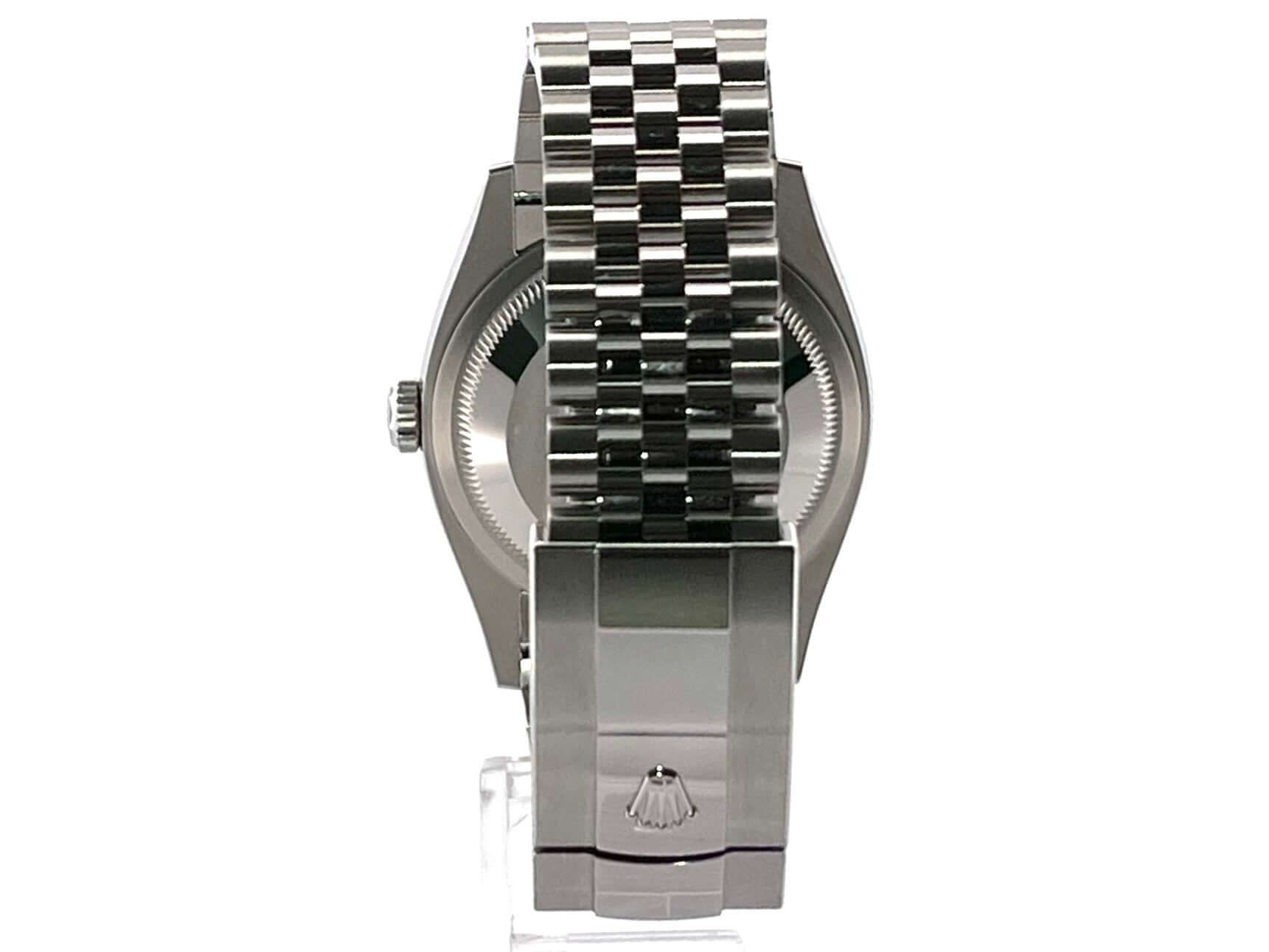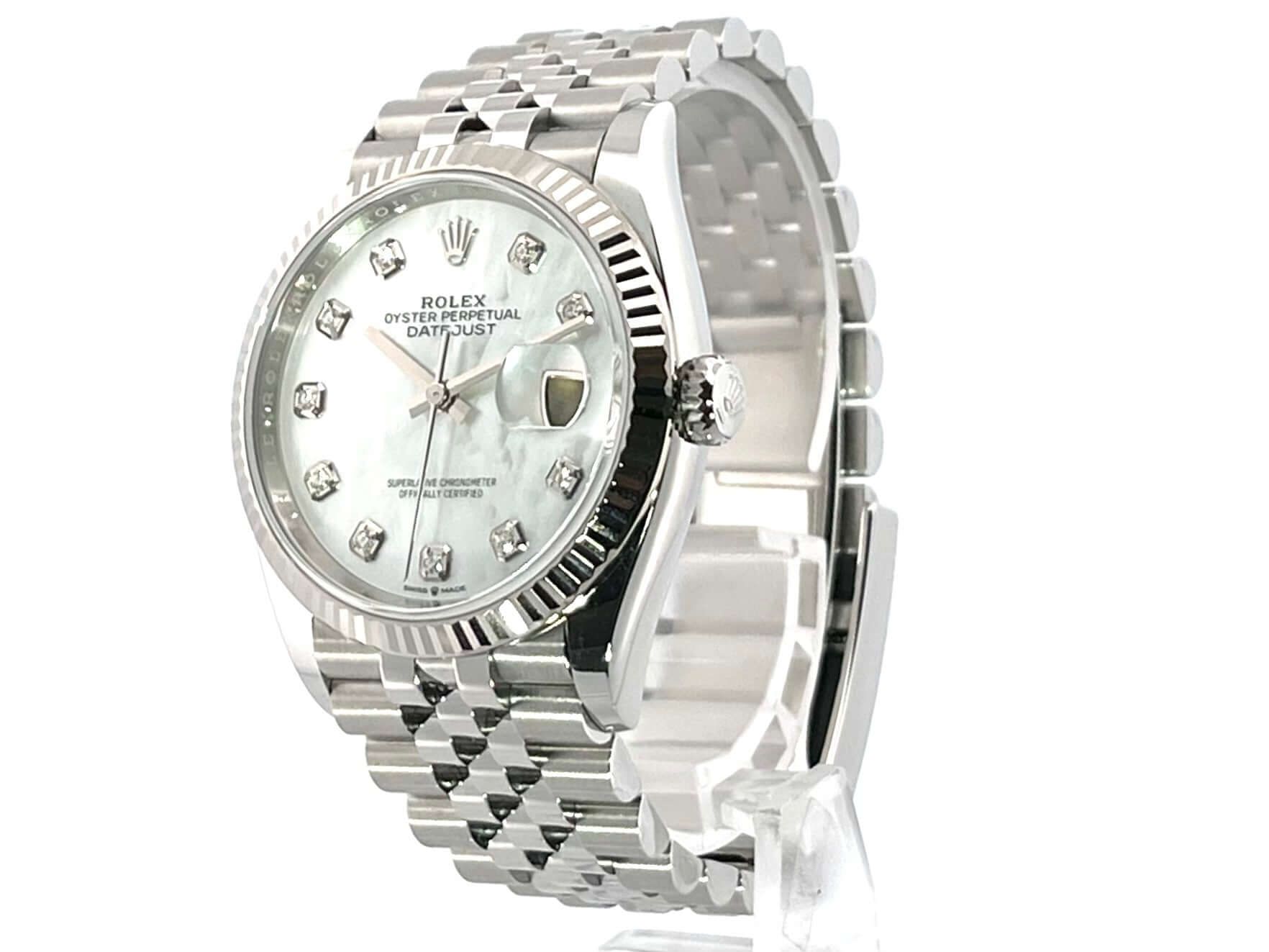 Rolex Datejust 36 Oystersteel Oro Bianco Ref. 126234 Mother of Pearl Diamond Jubile Band Cassa in acciaio inossidabile Oystersteel lucido e satinato, diametro cassa 36 mm, lunetta in oro bianco 18 kt, quadrante in madreperla con 10 diamanti applicati, bracciale in acciaio inossidabile Jubilee con chiusura déployante, automatico, calibro di manifattura Rolex 3235, riserva di carica di 70 ore, datario, cronometro, vetro zaffiro, corona a vite, fondello in acciaio inossidabile avvitato, impermeabile fino a 10 bar.