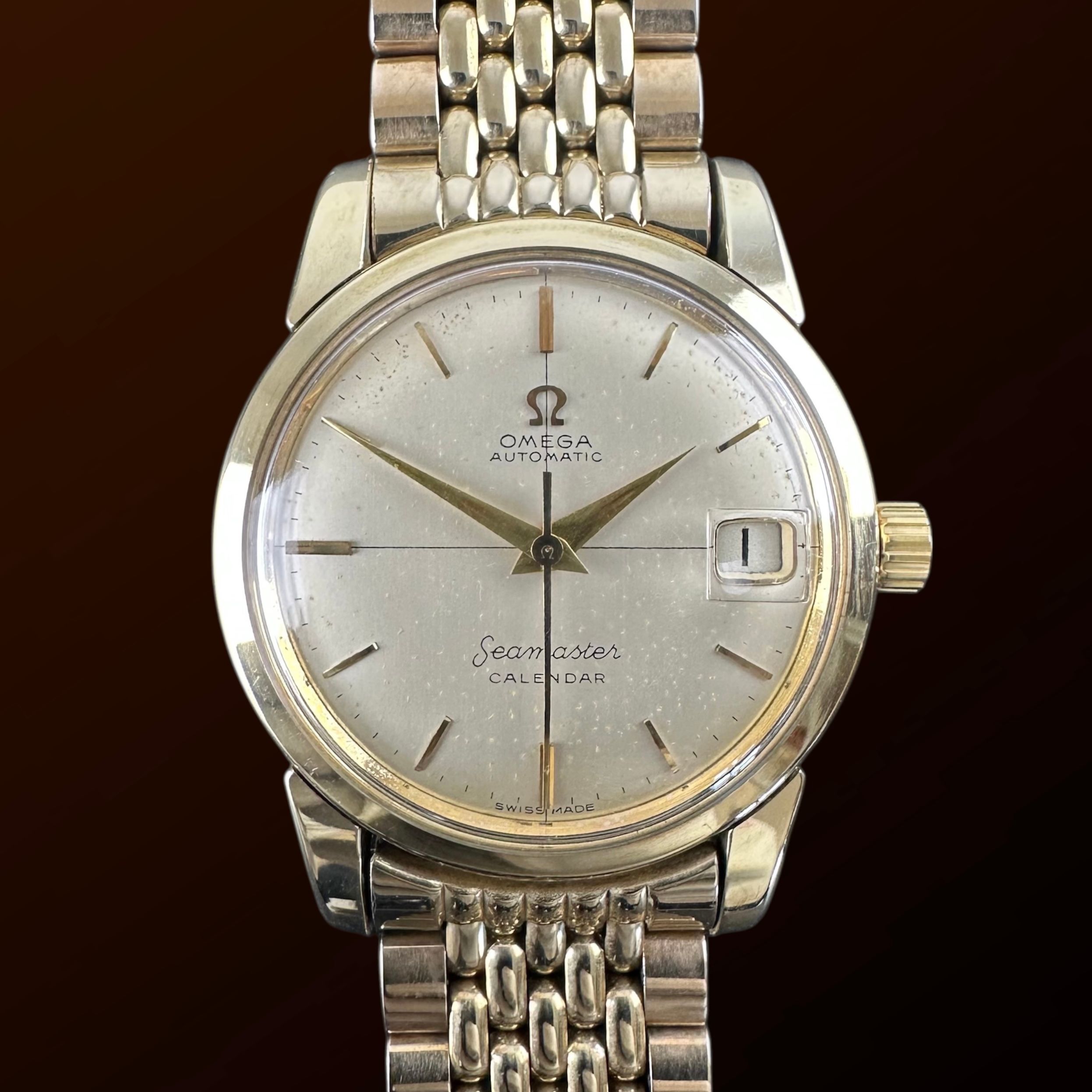 This 1958 Omega Seamaster Calendar is a stunning vintage piece with a beautifully aged white dial featuring light patina speckling. The dial layout with golden hour markers, Omega logo, date window, and hands contrast elegantly with the black font, crosshair, and minute markers.Its gold-plated case remains in excellent condition, as does the uncommon, well-preserved gold-plated beads-of-rice bracelet—quite uncommon since most are overpolished. Inside, the Omega caliber 503 automatic movement, overhauled in March 2025, runs smoothly.