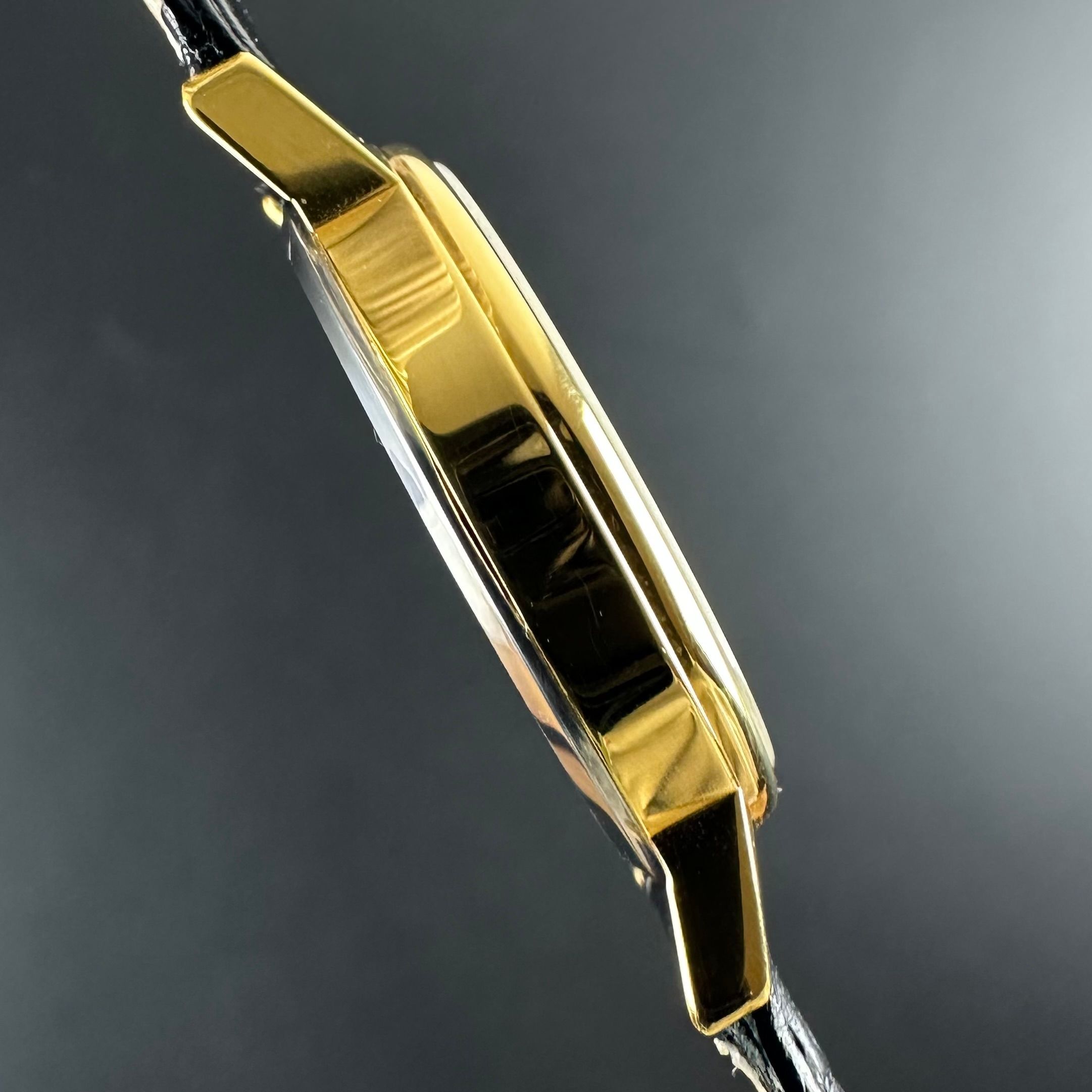Questo Omega De Ville vintage del 1979 presenta un quadrante nero con linee verticali ed eleganti accenti dorati. Alimentato da un movimento al quarzo Calibro 1332, completamente revisionato nel luglio 2025, funziona perfettamente e tiene il tempo con precisione. La cassa placcata oro da 32,5 mm è in ottime condizioni, completata da un cinturino in pelle nera con grana di coccodrillo (l'unico componente non originale). Questo orologio è splendidamente conservato. Un'ottima aggiunta a qualsiasi collezione.