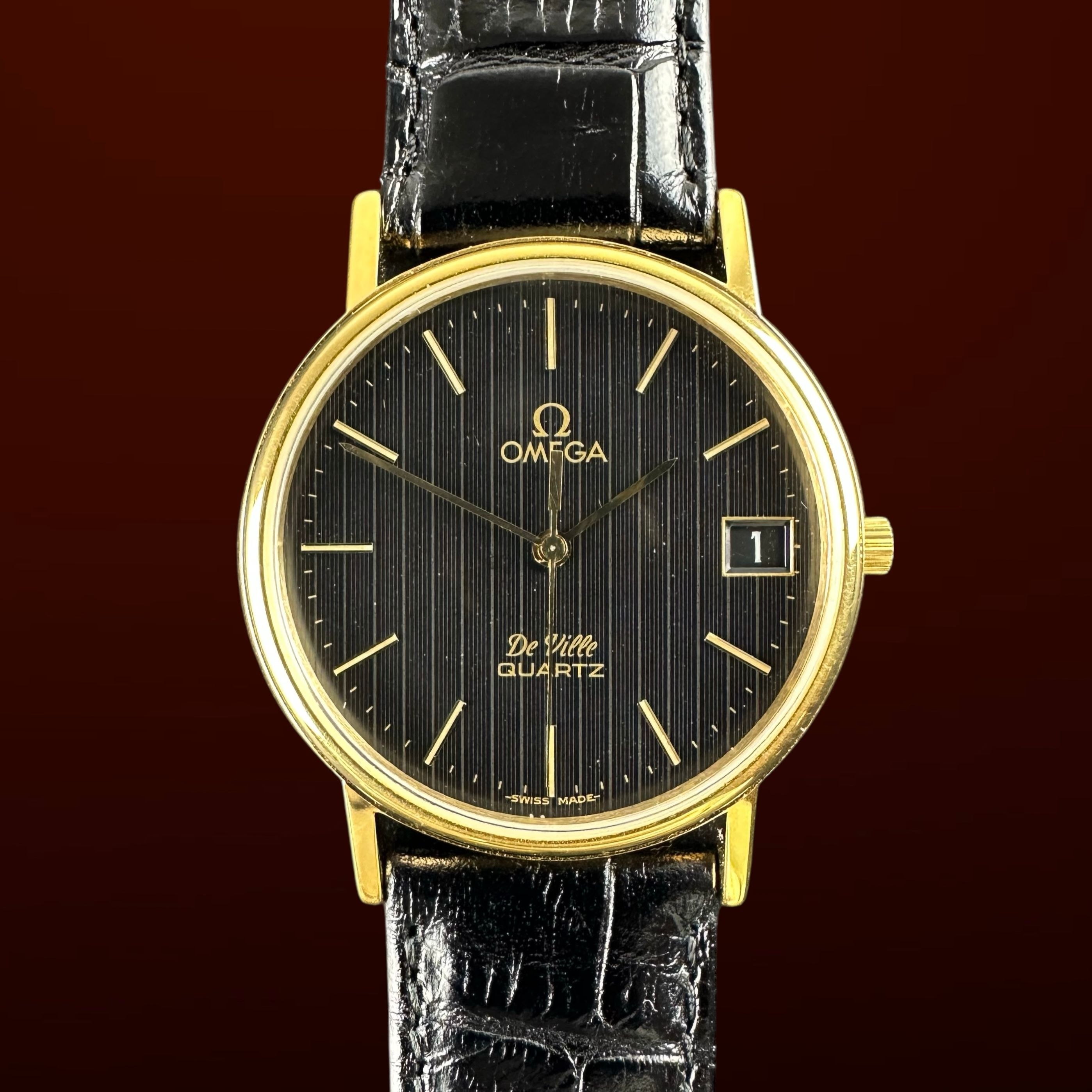 This vintage 1979 Omega De Ville features a black dial with vertical lines and elegant golden accents. Powered by a quartz Caliber 1332 movement, fully serviced in July 2025, it runs flawlessly and keeps time with precision. The 32,5mm gold-plated case is in great condition, complemented by a black crocodile grain leather strap (the only non-original component). This watch is a beautifully preserved. A great addition to any collection.Year of production: 1979