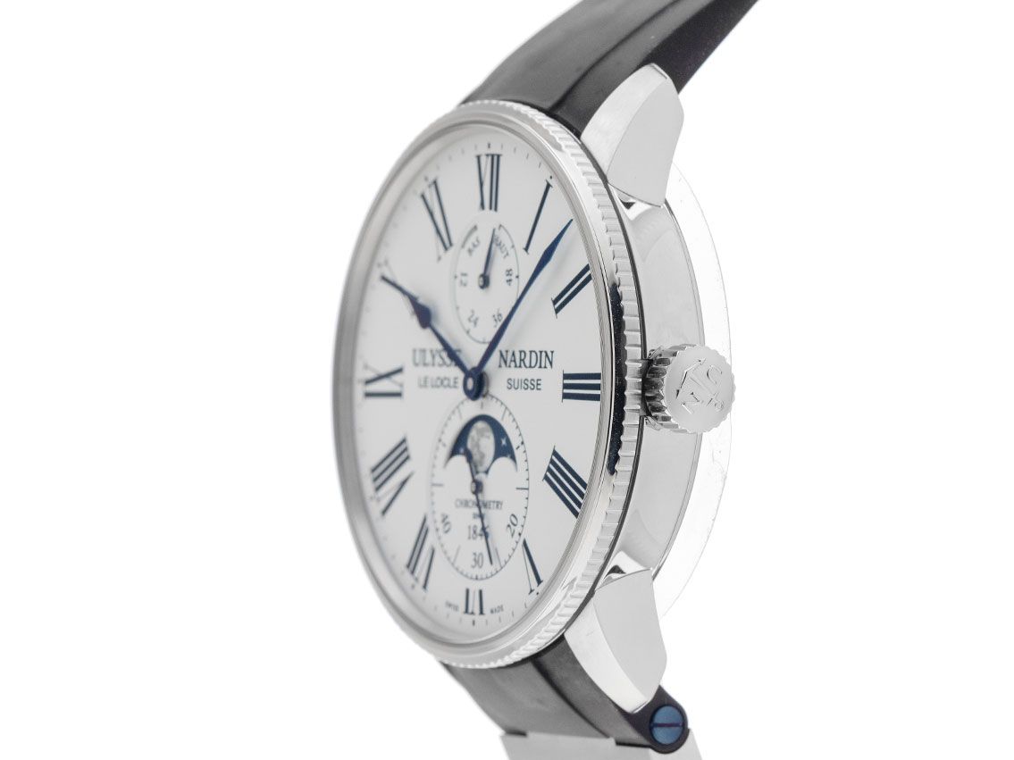 Gehäuse Edelstahl poliert, Gehäusedurchmesser ohne Krone 42mm, Gehäusehöhe 11,4mm. Lünette Edelstahl poliert e geriffelt. Fascia da braccio Kautschuk schwarz, Anstoßbreite 21mm, Sicherheitsfaltschließe Titan mit Hersteller-Logo. Zifferblatt weiß con Ziffern römischen schwarzen e gebläuten Zeigern. Uhrwerk Automatik, Chronometer mit Zeugnis, Ulysse Nardin Manufakturkaliber UN-119 mit 45 Edelsteinen. Anzeige von Stunde und Minute über Zeiger aus der Mitte, kleine Sekunde mit Sekundenstopp zur sekundengenauen Einstellung der Uhrzeit bei 6 Uhr, Mondphasenanzeige bei 6 Uhr. Saphirglas kratzfest. Krone verschraubbar con logo dell'azienda. Corpo Edelstahl 6-fach verschraubt e graviert con Saphirglas Sichtfenster. Peso dell'orologio con la fascia da braccio 98g, lunghezza della fascia da braccio con il Gehäuse 200mm. Numero di riferimento: 1193-310LE-0A-175, ID: KS1556140000725H-10400, Artikelnummer: 10000081640. Con Gangkontrolle e una completa lavorazione a partire da luglio 2025. Scatola originale Ulysse Nardin con Umkarton e carta di garanzia del dicembre 2021 e Kaufrechnung, Wechselband Leder mit Faltschließe und Watchregister Auszug von Juli 2025, The Watch Register Zertifikat / ohne Eintrag (Internationale Datenbank für verlorene oder gestohlene Uhren), Set completo. Limitato a 300 esemplari. Superschnäppchen, Kapitalanlage mit Wertsteigerungspotential, sehr seltenes Sammlerstück. Come nuovo. Lieferzeit sofort.