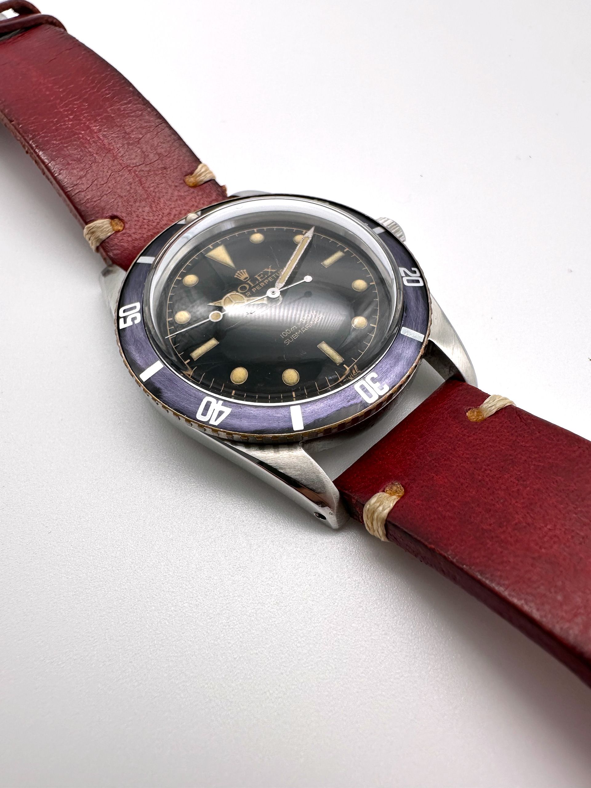 Deze Rolex 6536 heeft niet meer zijn originele stalen band. Het horloge wordt geleverd met een naar onze mening bijpassende rode lederen band. Er zitten geen toebehoren bij. De kast verkeerd eveneens in nette staat.