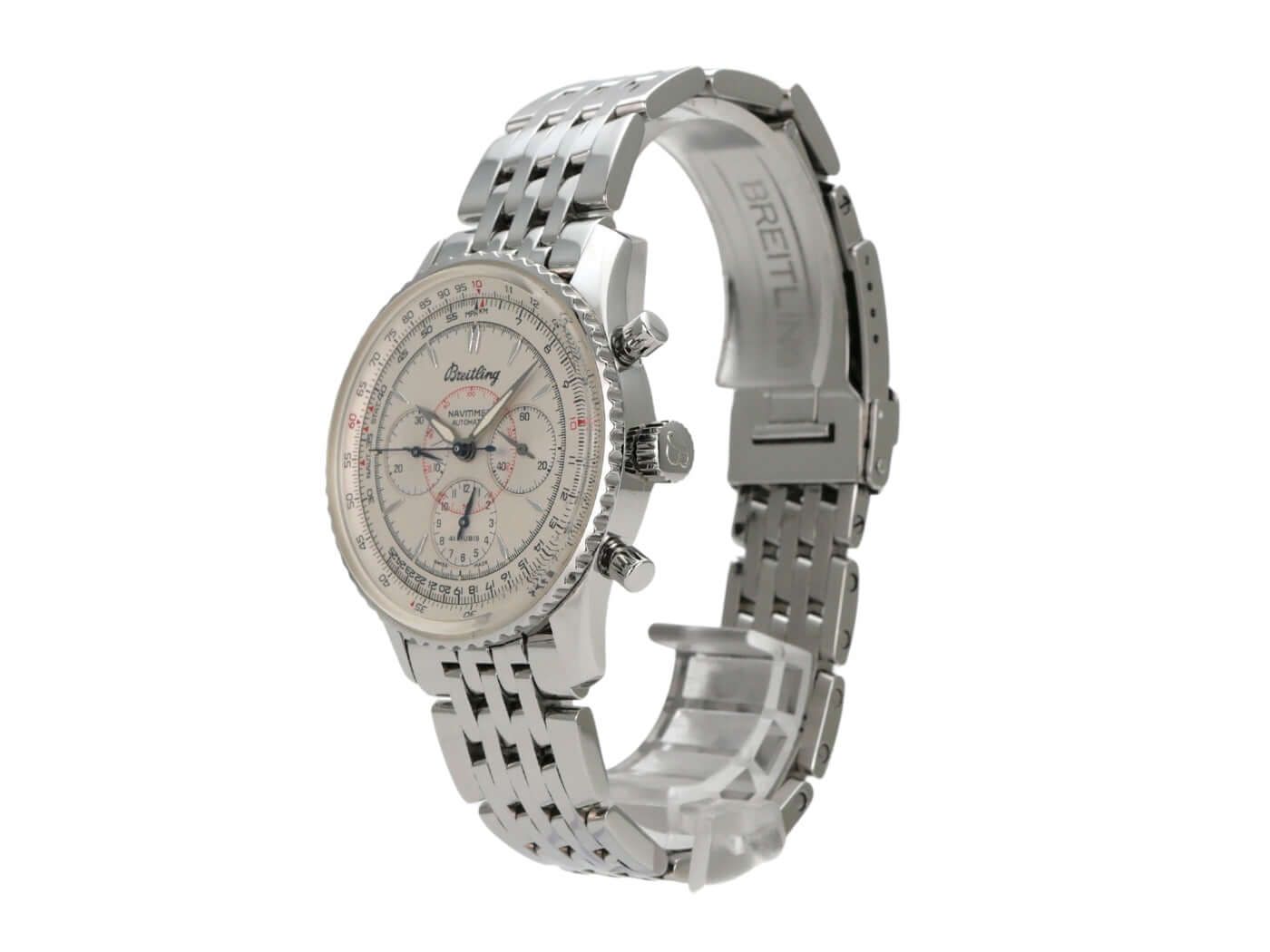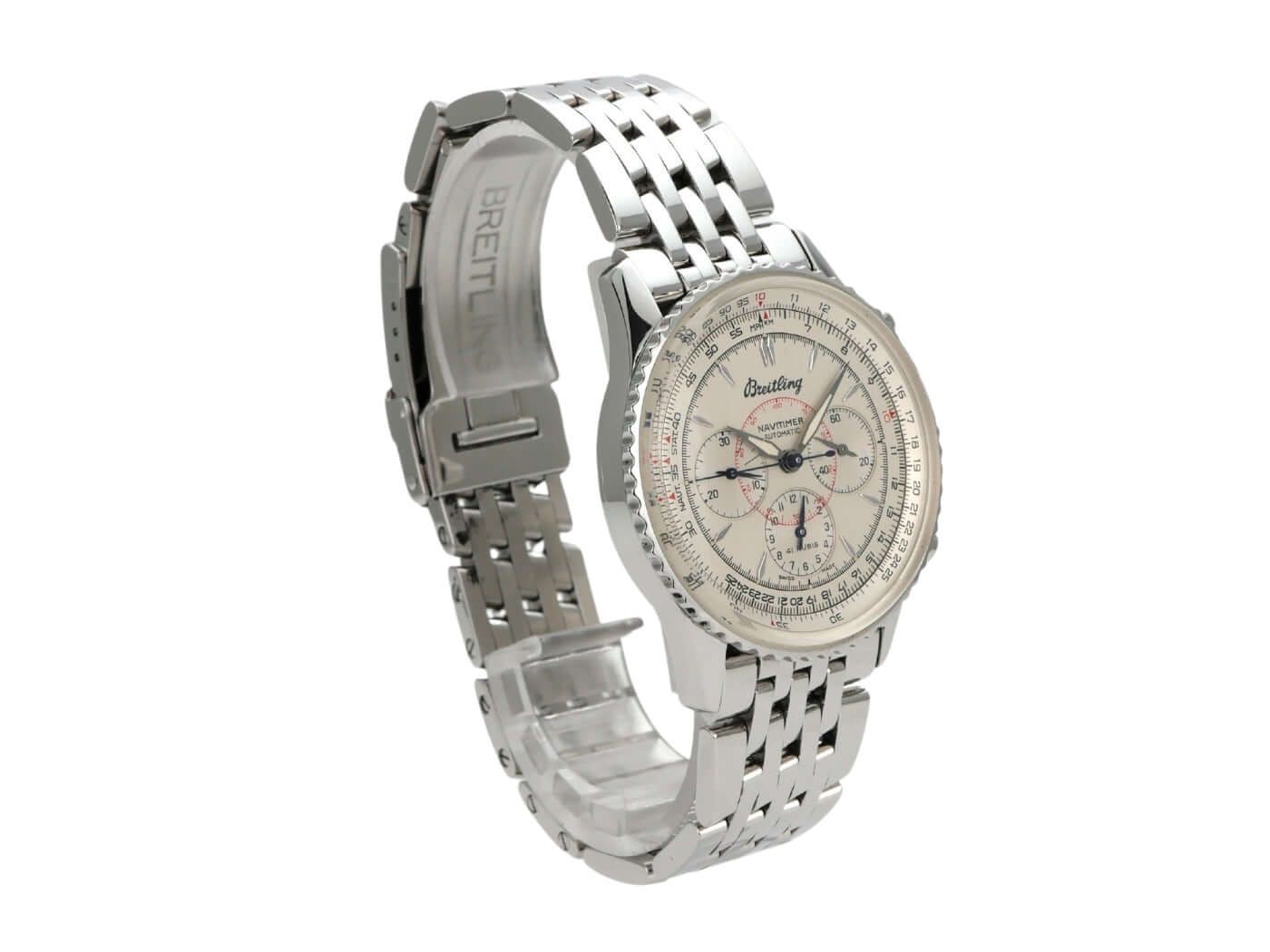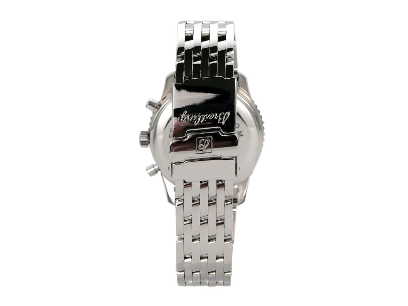Cassa in acciaio lucido, diametro cassa 38 mm, altezza cassa 13 mm, lunetta in acciaio con calcolatore girevole su entrambi i lati, bracciale in acciaio lucido con chiusura pieghevole di sicurezza, quadrante color argento, movimento automatico, cronografo, calibro Breitling 30 con 41 rubini, 28.800 A/h, fondo in acciaio avvitato e inciso, impermeabile fino a 3 bar. Orologio usato, in ottime condizioni, completo di scatola e documenti, consegna in Germania del 2002.