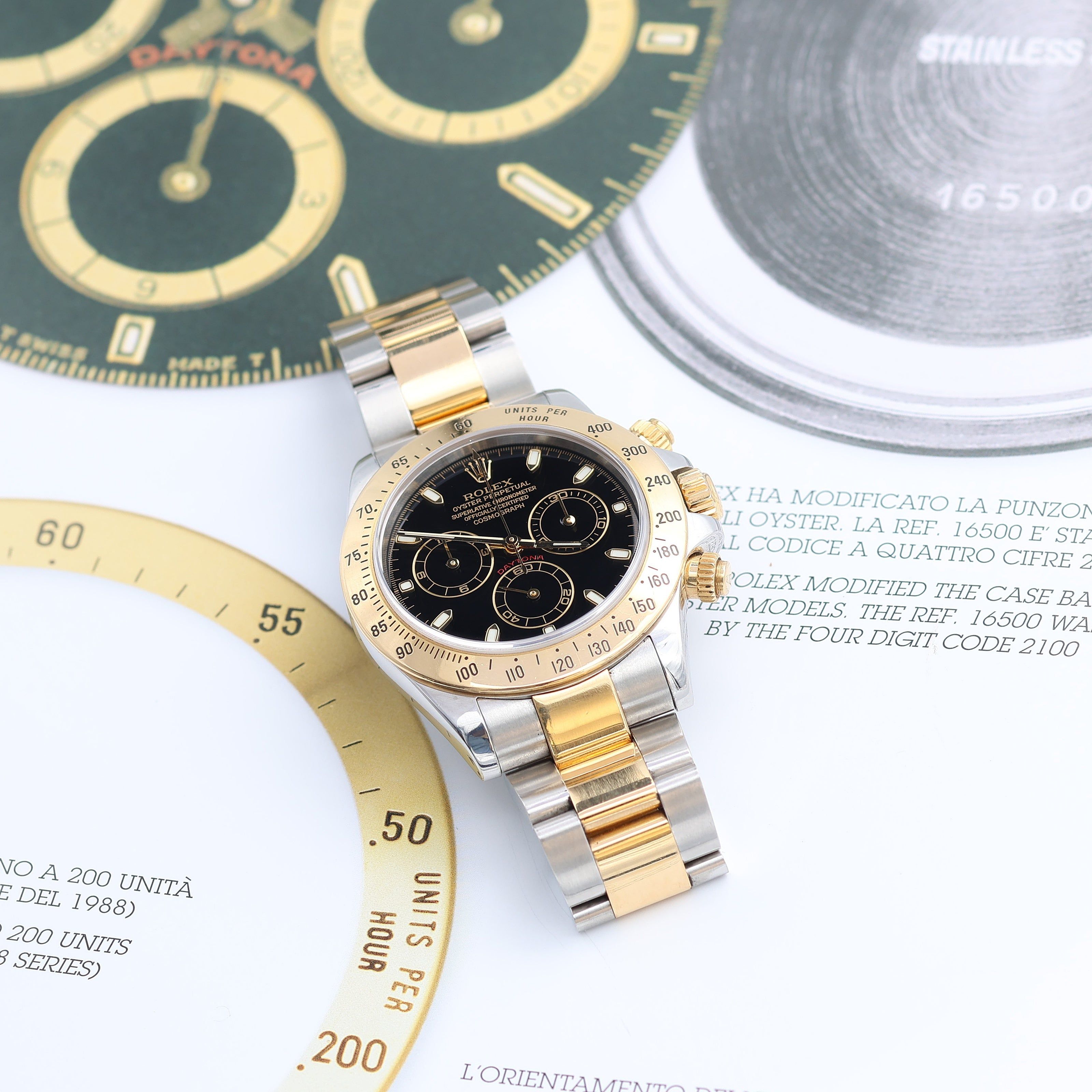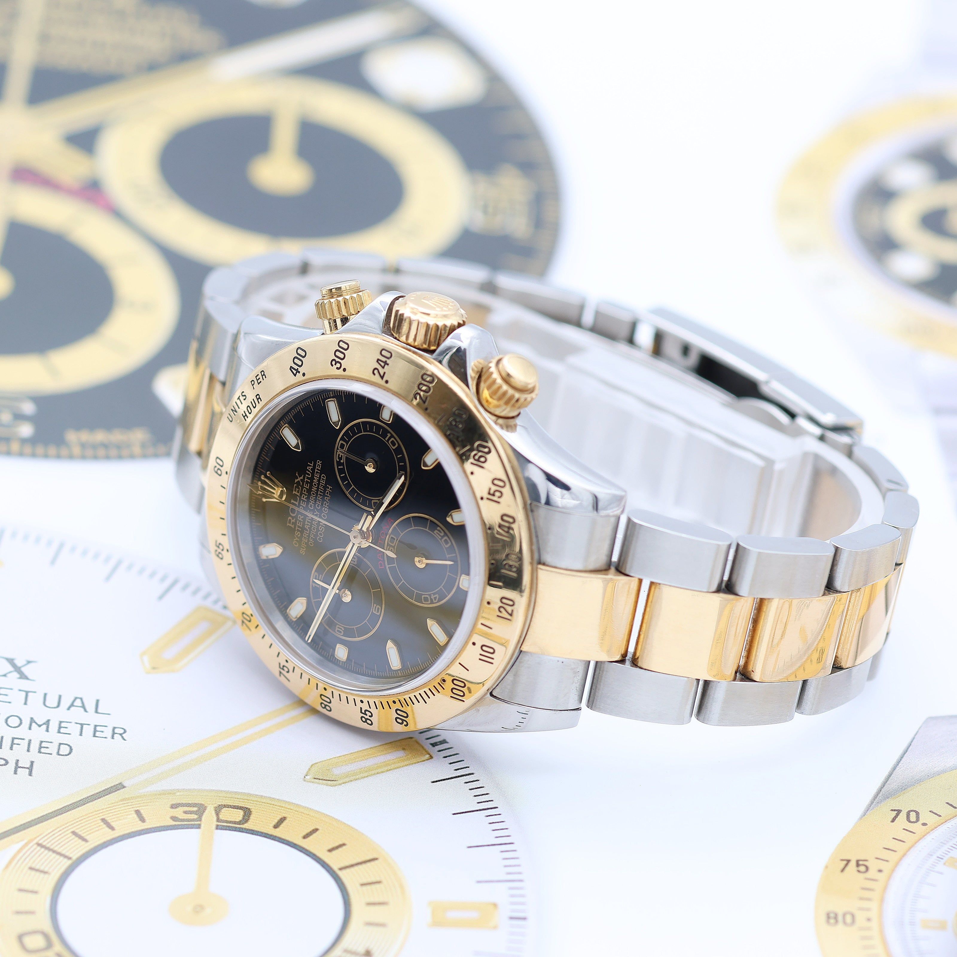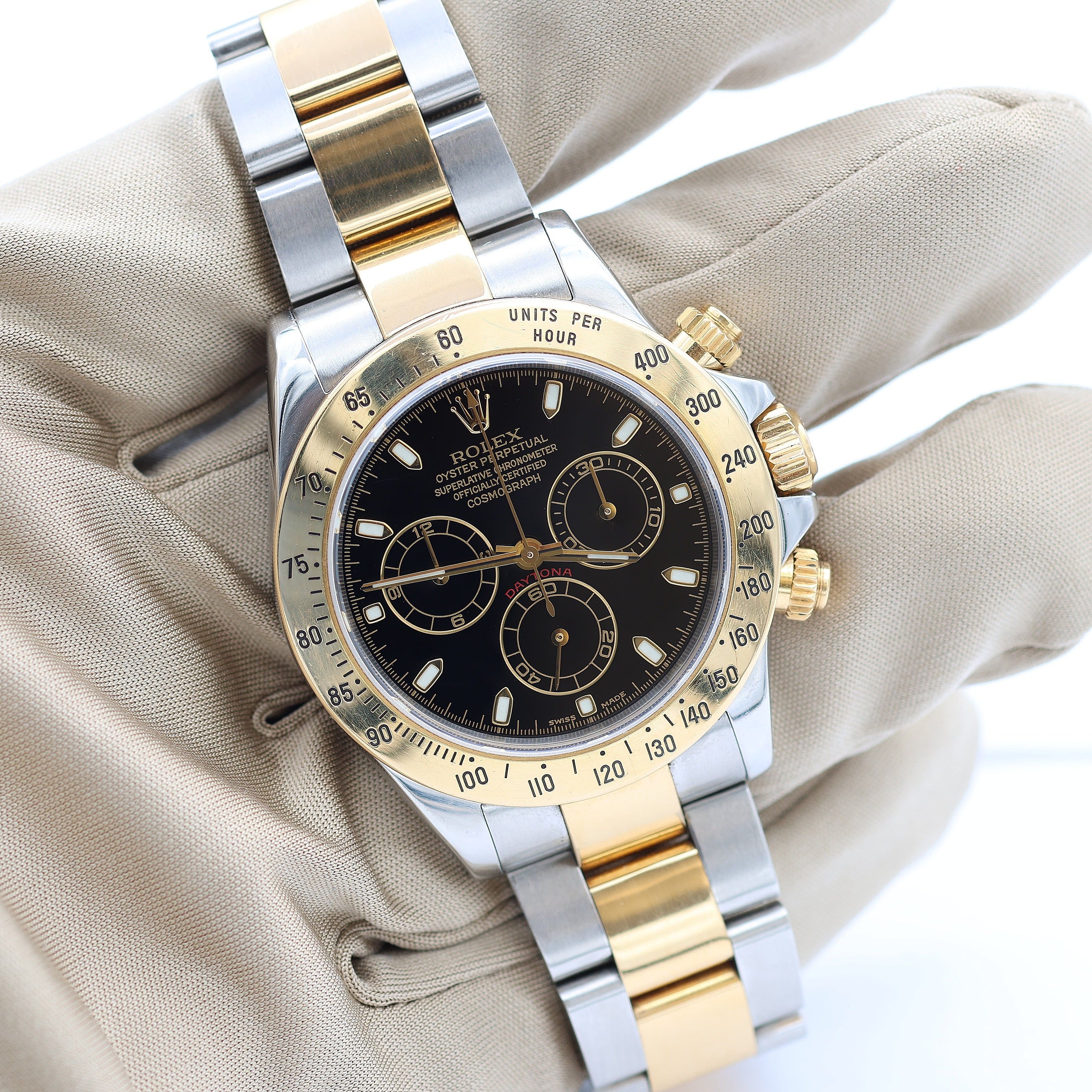 For sale at Debonar Watches: pre-owned Rolex Daytona 116523 in excellent conditions, full set. With its two-tone coloring, steel and 18k gold, it has arguably the most versatility compared to its all steel and all gold stable mates. This chronograph was designed to be the ultimate timing tool for endurance racing drivers. More than 50 years after its creation, the Cosmograph Daytona remains in a class of its own among sport chronographs and continues to transcend time.Synonymous with excellence and reliability, this Rolex is designed for everyday wear, and depending on the model, perfectly suited for a wide range of sports and other activities.The Daytona is designed for those with a passion for driving and speed.Story:While the Daytona is now widely loved and worn by everyone from the newbie collector to your boss’s boss, the Rolex Daytona is firstly a racing watch.It was made for motorsport professionals and was named after the famous Daytona Beach in Florida, where numerous land speed records were broken.Introduced in 1963, the reference 6239 Daytona was the first Rolex chronograph with a tachymeter bezel that allowed its wearer to measure the speed of an object. The watch gained traction in the racing world but did not gain widespread acceptance until later, thanks in part to a handsome actor/race car driver named Paul Newman. Born in the late '80s, this reference became the first Cosmograph to offer a combination platter of metals.Over the years, the model has seen various updates and has become one of the most desirable watch models in the world. BRAND ROLEX MODEL DAYTONA REFERENCE 116523 CASE MATERIAL STEEL/GOLD MOVEMENT AUTOMATIC DIMENSION 40 MM DIAL BLACK BEZEL GOLD CRYSTAL SAPPHIRE BRACELET TYPE BRACELET BRACELET MATERIAL STEEL/GOLD BRACELET LENGHT 17 CM ORIGINAL BOX YES ORIGINAL PAPERS YES YEAR APPROX. '00s-'10s CONDITION EXCELLENT