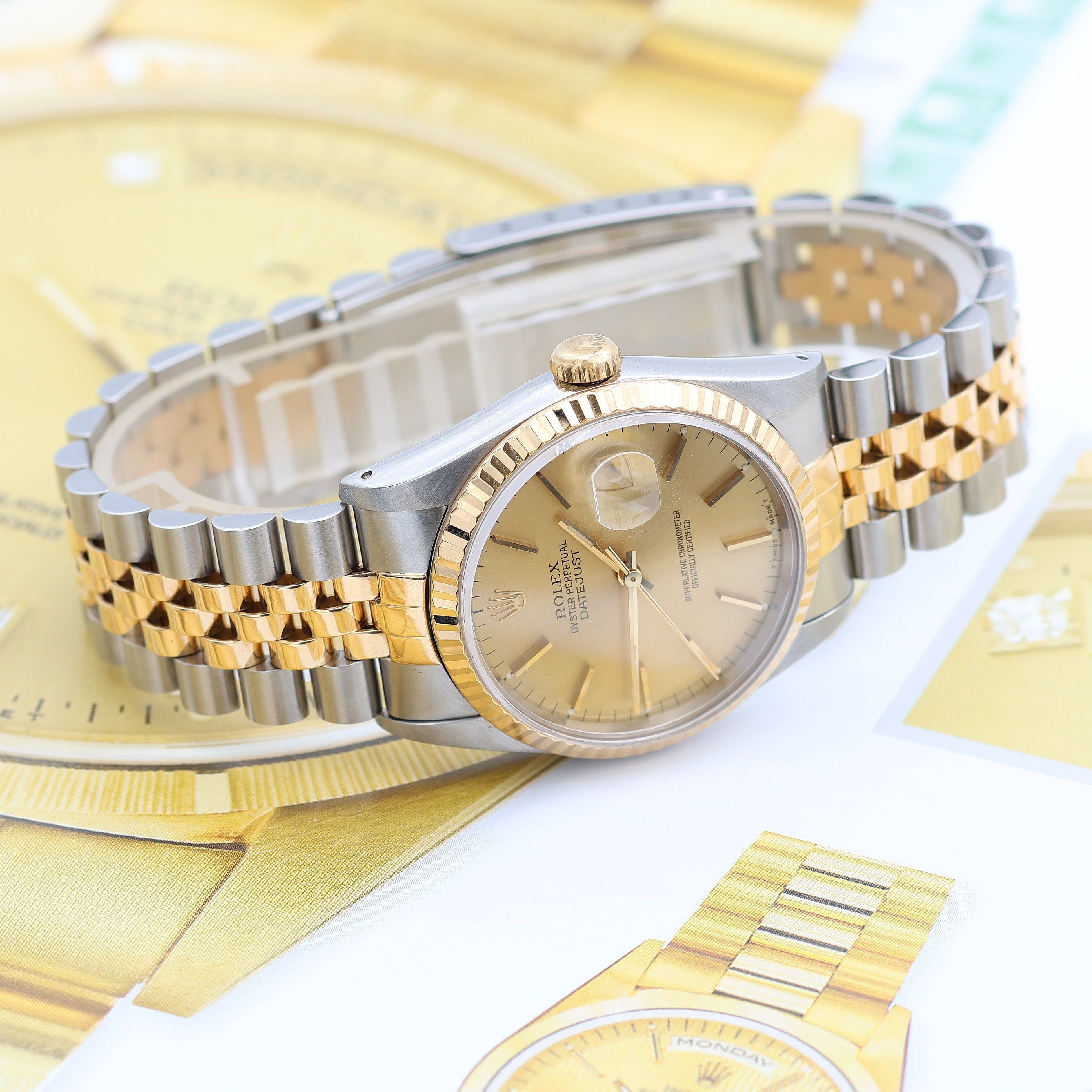 For sale at Debonar Watches: pre-owned Rolex Datejust 16233 in steel and 18k yellow gold.Fluted yellow gold bezel on a Jubilee bracelet, with an elegant champagne dial.The Rolex Datejust reference 16233 first made its appearance in 1988, boasting notable upgrades over its predecessor.The ref. 16233 was the direct replacement for the ref. 16013, which is sometimes known as the American Psycho Rolex.This reference maintained the classic 36mm case diameter from years past, which while a bit on the modest side by today’s standards still wears very well on a range of wrist sizes.Even though the series came to an end in the mid 2000’s, the Datejust ref. 16233 is a thoroughly modern version of the watch, and one with the classic two-tone Rolex look. BRAND ROLEX MODEL DATEJUST REFERENCE 16233 CASE MATERIAL 18K GOLD AND STEEL MOVEMENT AUTOMATIC DIMENSION 36 MM DIAL CHAMPAGNE BEZEL 18K GOLD CRYSTAL SAPPHIRE BRACELET TYPE JUBILEE BRACELET MATERIAL 18K GOLD AND STEEL BRACELET LENGHT 16,5 CM ORIGINAL BOX NO ORIGINAL PAPERS NO YEAR APPROX. THE '90s CONDITION VERY GOOD