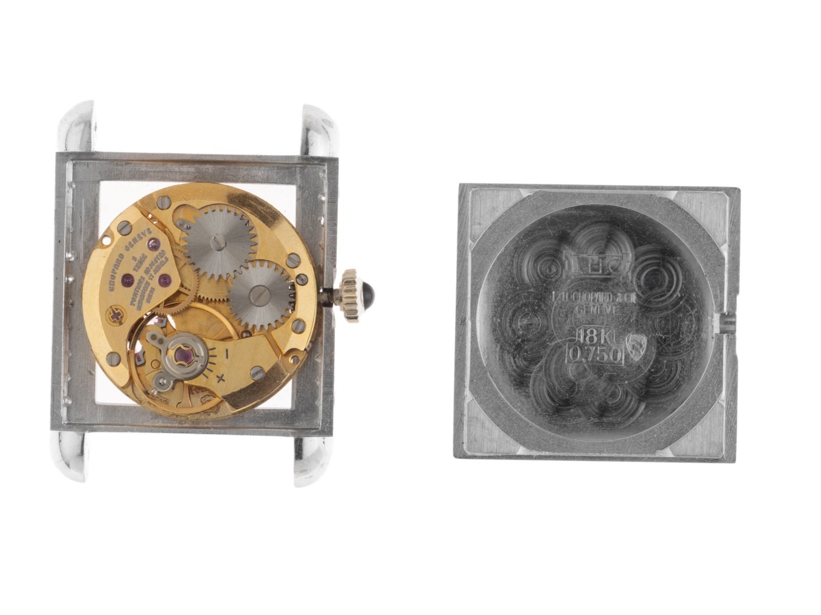 Gehäuse 18kt Weißgold poliert, rechteckig, Gehäusemaße ohne Krone (L x B x H) 28 x 21x 5,7mm. Lünette 18kt Weißgold glatt und poliert mit 88 Brillanten besetzt zusammen ca. 1,66ct TW / VVSI (feines Weiß mit sehr sehr kleinen Einschlüssen). Fascia da braccio Krokoleder schwarz mit Ziernaht, Anstoßbreite 15mm, Chopard Stiftschließe Edelstahl. Zifferblatt schwarz e Edelstahl Zeigern. Uhrwerk Handaufzug, Kaliber Chopard. Anzeige von Stunde und Minute über Zeiger aus der Mitte. Mineralglas. Corona con cabochon. Corpo 1kt Weißgold graviert e 4-Fach verschraubt. Peso dell'orologio, compreso il bracciale, 22 g. Numero di riferimento: 5054, Gehäusenummer: 99XXX, Baujahr: 1986, ID: P134544000825H-8300, Artikelnummer: 10000081834. Mit Gangkontrolle und kompletter äußerlicher Aufarbeitung von August 2025. Scatola originale Chopard. Superschnäppchen, extrem seltenes Sammlerstück, Tresoruhr, fast nicht getragen. Ottimo stato. Lieferzeit sofort.