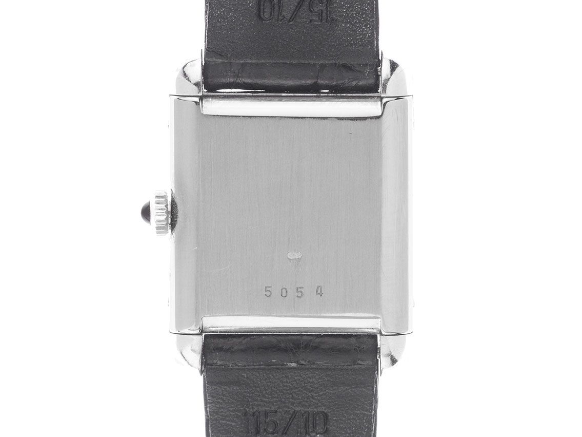 Chopard Tank 18kt Weißgold Handaufzug Armband LederGehäuse 18kt Weißgold poliert, rechteckig, Gehäusemaße ohne Krone (L x B x H) 28 x 21x 5,7mm. Lünette 18kt Weißgold glatt und poliert mit 88 Brillanten besetzt zusammen ca. 1,66ct TW / VVSI (feines Weiß mit sehr sehr kleinen Einschlüssen). Armband Krokoleder schwarz mit Ziernaht, Anstoßbreite 15mm, Chopard Stiftschließe Edelstahl. Zifferblatt schwarz und Edelstahl Zeigern. Uhrwerk Handaufzug, Kaliber Chopard. Anzeige von Stunde und Minute über Zeiger aus der Mitte. Mineralglas. Krone mit Cabochon. Boden 1kt Weißgold graviert und 4-Fach verschraubt. Gewicht der Uhr inklusive Armband 22g. Referenznummer: 5054, Gehäusenummer: 99XXX, Baujahr: 1986, ID: P134544000825H-8300, Artikelnummer: 10000081834. Mit Gangkontrolle und kompletter äußerlicher Aufarbeitung von August 2025. Original Chopard Box. Superschnäppchen, extrem seltenes Sammlerstück, Tresoruhr, fast nicht getragen. Sehr guter Zustand. Lieferzeit sofort.