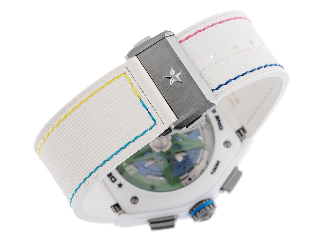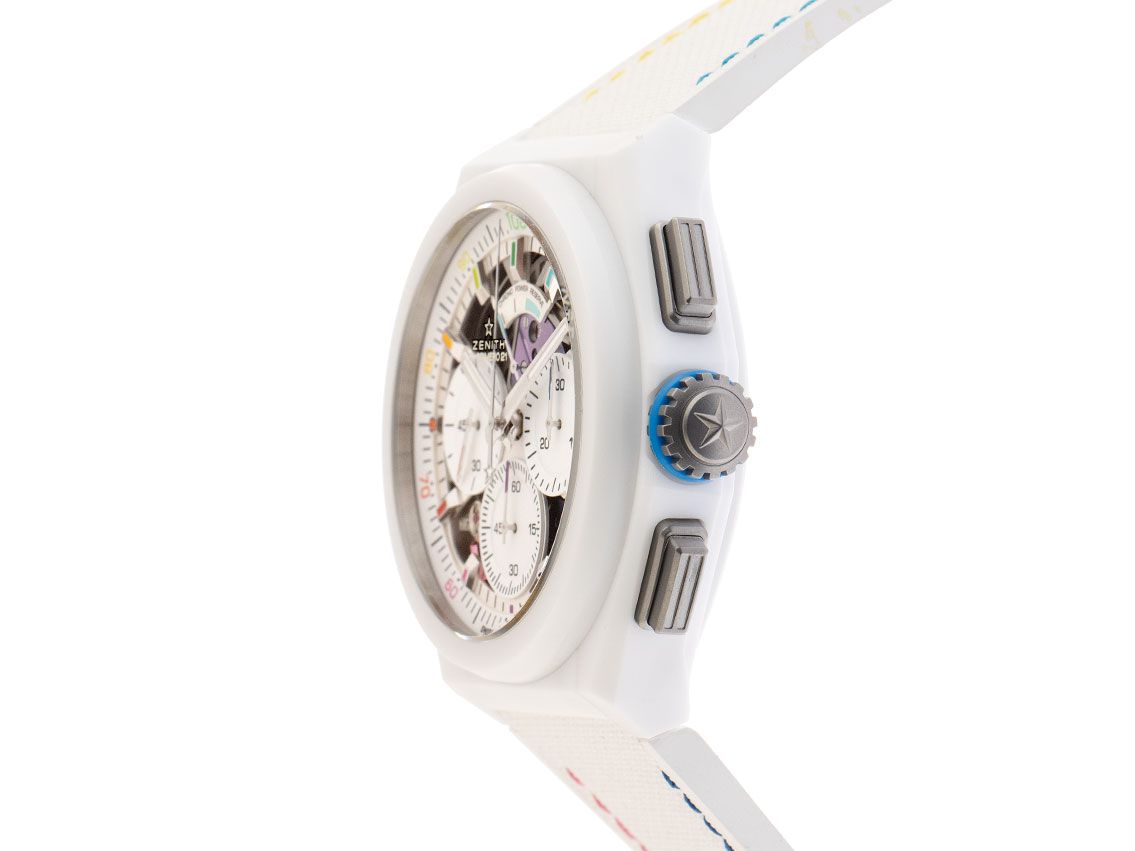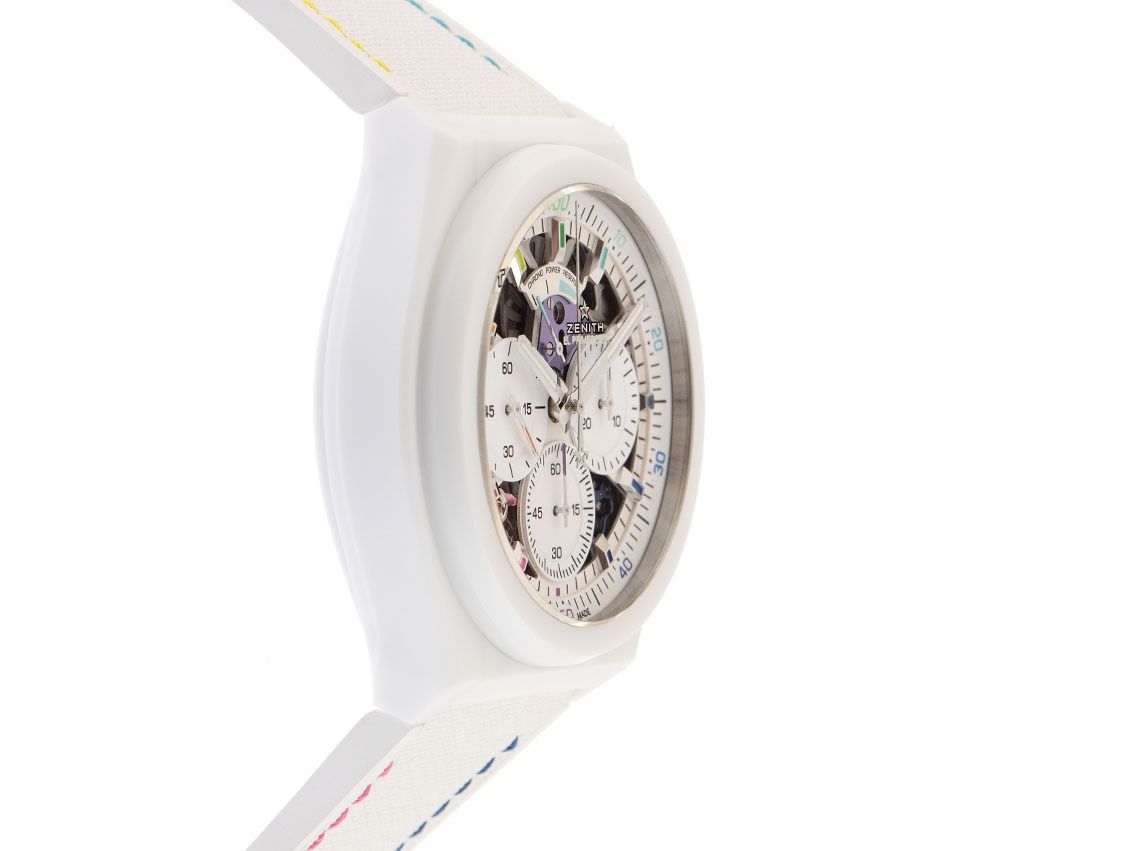Gehäuse Keramik satiniert, Gehäusedurchmesser ohne Krone 44mm, Gehäusehöhe 14,6mm. Lünette Keramik glatt e satinato. Fascia da braccio Kautschuk weiß con bunter Ziernaht, Anstoßbreite 26mm. Sicherheitsfaltschließe con logo dell'azienda. Zifferblatt scheletrato con indici Edelstahl Leucht e Edelstahl Leuchtzeigern. Uhrwerk Automatik, Chronograph, Manufakturkaliber El Primero 21 mit 53 Edelsteinen, Gangreserve ca. 50 Stunden. Anzeige von Stunde und Minute über Zeiger aus der Mitte, kleine Sekunde mit Sekundenstopp zur sekundengenauen Einstellung der Uhrzeit bei 9 Uhr, Gangreserveanzeige über Zeiger bei 12 Uhr. Saphirglas kratzfest. Krone con logo dell'azienda. Corpo Keramik 4-fach verschraubt e graviert con Saphirglas Sichtfenster. Peso dell'orologio, compresa la fascia da braccio, 126 g. Capacità di carico del liquido fino a 10 ATM. Numero di riferimento: 49.9014.9004/01.R953, ID: ST5806223920825H-16800, Artikelnummer: 10000081863. Scatola originale Zenith con cartone e carta di garanzia del 2025 e descrizione, set completo. Limitato a 500 esemplari. Non registrato. Lieferzeit sofort.