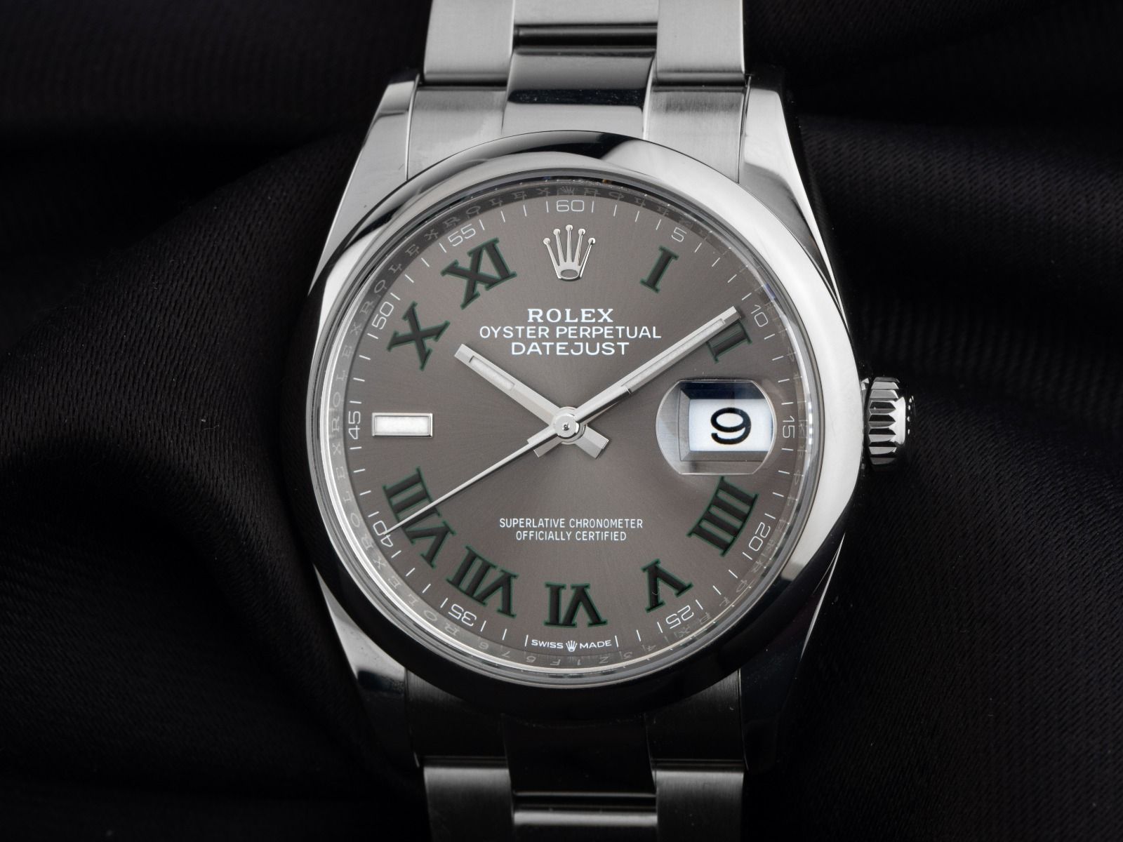 Rolex Datejust Wimbeldon Stahl Automatik Armband OysterGehäuse Edelstahl poliert und satiniert, Gehäusedurchmesser ohne Krone 36mm, Gehäusehöhe 11,6mm. Lünette Edelstahl glatt und poliert. Armband Oyster Edelstahl poliert und satiniert, Faltschließe Edelstahl mit Hersteller-Logo. Zifferblatt schiefergrau mit aufgesetzten weißgoldenem Index, dunkelgrünen römischen Ziffern und weißgoldenen Zeigern. Uhrwerk Automatik, Chronometer mit Zeugnis, Rolex Manufakturkaliber 3235 mit 31 Edelsteinen, ca. 70 Stunden Gangreserve. Anzeige von Stunde, Minute und Sekunde über Zeiger aus der Mitte mit Sekundenstopp zur sekundengenauen Einstellung der Uhrzeit, Datumsanzeige mit Schnellverstellung unter Glaslupe bei 3 Uhr. Saphirglas kratzfest. Krone verschraubbar mit Hersteller-Logo. Boden Edelstahl verschraubt. Gewicht der Uhr inklusive Armband 123g, Länge des Armbandes inklusive Gehäuse 170mm. Wasserdicht bis 10 ATM. Referenznummer: 126200, Gehäusenummer: 43Z1FXXX, ID: P1374150120825H-11800/7650, Artikelnummer: 10000081920. Original Rolex Box mit Umkarton und Garantie Papiere von März 2022, neue Rolex Garantie Karte ohne Ländercode sowie Beschreibung, Ledermäppchen, Rolex Chronometer-Siegel und Watchregister Auszug von August 2025, The Watch Register Zertifikat / ohne Eintrag (Internationale Datenbank für verlorene oder gestohlene Uhren), inkl. Erstkaufrechnung, Full Set. Wie Neu. Lieferzeit sofort.