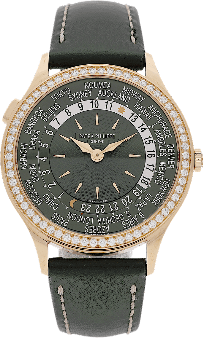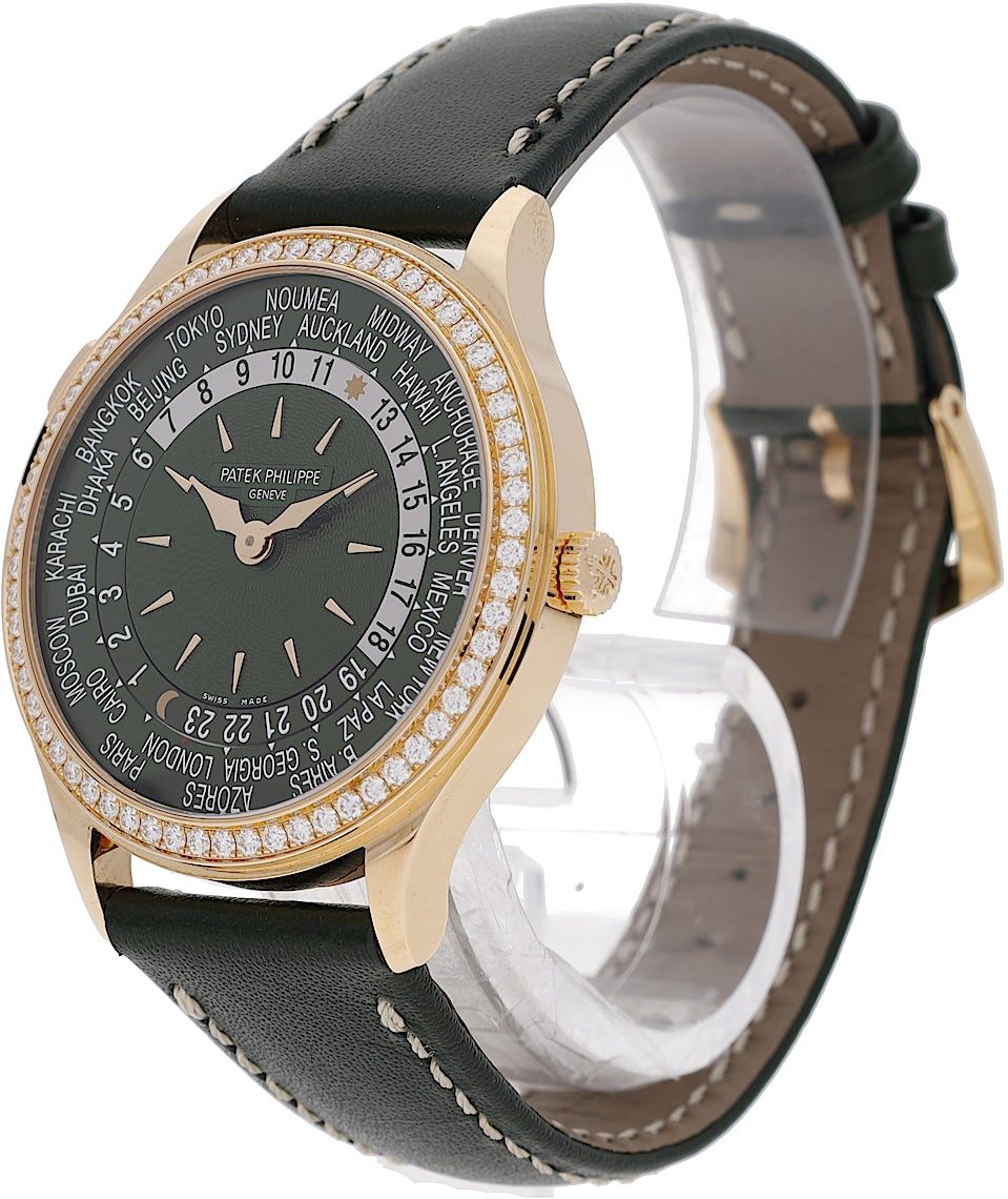 Patek Philippe World Time, Reference: 7130R-014, Gender: Unisex, Size: 36mm, Dial color: Green, Strap material: Calf Leather, Movement: Automatic, Year: 2023, Condition: New and unworn. An inspection by our certified watchmakers guarantees authenticity., Documents: Original papers, CHRONEXT Certificate