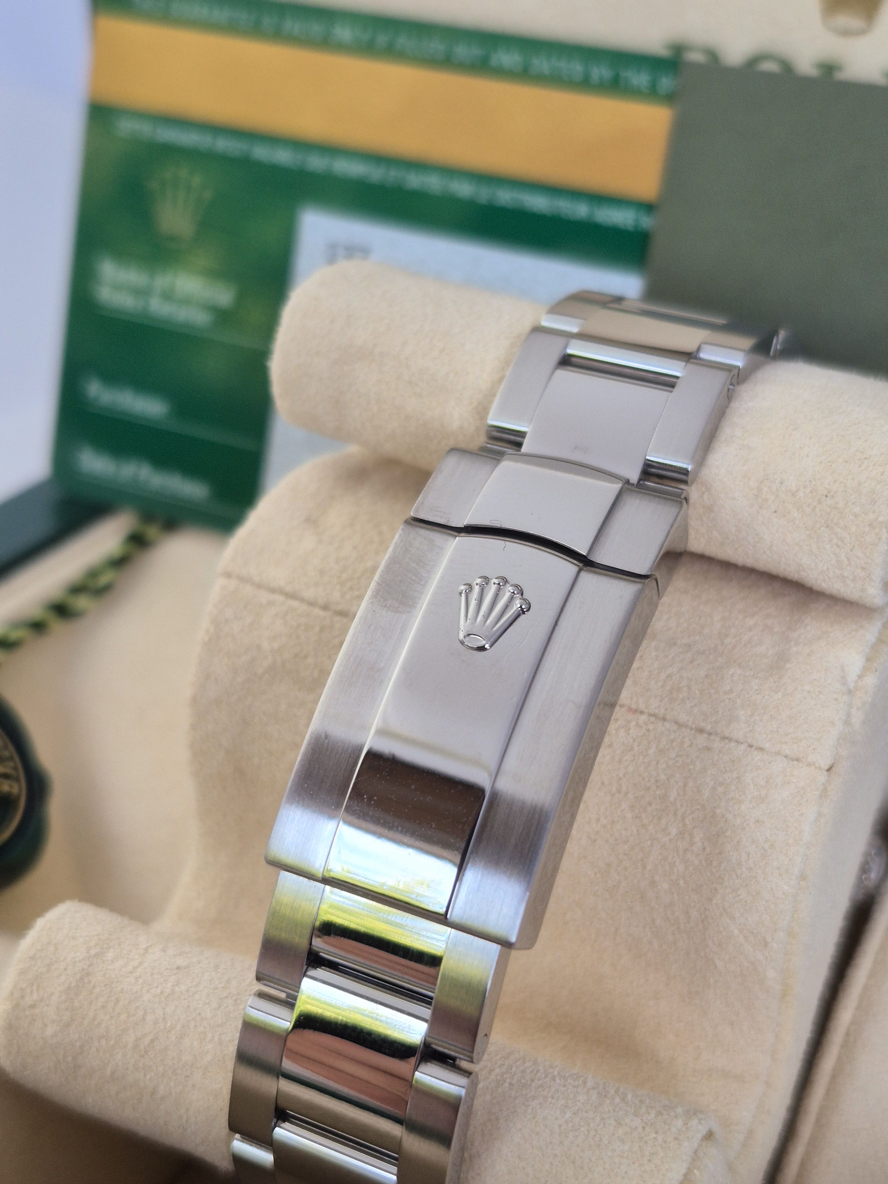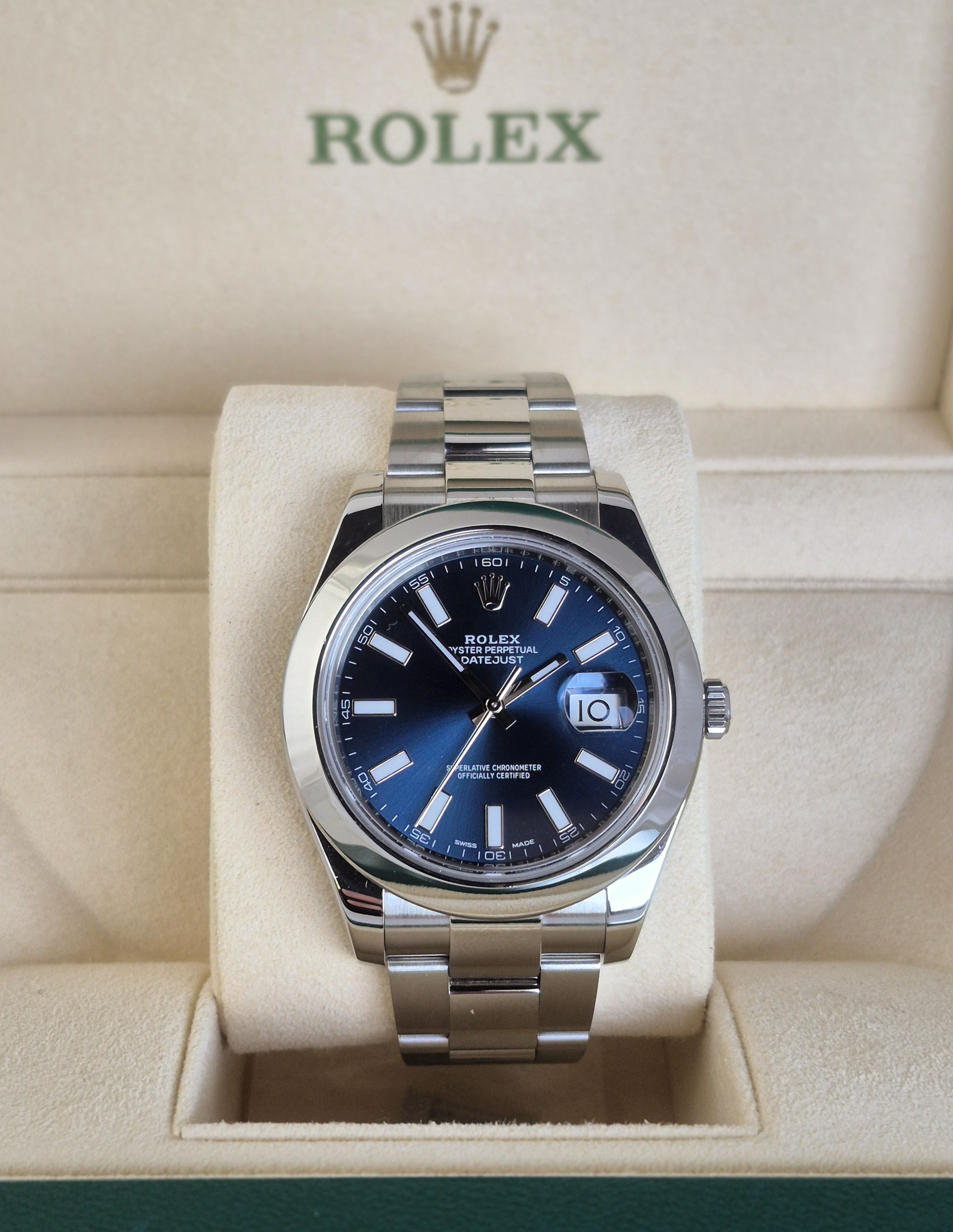 Appena uscito da un servizio completo e presentato in condizioni eccellenti. Questo orologio combina un'eleganza sobria con una presenza moderna: la lunetta liscia conferisce un aspetto calmo e raffinato, mentre il quadrante blu intenso gioca meravigliosamente con la luce - sottile ma sorprendente al polso.