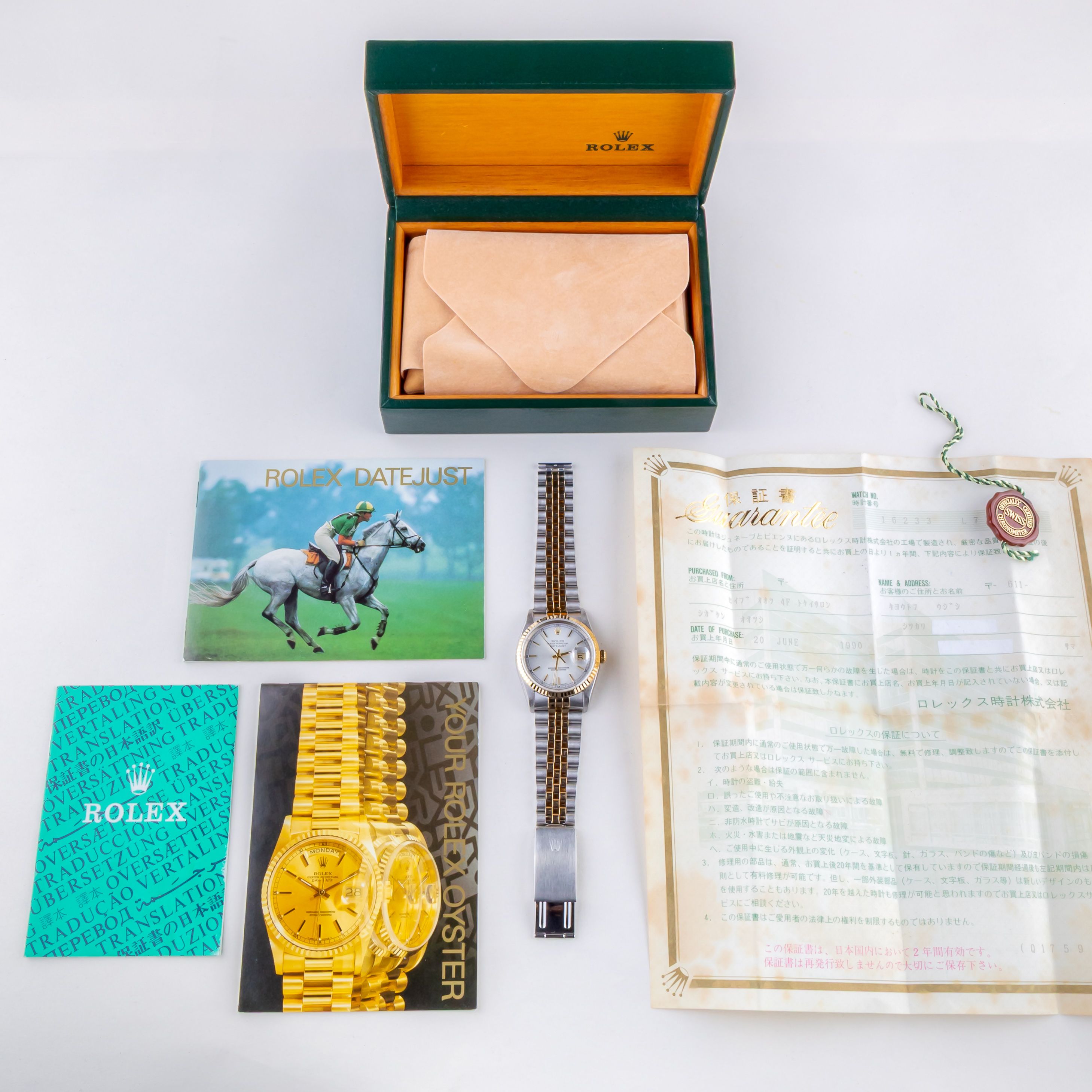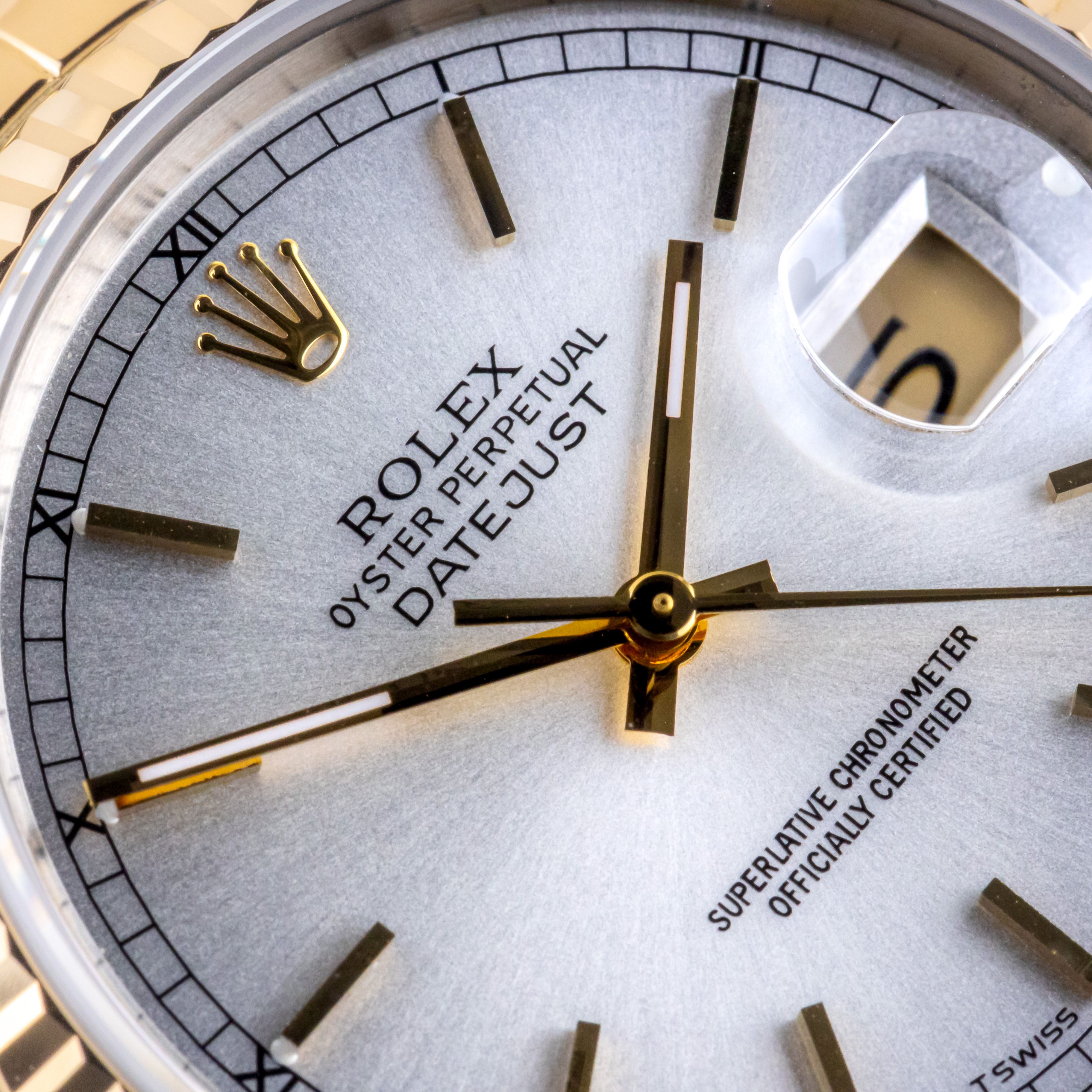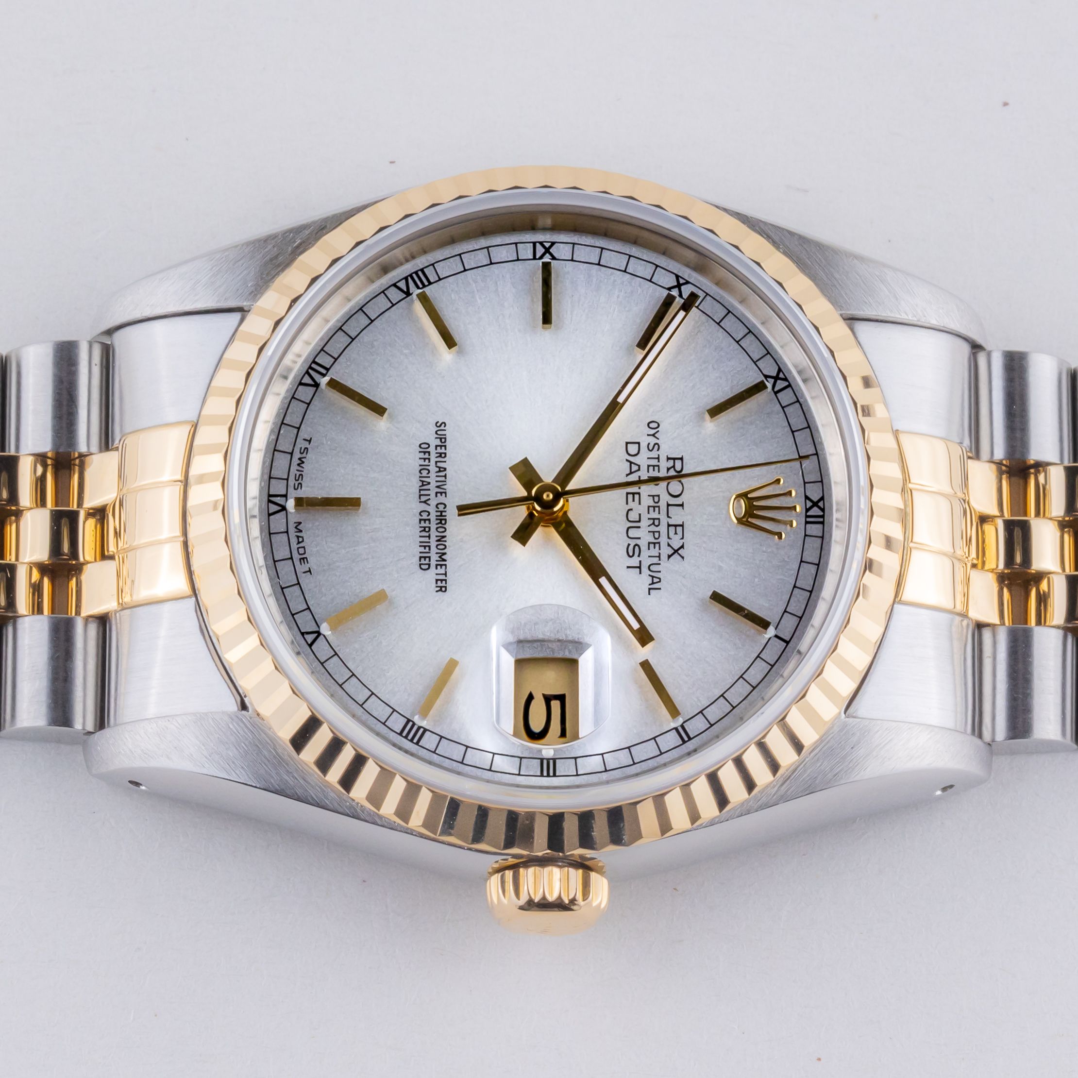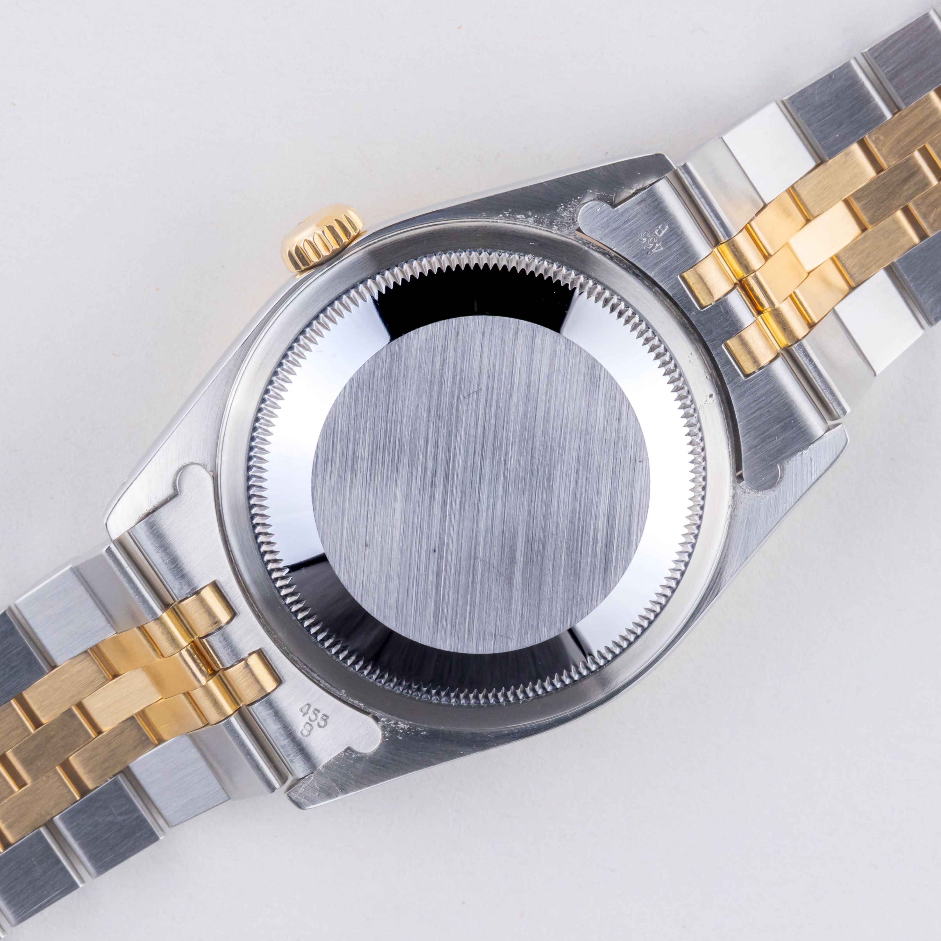Rolex Oyster Perpetual Datejust referenza 16233 del 1989 con set completo. Il Datejust 16233 ha una cassa di 36 mm in oro e acciaio inossidabile, un bracciale jubilee bicolore e una lunetta scanalata in oro 18k. Questo Datejust 16233 è dotato di un movimento automatico calibro 3135 con funzione di data rapida, vetro zaffiro antigraffio e quadrante argentato con lancette al trizio.