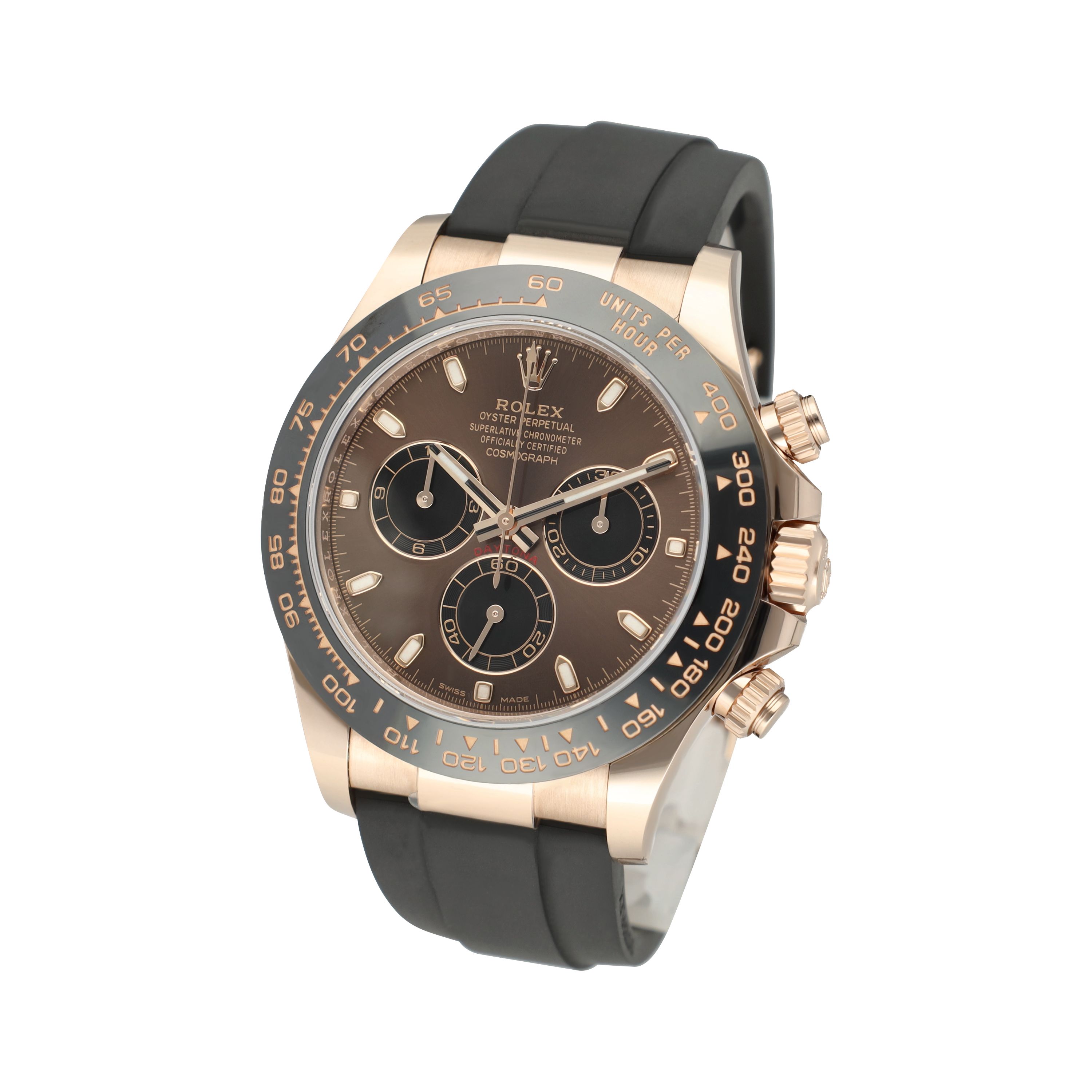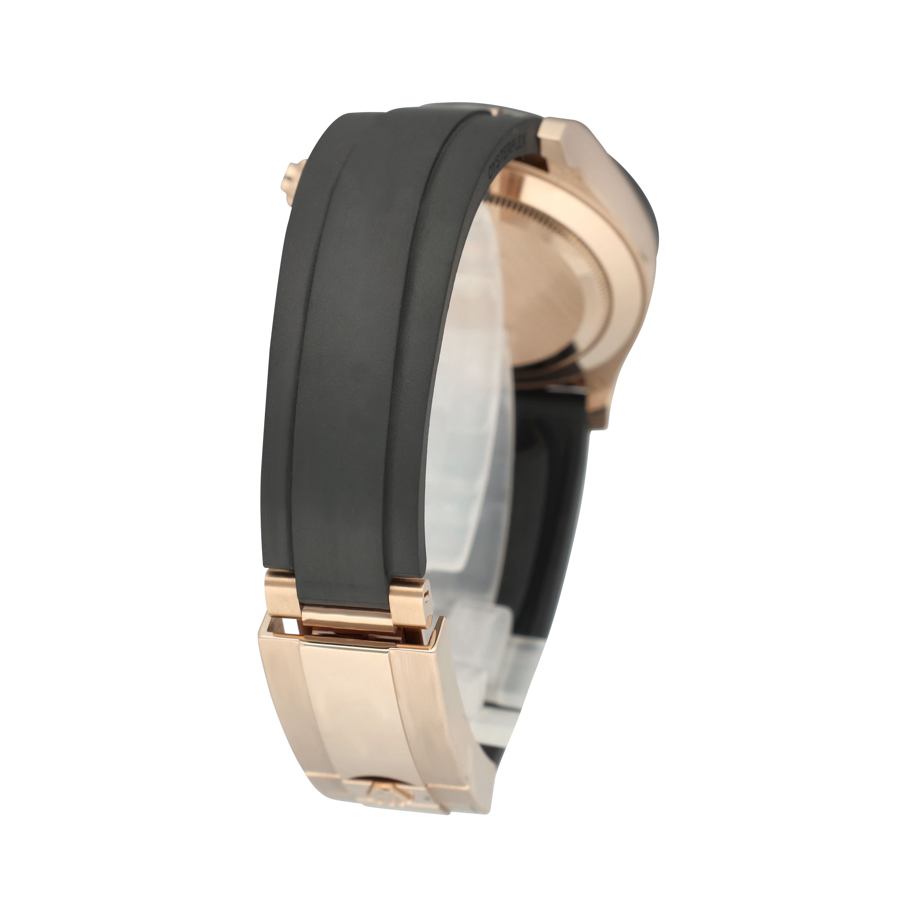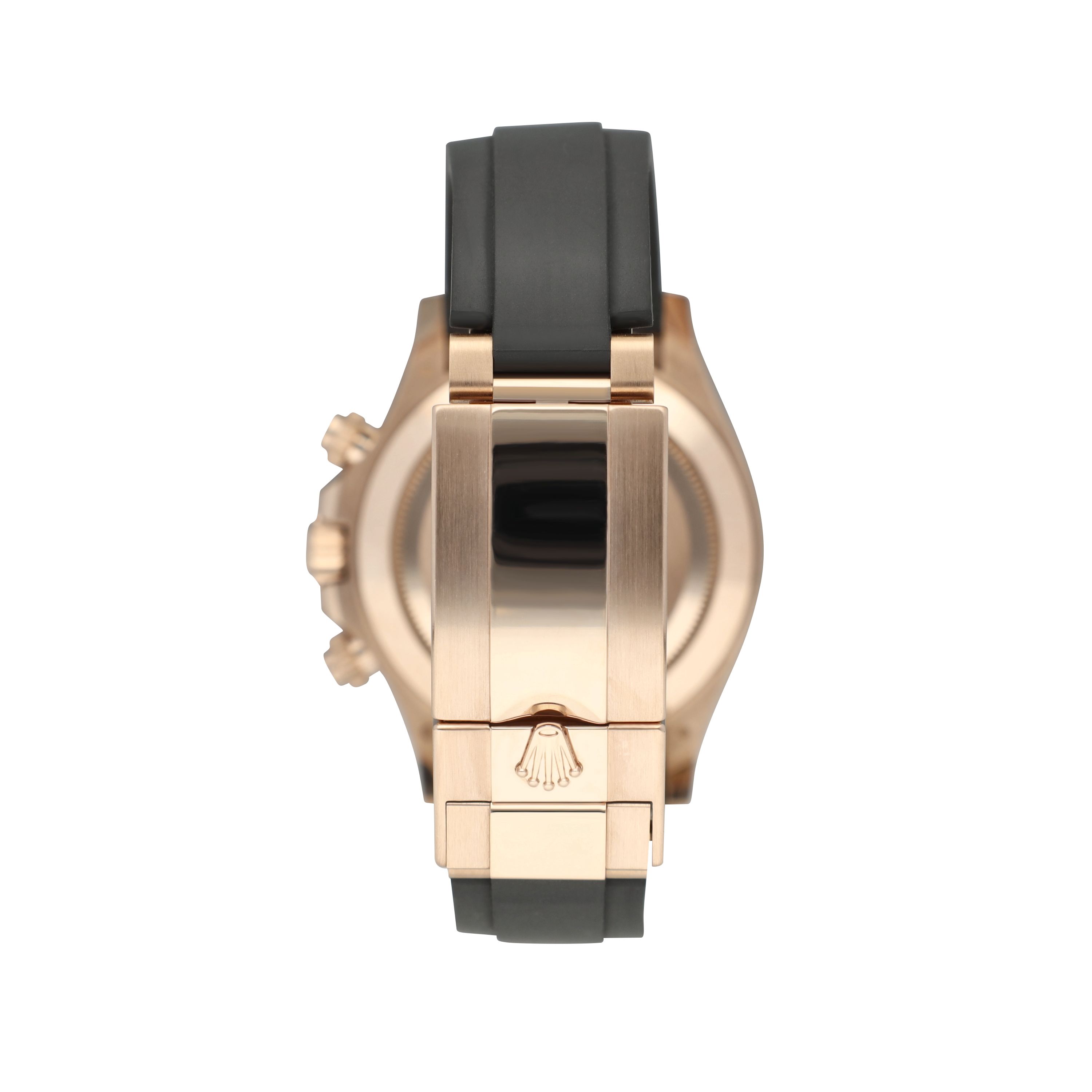 The 40 mm case is made from 18-carat Everose gold, fitted with a black Cerachrom ceramic bezel engraved with a tachymeter scale. The watch is worn on a black Oysterflex bracelet, combining the durability of a rubber strap with the comfort and stability of an internal metal blade.