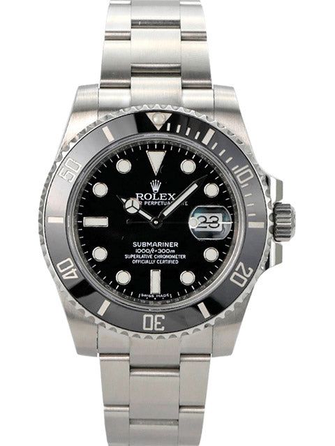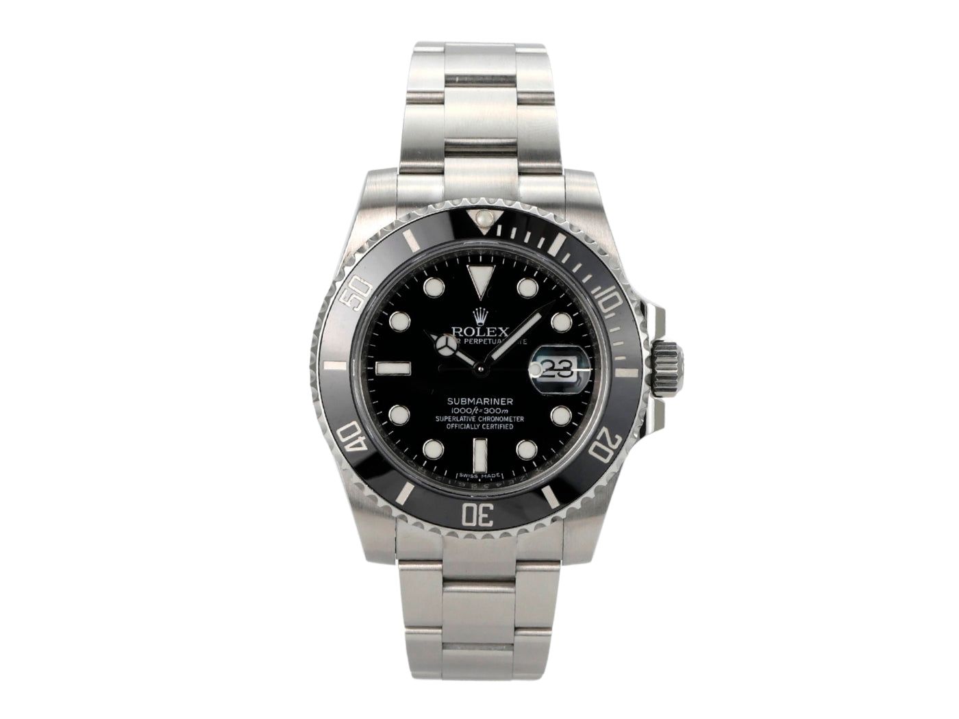 Rolex Submariner Date Ref. 116610LN stainless steel LC100 from 2018Case made of polished and satin-finished stainless steel, case diameter 40 mm, case height 12.5 mm, stainless steel bezel with black ceramic insert, 60-minute scale and luminous dot rotatable, Oyster stainless steel bracelet polished and satin-finished with safety folding clasp, black dial with applied luminous indices and luminous dots, luminous hands, automatic movement, Rolex caliber 3135 with 31 jewels, 28,800 A/h, chronometer, date display with quick adjustment and magnifier, sapphire crystal, screw-down crown with flank protection, screw-down stainless steel case back, water-resistant up to 30 bar.