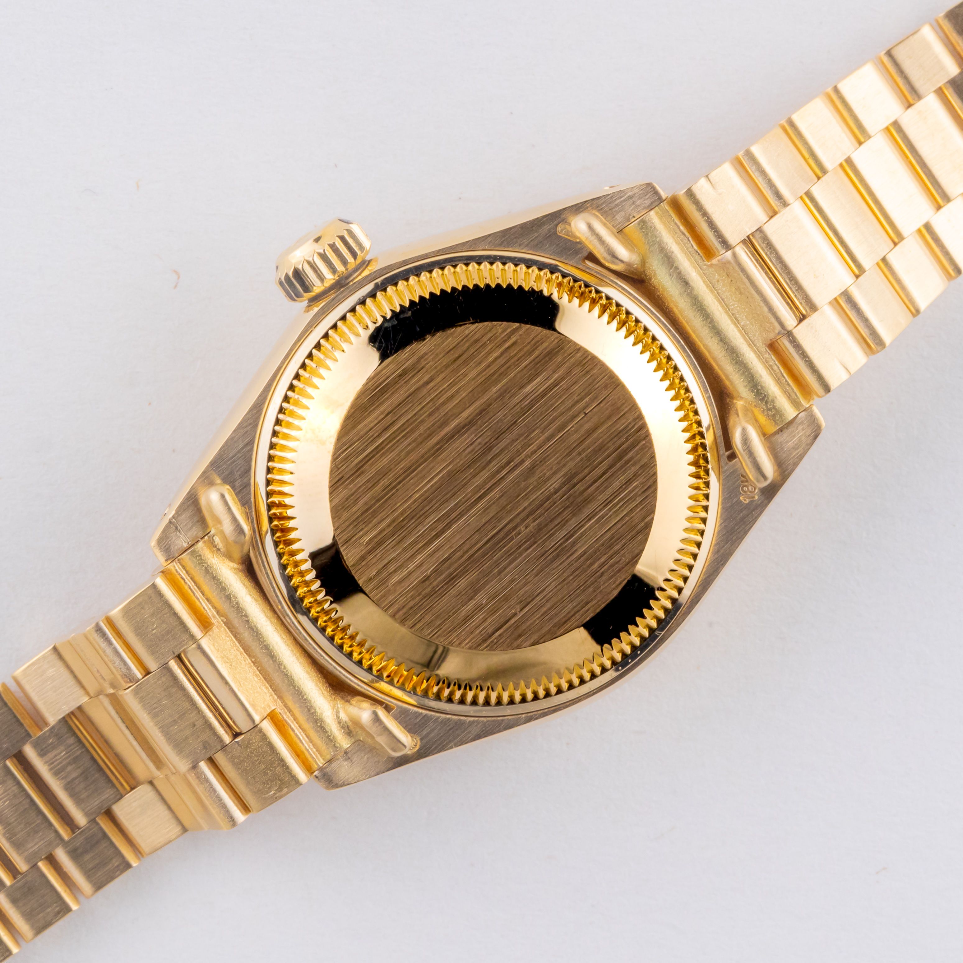 Rolex Oyster Perpetual Lady-Datejust referenza 6917/8 del 1978, completo di set originale. La Lady-Datejust 6917/8 ha una cassa in oro da 26 mm, bracciale jubilee in oro e lunetta scanalata in oro giallo 18k. Questa Lady-Datejust 6917/8 presenta un movimento automatico calibro 2035 con funzione di data rapida, vetro plexiglass e quadrante nero.