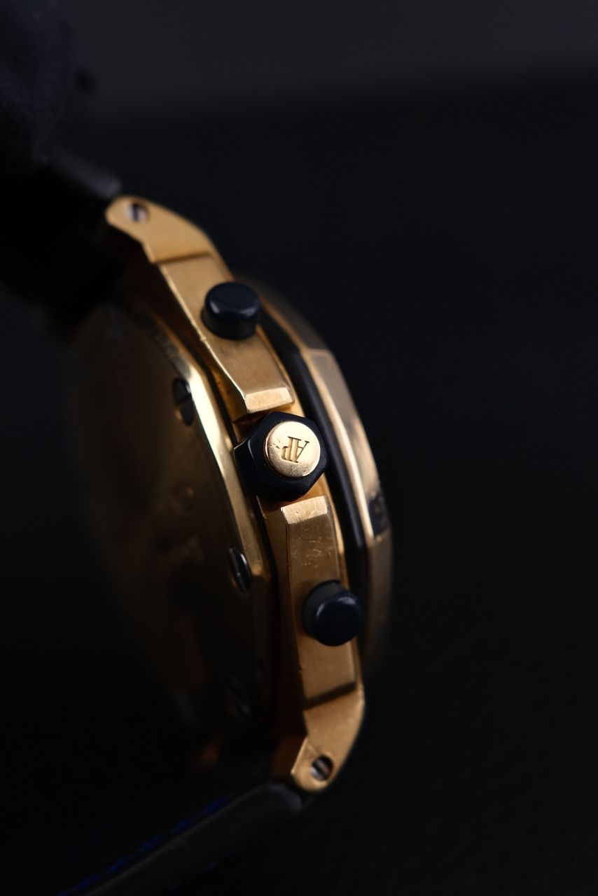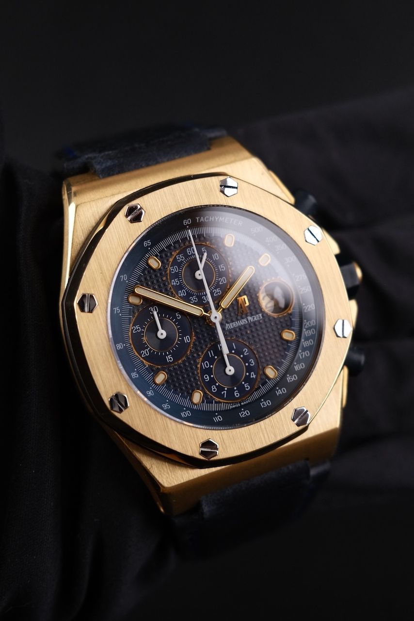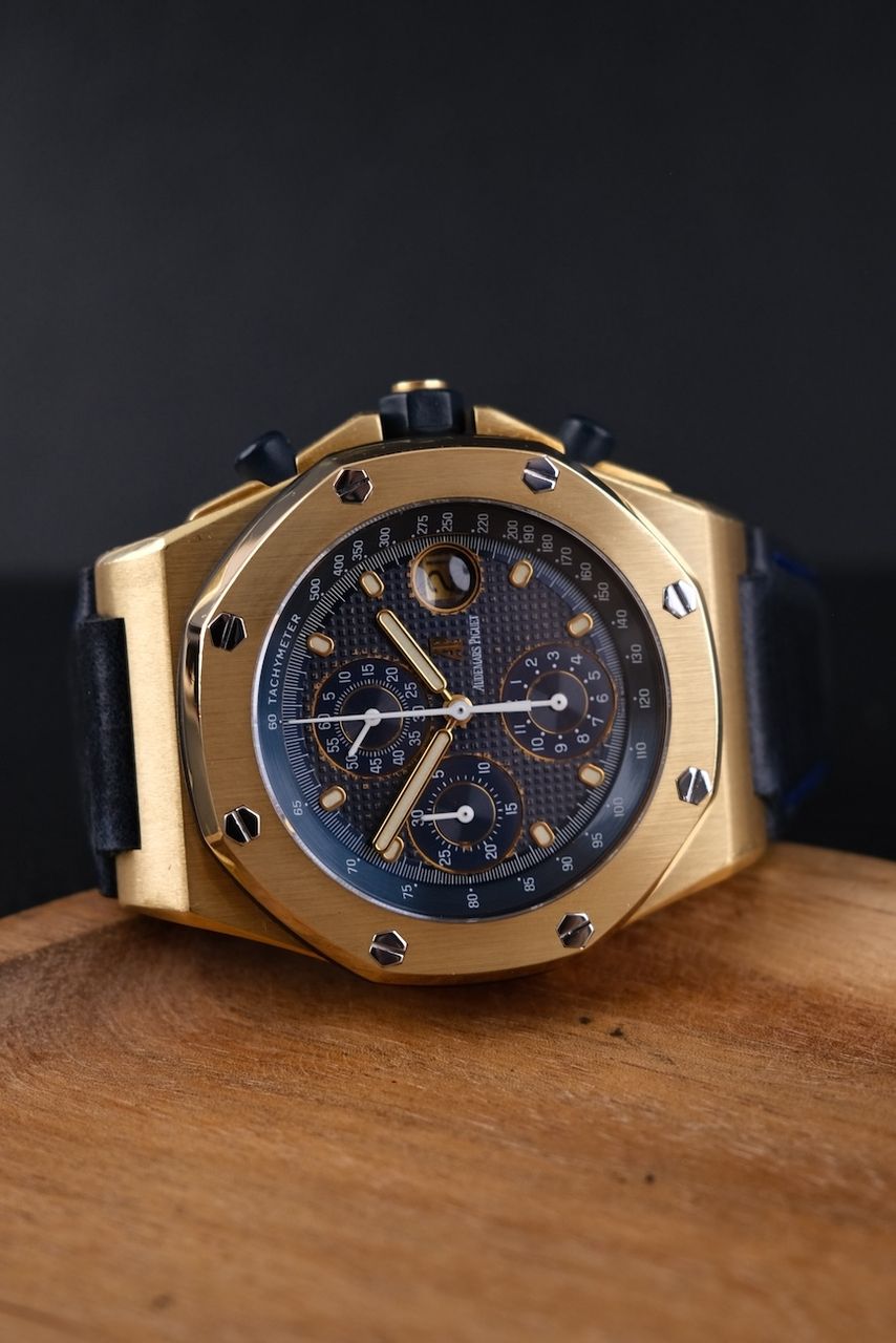 **Watch Description**Ready for your new dream watch? Perhaps this beautiful Audemars Piguet Royal Oak Offshore Chronograph made of Yellow gold will soon be on your wrist. Whether vintage or modern - with over 200 watches in stock, we always have your new luxury watch available for you immediately - whether you are a first-time buyer or your watch collection needs a new addition.