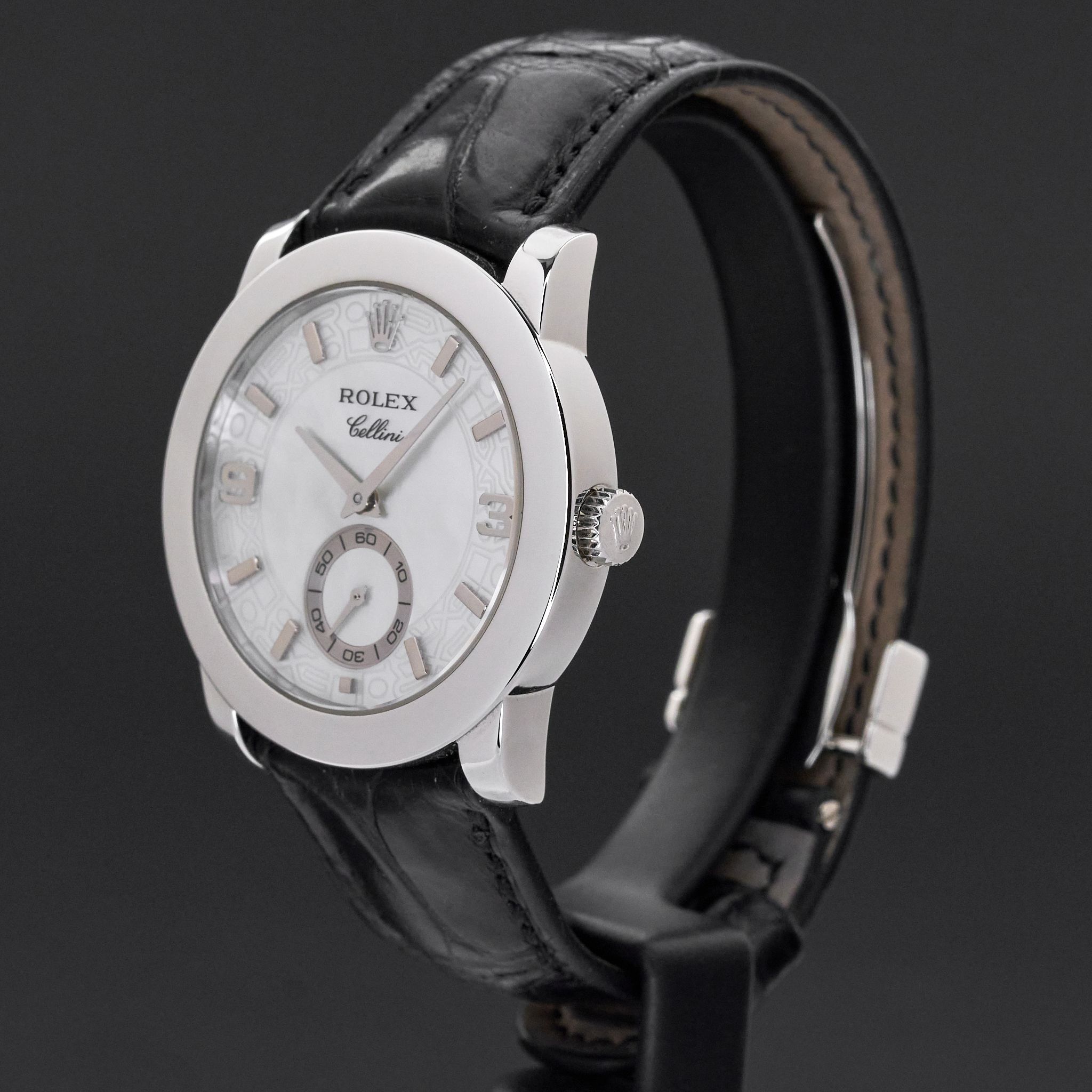 Rolex Cellini Cellinium 5240 – Mother-of-Pearl EleganceThis particular Rolex Cellini Cellinium introduced in 2001, offers a refined expression of the brand’s dress watch heritage. It's white mother-of-pearl dial displays a soft iridescence, complemented by elegant Arabic numerals that add a modern touch to the classic design. Encased in luxurious platinum, this piece reflects quiet prestige and exceptional craftsmanship.A rare and tasteful choice for collectors who value subtle refinement and timeless appeal.This Rolex Cellini Cellinium 5240 features a Mother of Pearl Arabic dial and is crafted from platinum, with a production year of 2001.Case No: K68XXXX