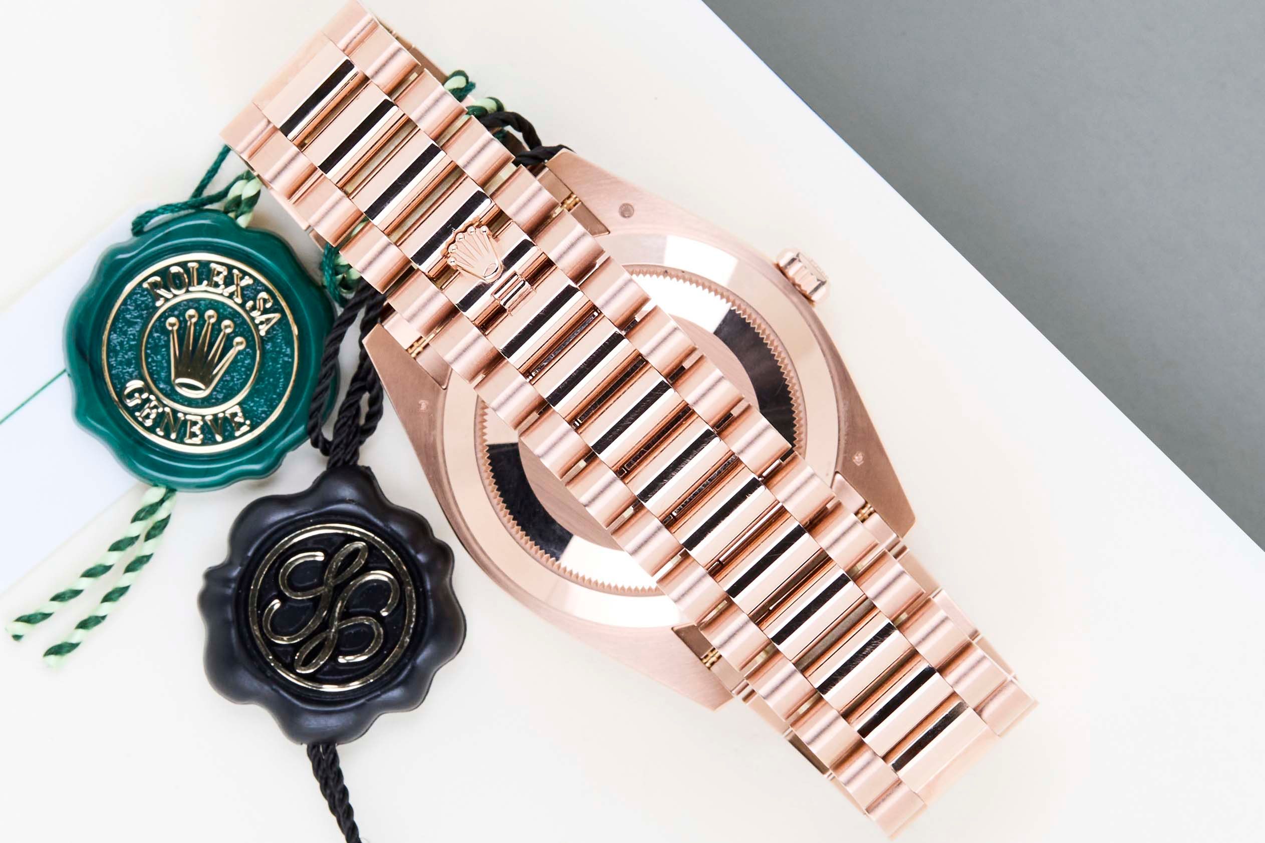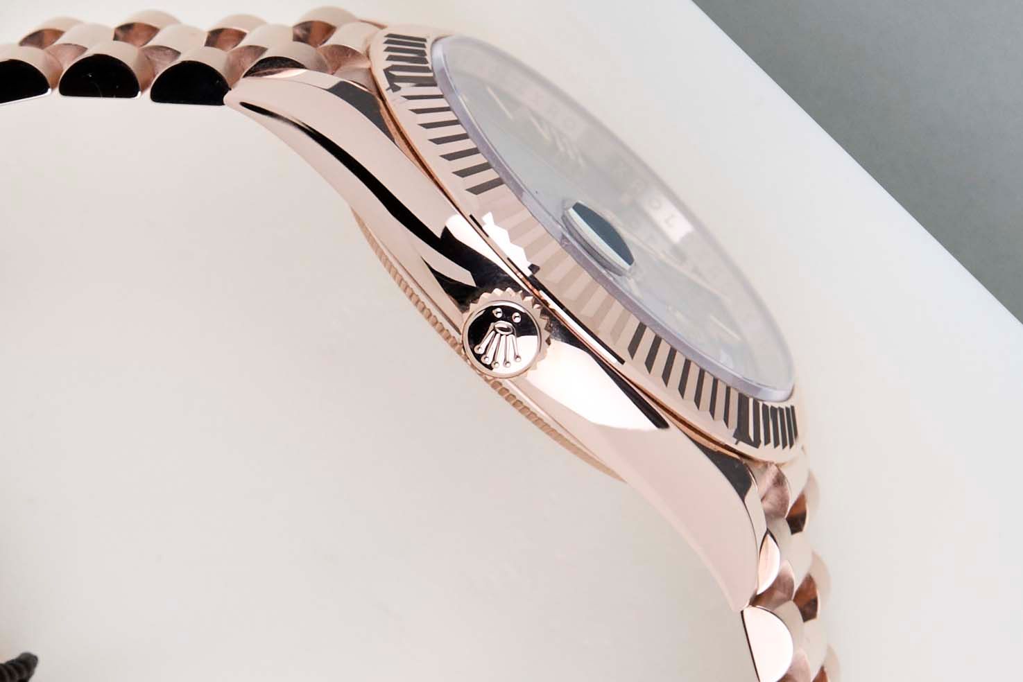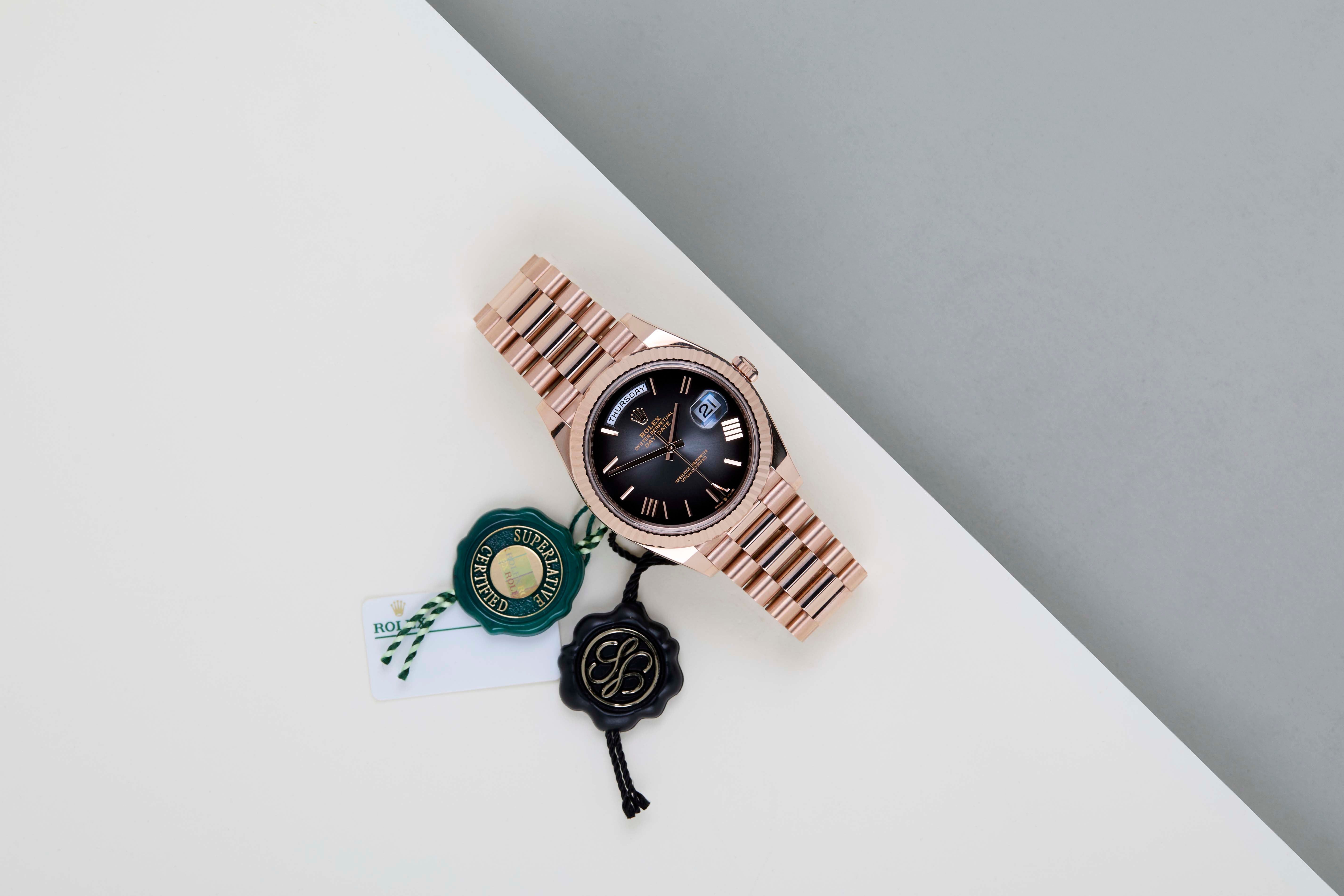 New & Unworn | Full Set | International Rolex Warranty Until June 2030 | Including Rolex White TagThe Day-Date was originally designed to be a precious instrument for everyday use. Thanks to a watchmaking prowess that was unprecedented at the time. The Day-Date was the first self-winding, waterproof chronometer wristwatch to display, in addition to the date, the day of the week spelt out in full, in two separate windows. Both change simultaneously at midnight.The Day-Date is a Prefect balance between elegance and technical excellence. Instantly recognizable, its unique design has forged its identity, as the Day-Date is only produced in the precious metals; Yellow Gold, White Gold, Everose Gold and Platinum.At its launch in 1956, the Day-Date was the only watch with a semi-circular window at 12 o’clock displaying the day of the week spelt out in full. With its specially-designed President bracelet available only in precious metal.The days on the Day-Date are written differently depending on the language. Using most writing systems as Latin, Arabic, Cyrillic, Hebrew, Japanese, Chinese ideograms and even the Ge'ez alphasyllabary. This example has an English Day-wheel.This particular example, the Rolex Day-Date 40 'Ombre Oscar Dial – Everose', was first sold in June 2025. Crafted from solid 18k Everose Gold, it is fitted with the signature President bracelet with concealed Crownclasp, ensuring both comfort and refinement on the wrist. Offered in New & Unworn condition, the watch comes as a full set with the original Rolex box, warranty card, and white Rolex tag. Furthermore, the watch still has Worldwide Rolex Warranty until June 2030.