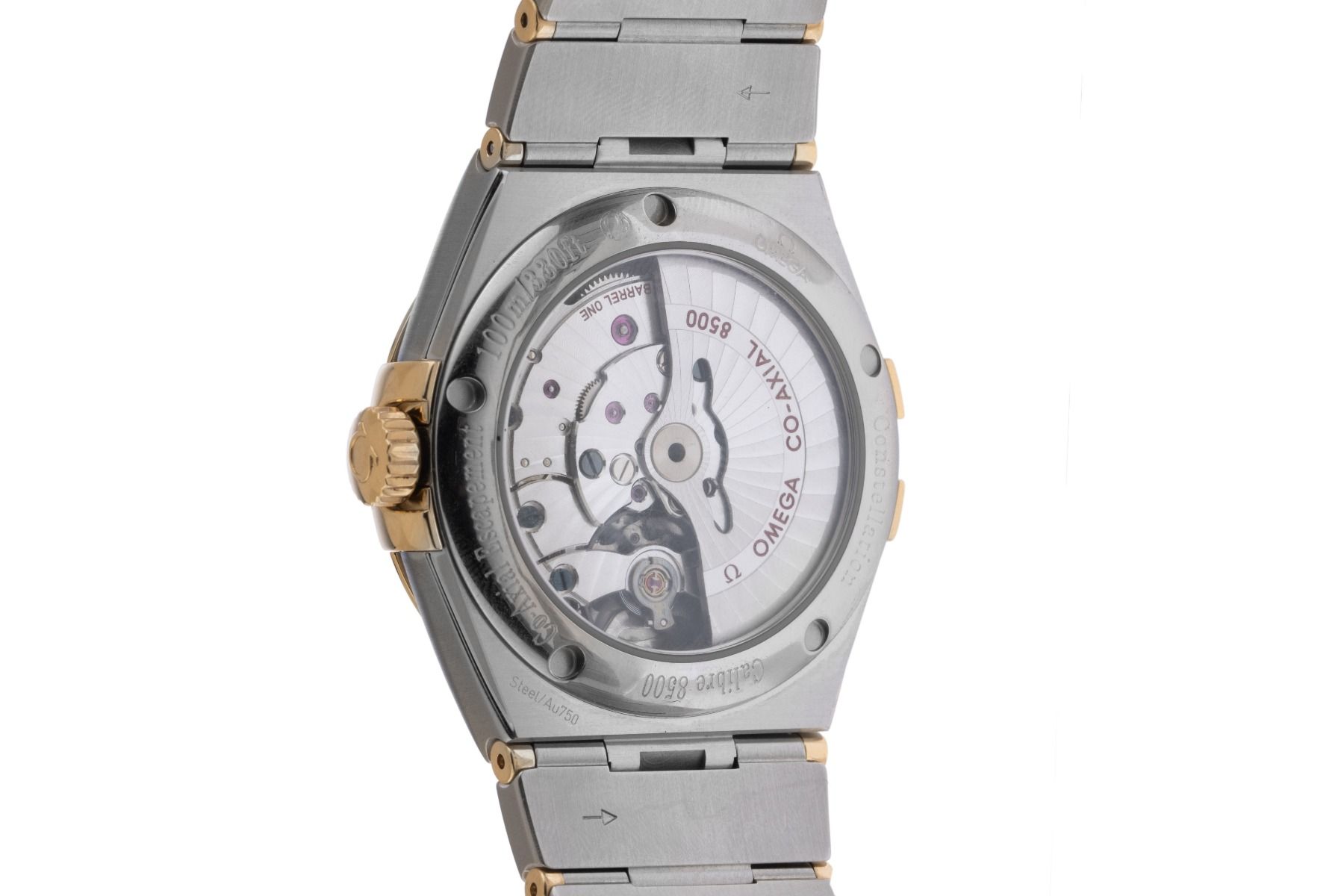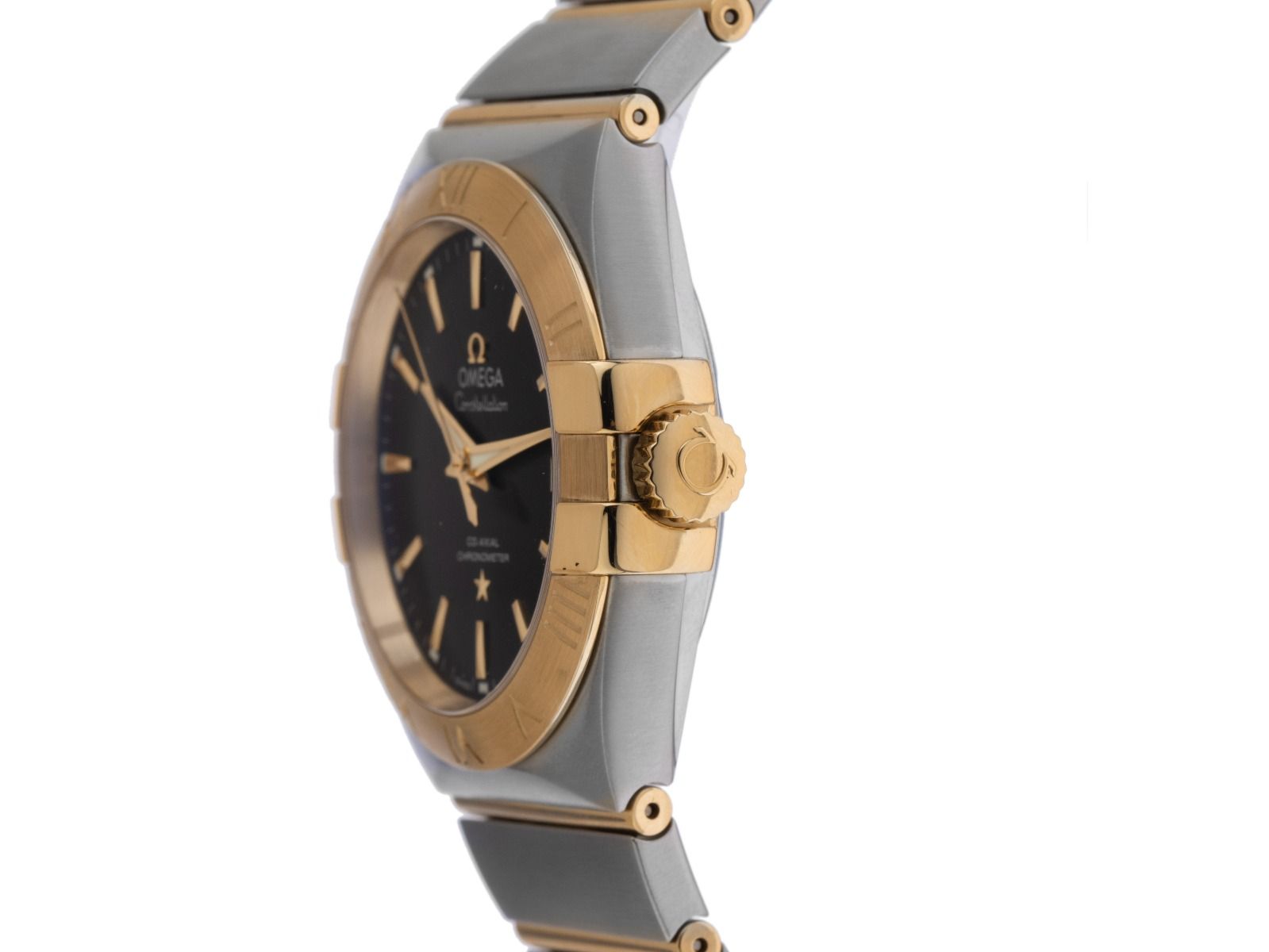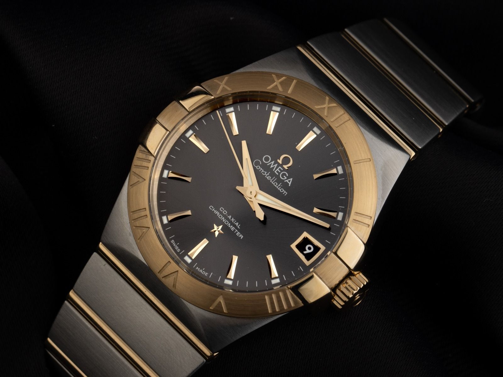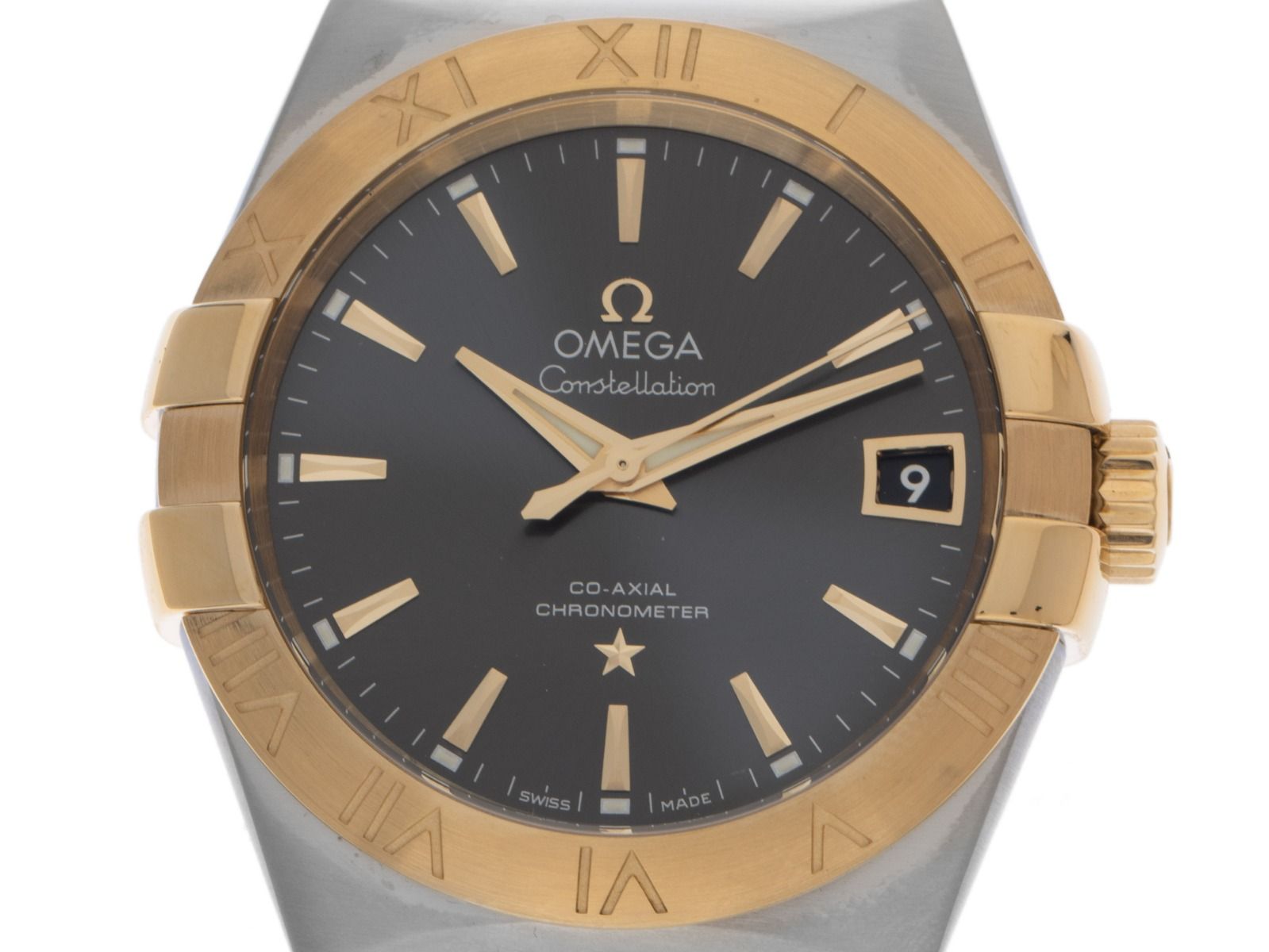 Omega Constellation Co-Axial Stahl 18kt Gelbgold Automatik Armband Stahl 18kt GelbgoldGehäuse Edelstahl poliert und satiniert, Gehäusedurchmesser ohne Krone 38mm, Gehäusehöhe 12,7mm. Lünette 18kt Gelbgold mit römischen 12 Stunden Skala graviert, poliert und satiniert. Armband 18kt Gelbgold / Edelstahl poliert und satiniert, Doppelsicherheitsfaltschließe Edelstahl mit Hersteller-Logo. Zifferblatt grau mit aufgesetzten gelbgoldenen Indexen und gelbgoldene Zeigern. Uhrwerk Automatik, Kaliber Co-Axial Omega 8500 mit 39 Edelsteinen. Anzeige von Stunde, Minute und Sekunde über Zeiger aus der Mitte mit Sekundenstopp zur Sekundengenauen Einstellung der Uhrzeit, Datumsanzeige mit Schnellverstellung bei 3 Uhr. Saphirglas kratzfest, gewölbt und entspiegelt. Krone mit Hersteller-Logo. Boden Edelstahl verschraubt mit Saphirglas Sichtfenster graviert. Gewicht der Uhr inklusive Armband 170g, Länge des Armbandes inklusive Gehäuse 180mm. Referenznummer: 123.20.38.21.06.001, Gehäusenummer: 87248XXX, ID: P151454000925H-7200. Artikelnummer: 10000082284. Mit Gangkontrolle und kompletter äußerlicher Aufarbeitung von September 2025. Original Omega Box und Garantie Papiere von März 2016 sowie Beschreibung und Watchregister Auszug von September 2025, The Watch Register Zertifikat / ohne Eintrag (Internationale Datenbank für verlorene oder gestohlene Uhren), Full Set. Wie Neu. Lieferzeit sofort.