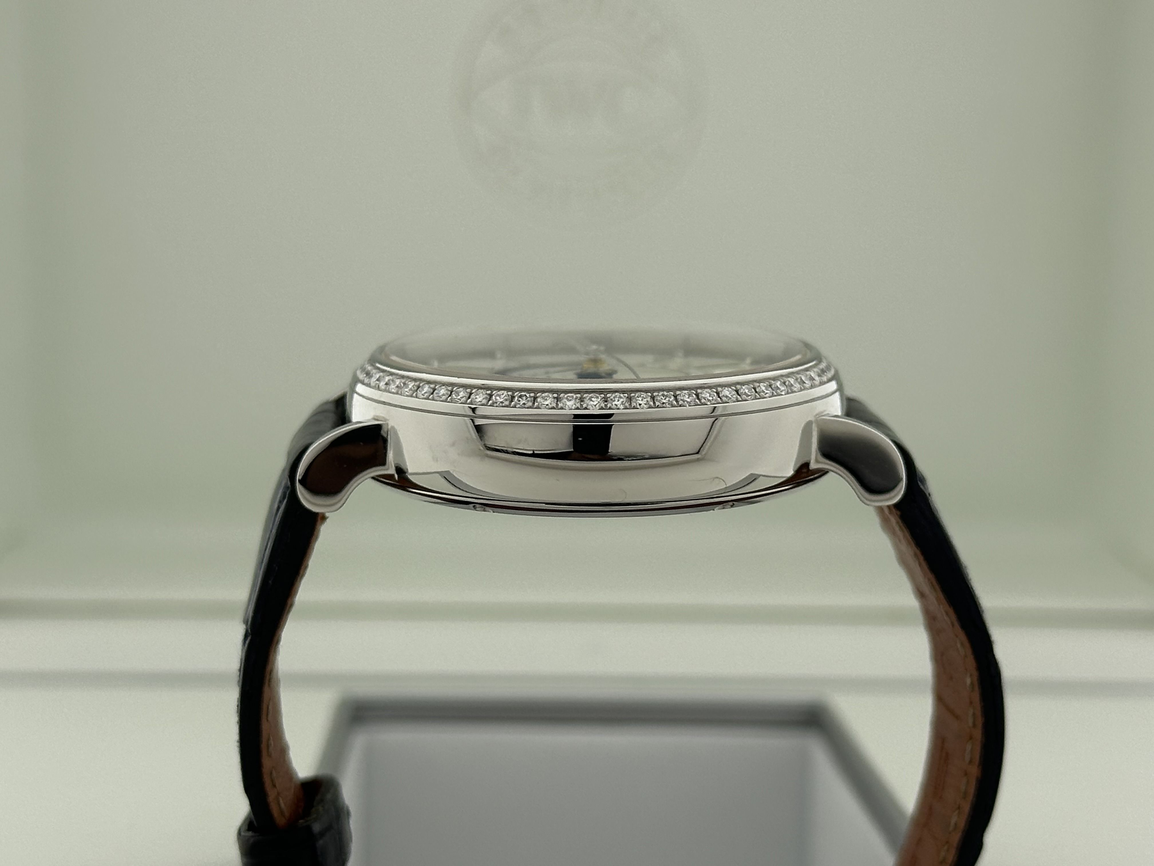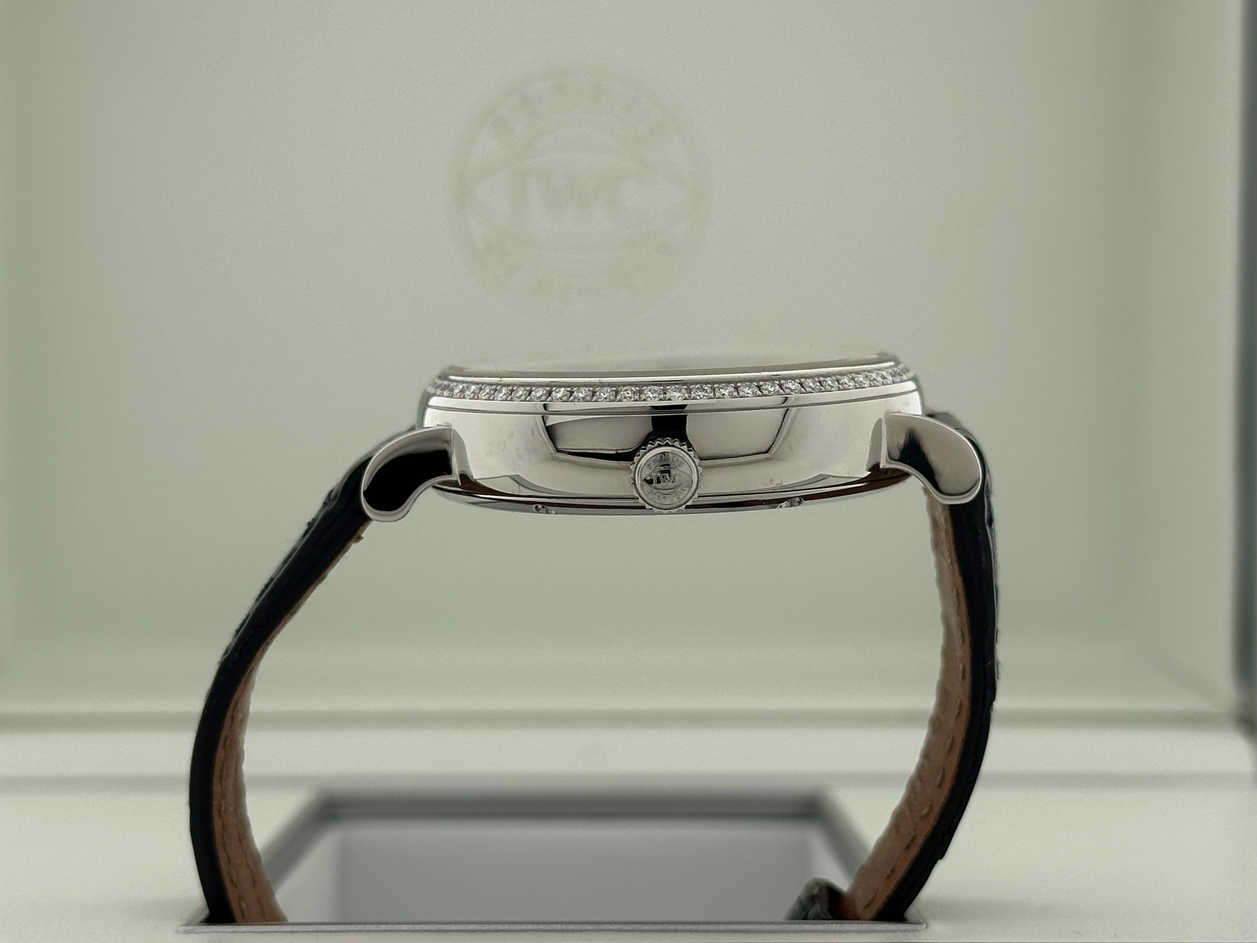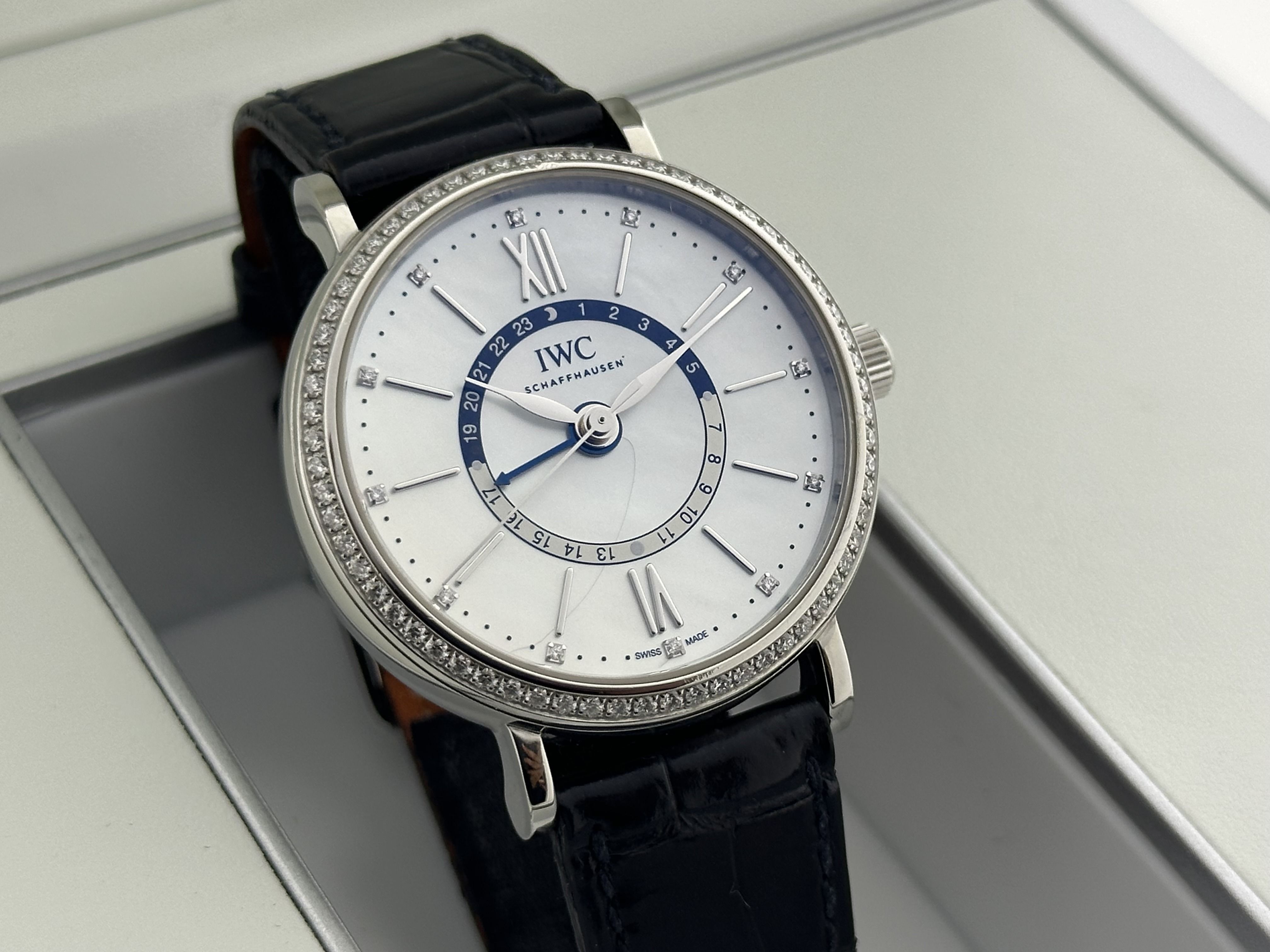 Un orologio IWC Portofino Automatic Day & Night, ref. IW459101, set completo. L'orologio ha una cassa in acciaio da 38 mm, un cinturino in pelle di alligatore blu Santoni e una fibbia in acciaio. L'orologio ha 78 diamanti taglio brillante, in tot. 0,64crt., 12 sono incastonati nel quadrante come indici e 66 sulla lunetta. L'orologio ha un quadrante in madreperla (MoP) con numeri romani e indicazione delle 24 ore. L'orologio viene fornito con la sua scatola originale, il certificato e i libretti. L'IWC è stato revisionato di recente. Nota: l'orologio presenta un graffio sul MoP, vedi foto.