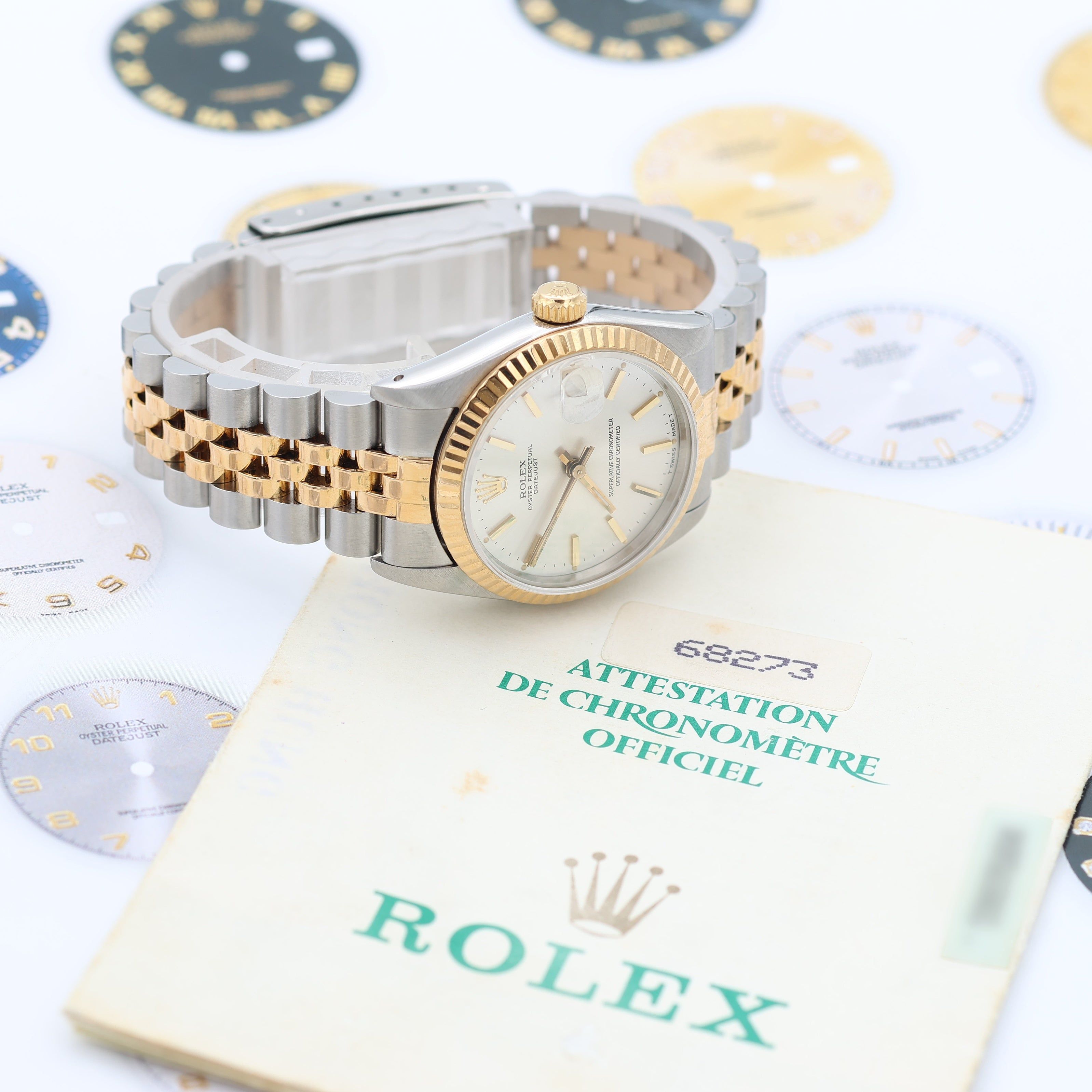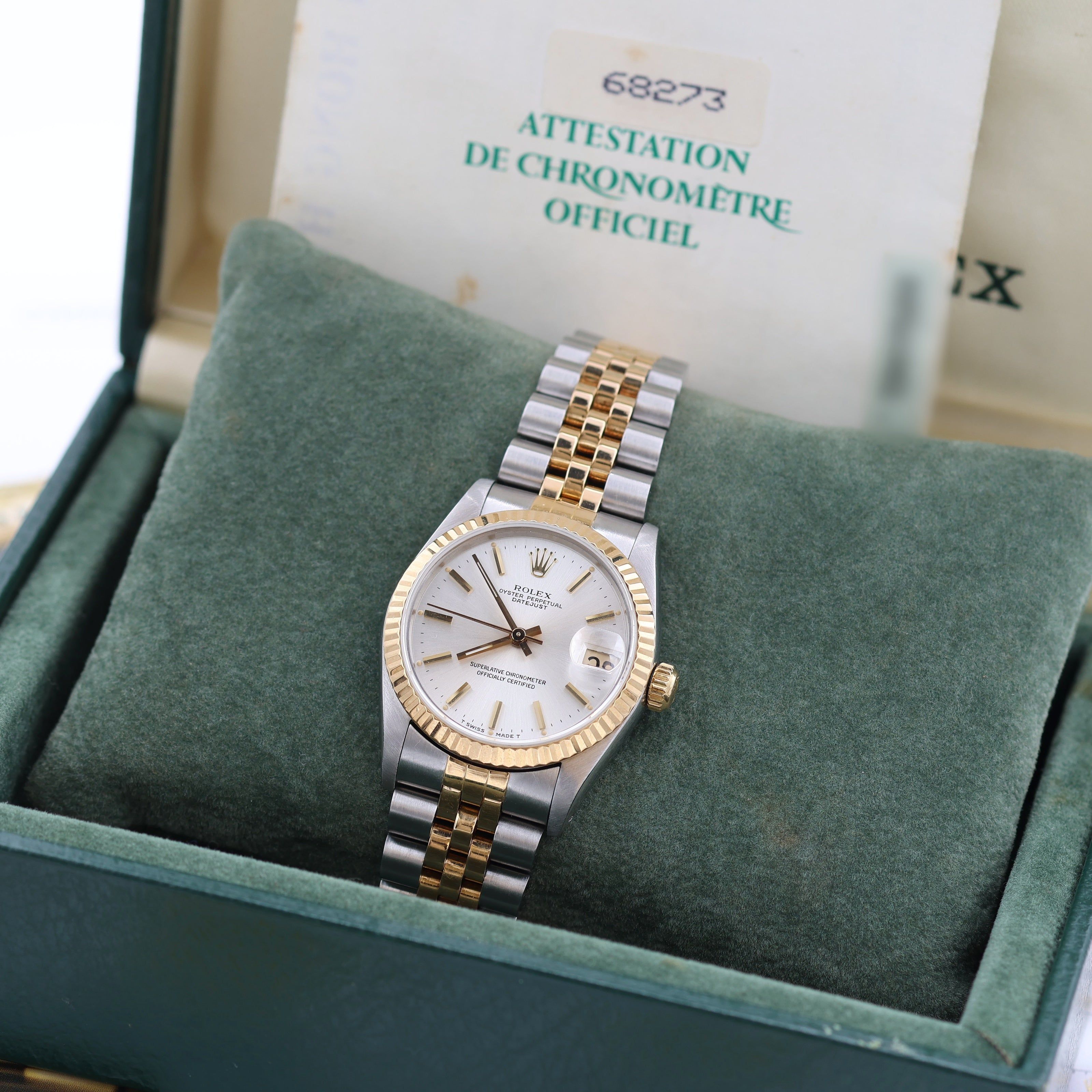 For sale a pre-owned Rolex Oyster Perpetual Datejust reference 68273 watch in steel and yellow gold, full set.This elegant Rolex features a steel and yellow gold Jubilee bracelet, a matching case in stainless steel, and a yellow gold fluted bezel. The time is displayed on a classic silver dial with golden indexes. This luxury watch is presents a classic Datejust style with a fluted bezel, a self-winding Perpetual movement, and the iconic 5-point Rolex logo coronet prominently displayed at the 12-hour marker. The mid-size Datejust will appeal to men and women alike: we can consider it ad a unisex Rolex since it offers a larger size and weight for women and a smaller size for men. BRAND ROLEX MODEL DATEJUST 31 REFERENCE 68273 CASE MATERIAL STEEL/GOLD MOVEMENT AUTOMATIC DIMENSION 31 MM DIAL SILVER CRYSTAL SAPPHIRE BRACELET TYPE JUBILEE BRACELET MATERIAL STEEL/YELLOW GOLD ORIGINAL BOX YES ORIGINAL PAPERS YES YEAR APPROX. THE '90s CONDITION VERY GOOD