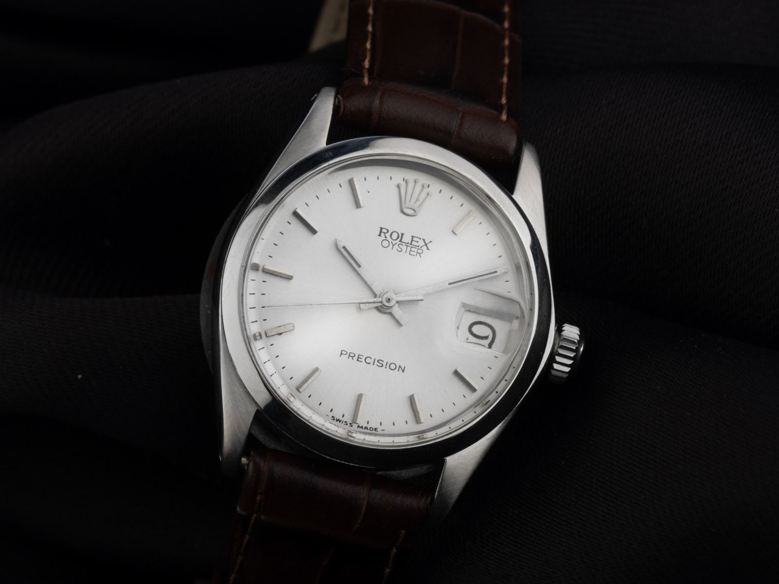 Rolex Oysterdate Precision open 6/9 Stahl Handaufzug Armband KrokolederGehäuse Edelstahl poliert und satiniert, Gehäusedurchmesser ohne Krone 31mm, Gehäusehöhe 11,2mm. Lünette Edelstahl glatt und poliert. Armband Krokoleder braun mit heller Ziernaht, Anstoßbreite 16mm, Stiftschließe Edelstahl mit Hersteller-Logo. Zifferblatt silberfarben mit aufgesetzten weißgoldenen Indexen und weißgoldenen Zeigern, leicht patiniert. Uhrwerk Handaufzug, Rolex Manufakturkaliber 1225 mit 17 Edelsteinen. Anzeige von Stunde, Minute und Sekunde über Zeiger aus der Mitte, Datumsanzeige unter Glaslupe bei 3 Uhr, open 6/9 (offene 6 und 9 in der Datumsanzeige). Plexiglas. Krone verschraubbar mit Hersteller-Logo. Boden Edelstahl verschraubt. Gewicht der Uhr inklusive Armband 35g. Referenznummer: 6466, Gehäusenummer: 3685XXX, Baujahr: 1973, ID: P153246200925H-5700, Artikelnummer: 10000082312. Mit Gangkontrolle und kompletter äußerlicher Aufarbeitung von September 2025. Original Rolex Box mit Umkarton und Ledermäppchen, Übersetzungsheft, Rolex Chronometer-Siegel, Tag sowie Watchregister Auszug von September 2025, The Watch Register Zertifikat / ohne Eintrag (Internationale Datenbank für verlorene oder gestohlene Uhren). Superschnäppchen, Kapitalanlage mit Wertsteigerungspotential, sehr seltenes Sammlerstück, Sehr guter Zustand. Lieferzeit sofort.