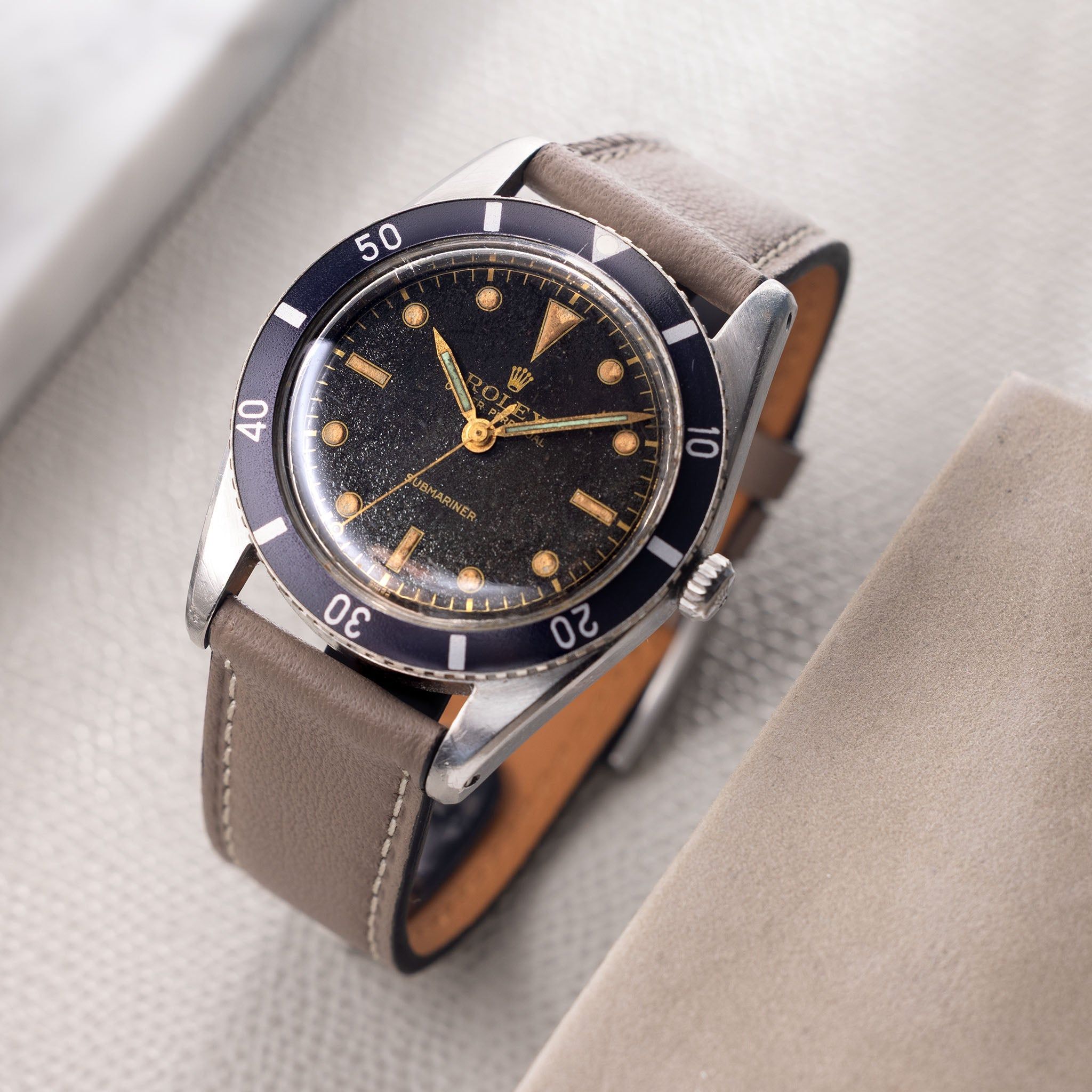 The 1950s proved to be a defining era for Rolex, highlighted by the introduction of some of its most legendary models: the Submariner, GMT-Master, Day-Date, and Explorer lines. As scuba diving gained traction among adventurers and professionals alike, Rolex recognized the growing demand for a dependable dive watch to help monitor time spent underwater and reduce the risk of decompression sickness, also known as “the bends.” There was also a need for a reliable timing device to track the remaining “breathing time.” This vision culminated in the creation of the Submariner—a timepiece that would come to represent not only technical excellence and rugged reliability but also timeless design. The Rolex Submariner reference 6205 was introduced in 1954 as one of the earliest Submariner models, alongside references 6204 and 6200. The 6205 was produced for only about a year, making it a rare and highly sought-after collector's item. As Rolex themselves put it in the book Oyster Perpetual Submariner: The Watch That Unlocked the Deep, just 810 examples were produced. To put that in perspective: approximately 2,800 reference 6538 "Big Crown" Submariners were made. A signficant innovation of the 6205 was the introduction of the "Submariner" name on the dial, a feature that has remained on all subsequent Submariner models, so maybe we can conclude this is the “real “first Submariner! The “ no depth rating “ dial is still in nice condition, with the original pencil and “lollipop” seconds hands present. Although the hands have been re-lumed in the pas they still look charming. The 37.5 mm “small crown “ case stays in nice condition .The so-called “no-hash” bezel insert remains on the watch in unmolested condition, though we believe the bezel itself is a later replacement and has been paired with one of our leather straps. This super early “Neanderthaler” Sub has been fully serviced by our watchmaker and is ready to join a Submariner-themed collection. We've enjoyed this watch for some time, and it has truly grown on us. Get in touch. Specifications: Rolex Reference 6205 Submariner 37.5 mm steel case “small crown - no crown-guards” “No -hash“ bezel insert Serial 988xxx dating to 1955 Swiss only dial , “Submariner“ no depth Pencil hands , with “lollipop“ second hand - relumed Coming on the photographed Bulang and sons strap Fully serviced by our watchmaker One-year mechanical warranty Free worldwide Fedex Priority shipping