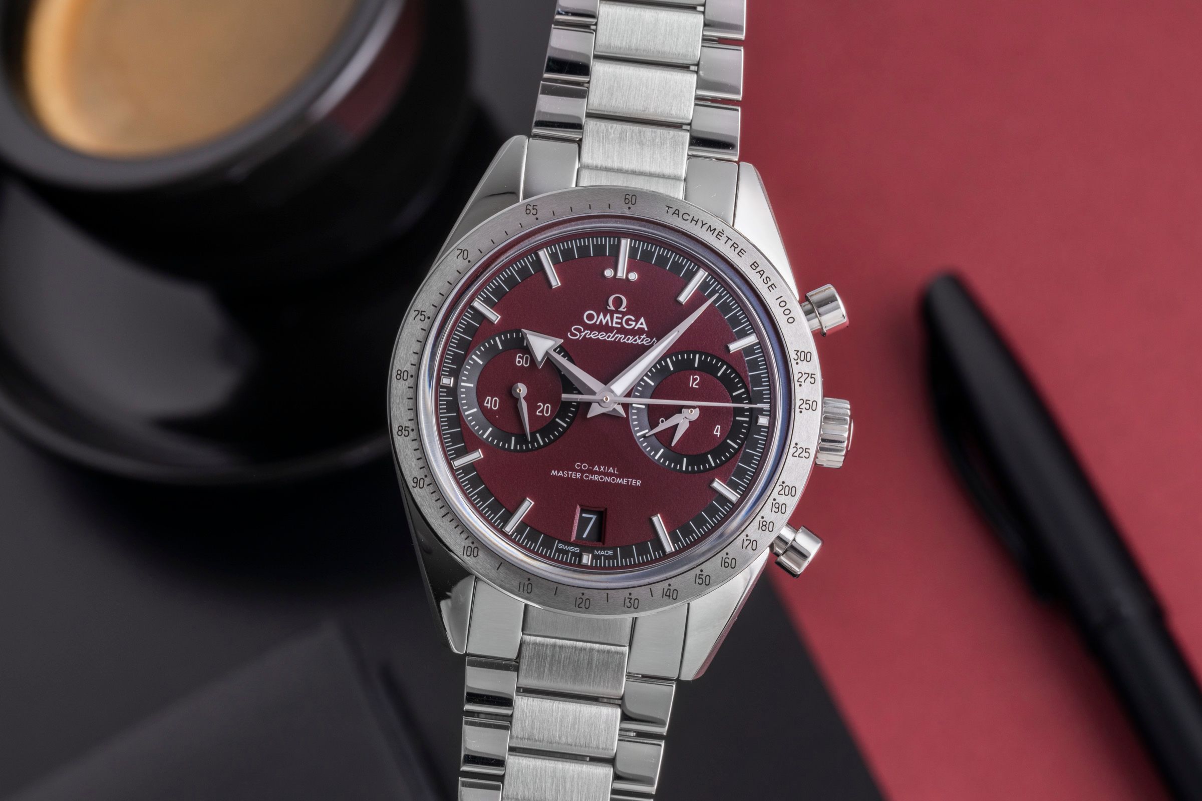 Alternative title: Omega 332.10.41.51.11.001 Speedmaster 57 Master Chronometer 40.5 Stainless Steel / Red / Bracelet; Omega Speedmaster ´57 Chronograph Handaufzug 332.10.41.51.11.001 NP: 10300,- € [2505235]