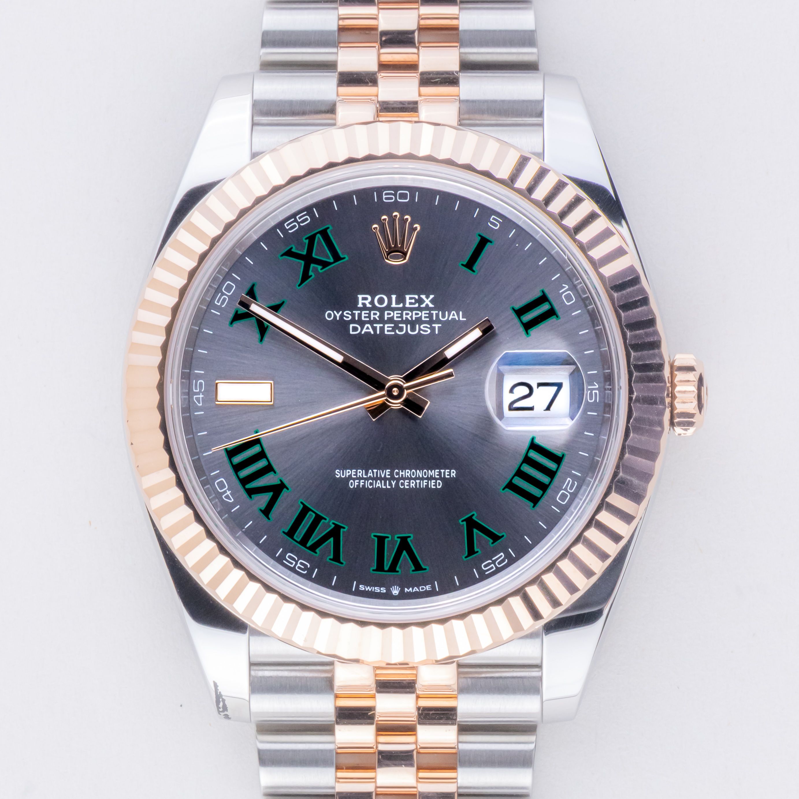 Rolex Oyster Perpetual Datejust riferimento 126331 del 2025, completo di set. Il Datejust 126331 ha una cassa in acciaio inossidabile da 41 mm, un bracciale Jubilee in acciaio inossidabile/oro rosa con chiusura Oyster e una lunetta scanalata in oro rosa. Questo Datejust 126331 presenta un movimento automatico calibro 3235 con funzione di data rapida, vetro zaffiro resistente ai graffi e un quadrante Wimbledon con indici romani.